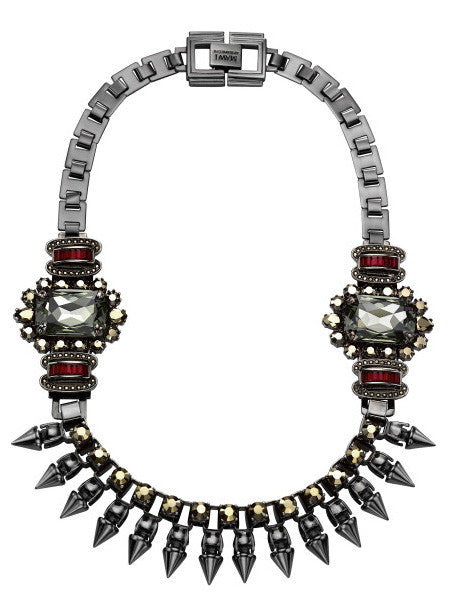 Hematite plated claw set necklace with smoky grey twin gemstones and dark red and metallic light gold Swarovski crystals.