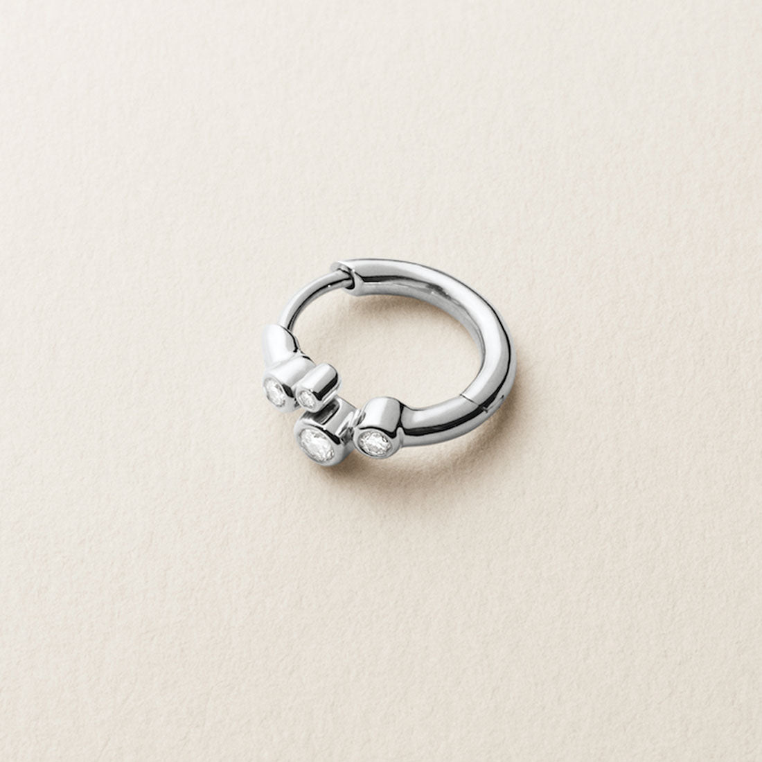 Renew your ear game with this next level huggie. A collection of four diamonds kept together in 14K white gold.