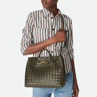 Medium Intrecciato leather top handle bag with sliding cross-body strap • Compartmented interior with one zipped pocket, two open pockets • Magnetic closure
