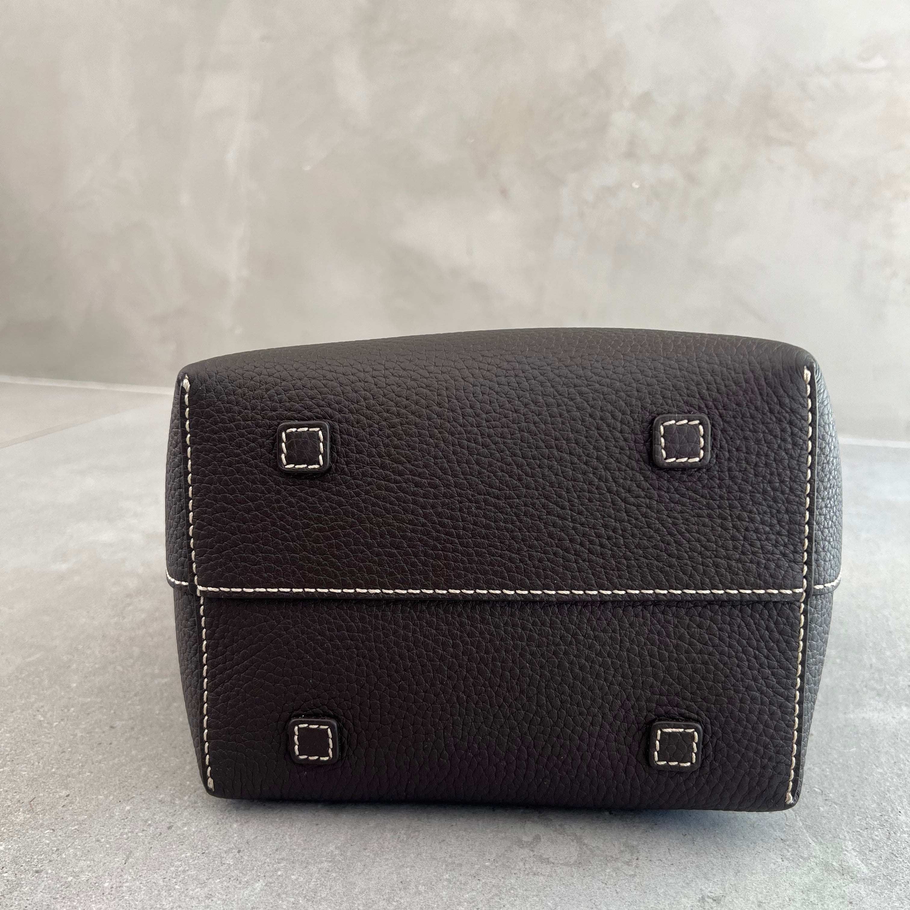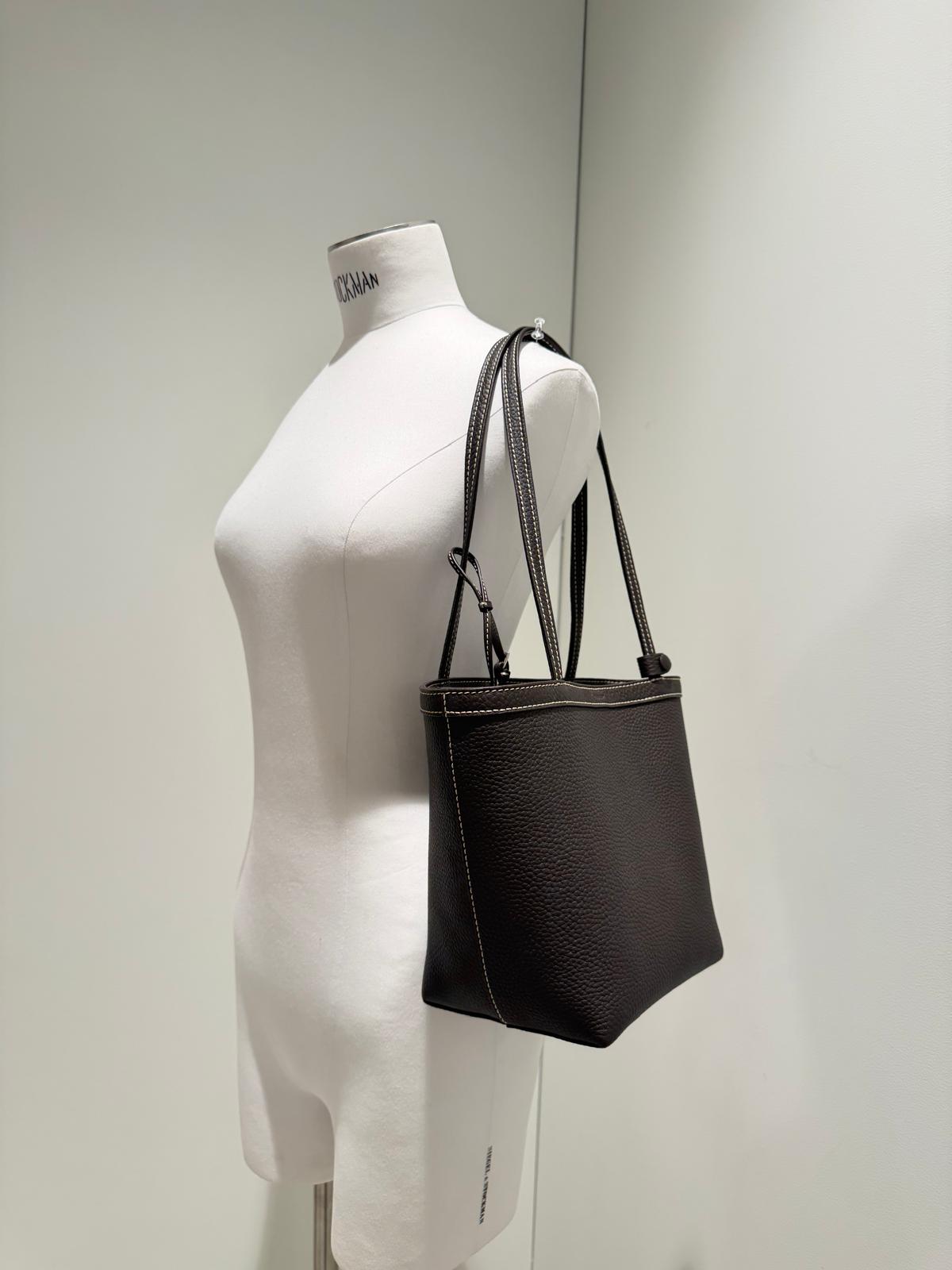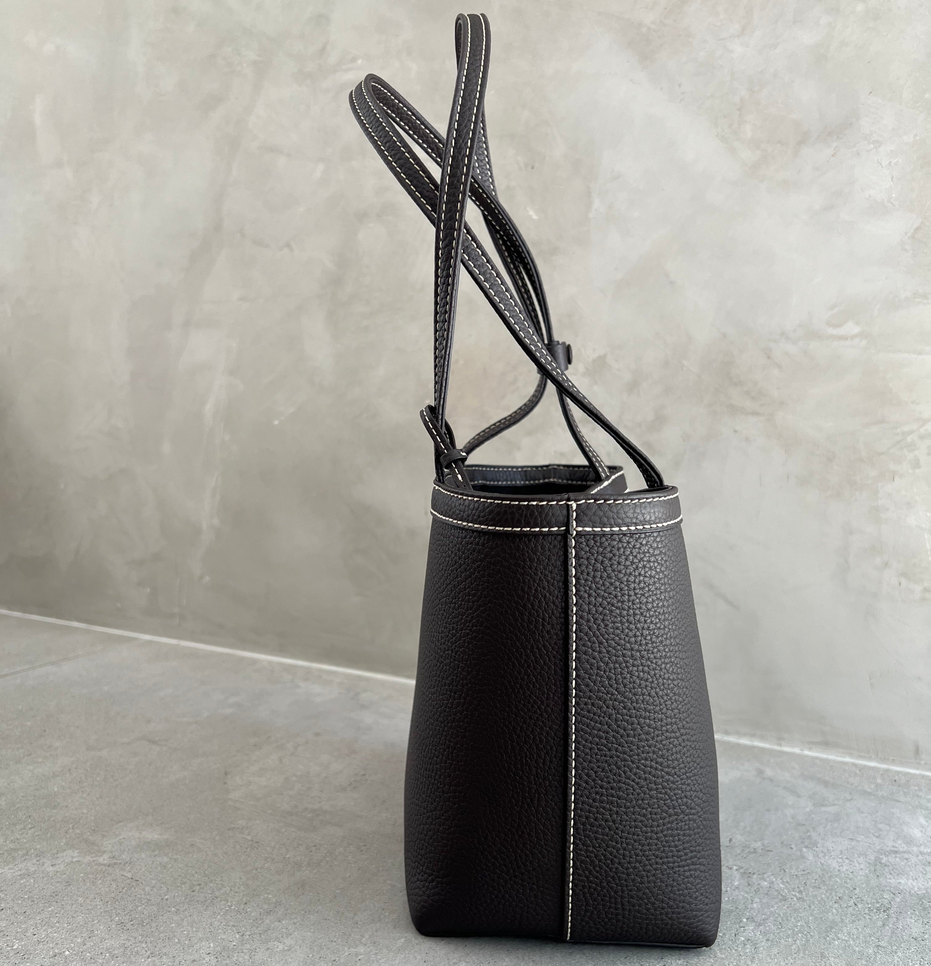 Top-handle bag in grained leather with frame construction, ergonomic silhouette, side gussets and elongated tubular handles.