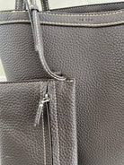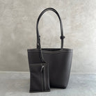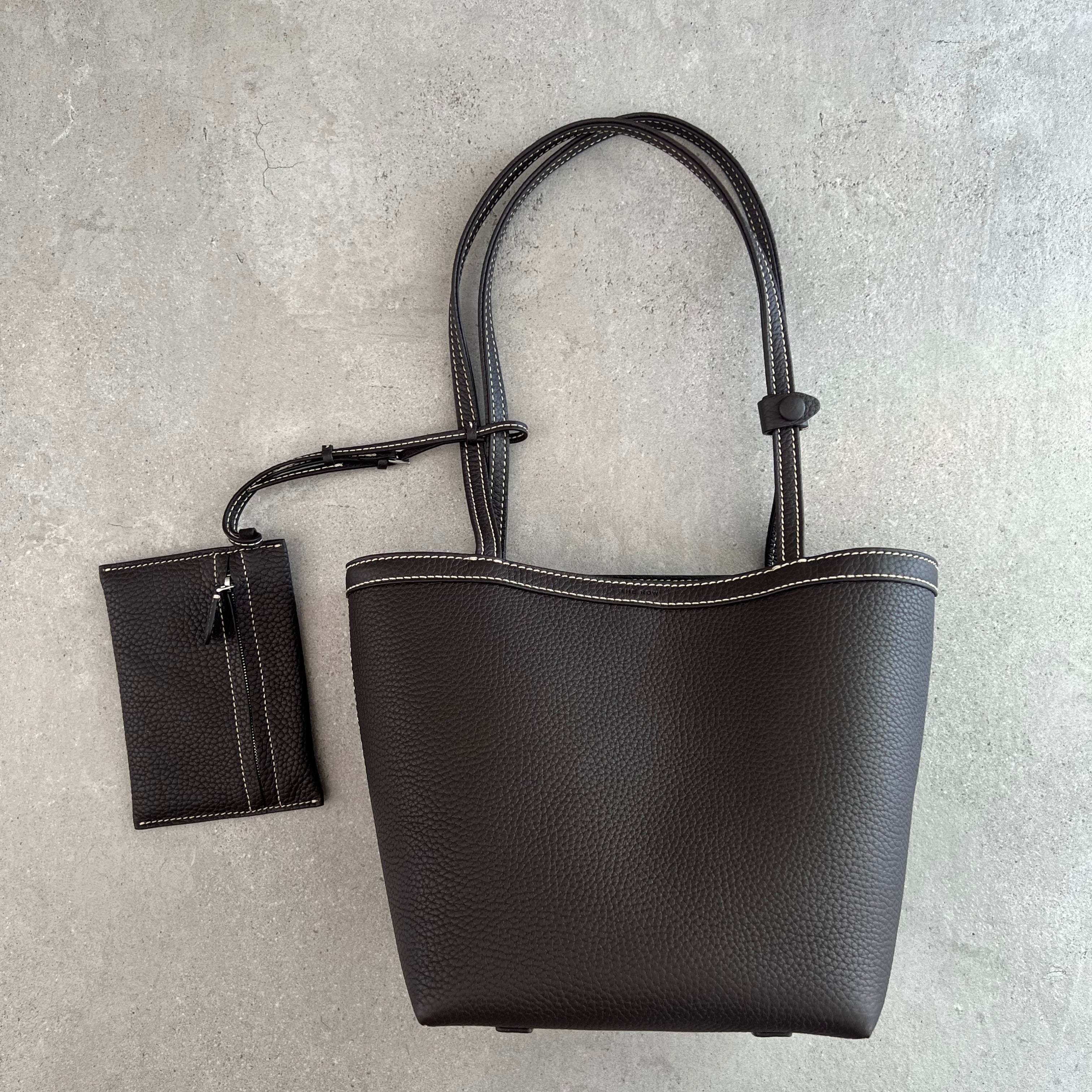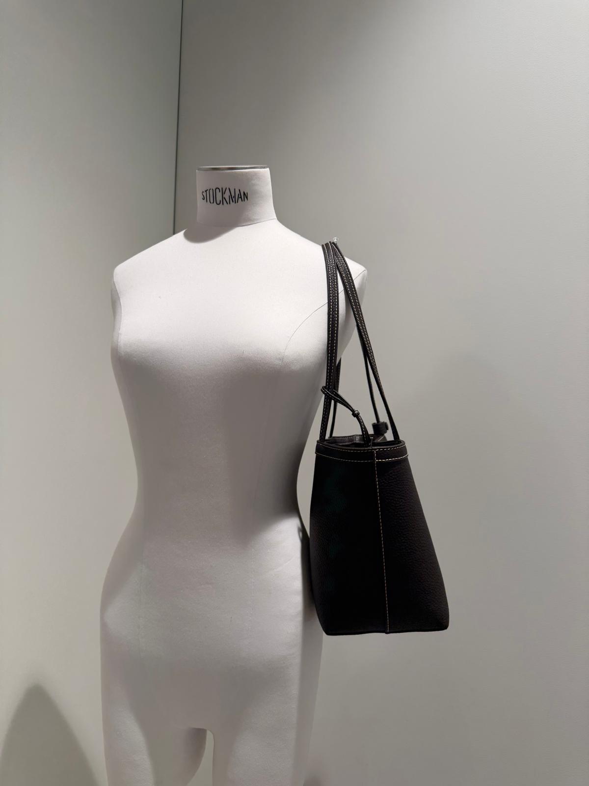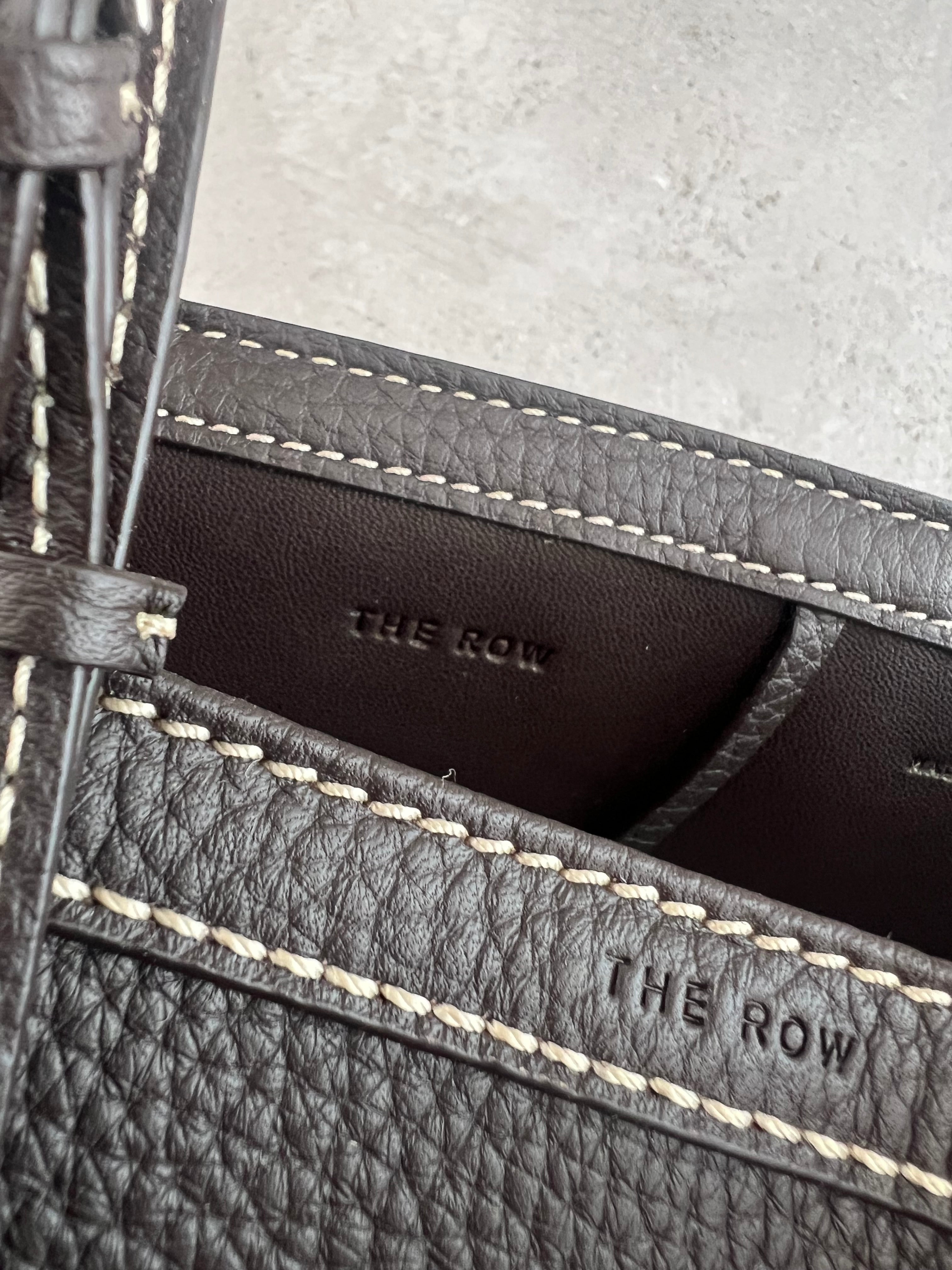 Top-handle bag in grained leather with frame construction, ergonomic silhouette, side gussets and elongated tubular handles.