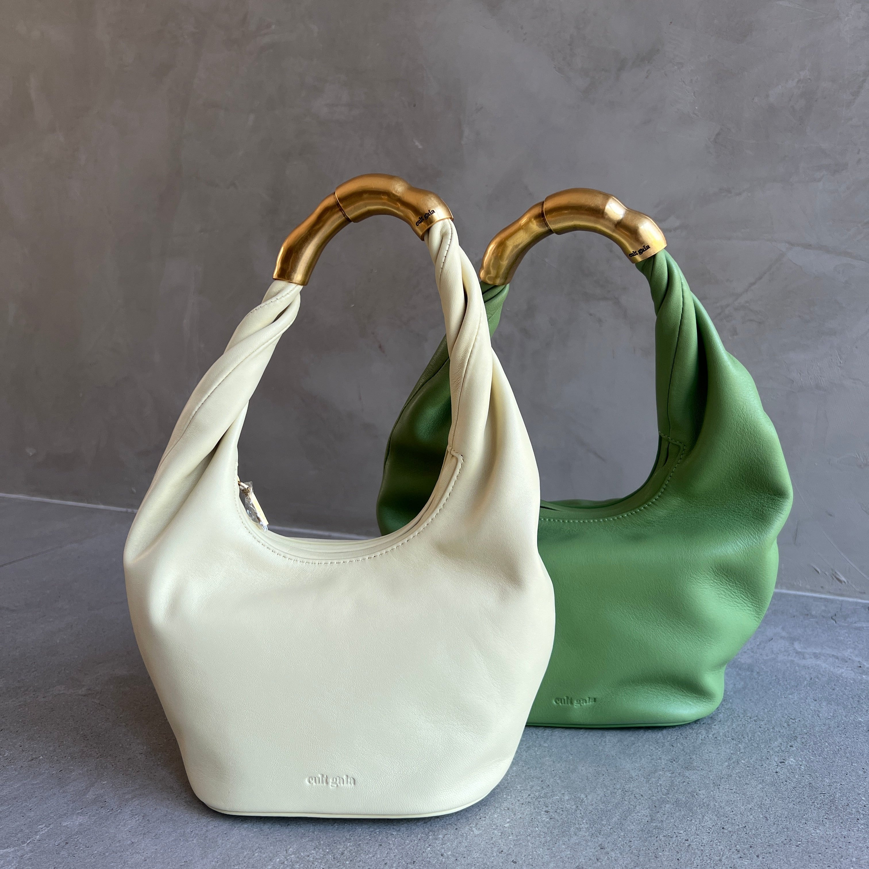 A slouchy mini bag crafted in leather with an abstract gold-toned top handle.