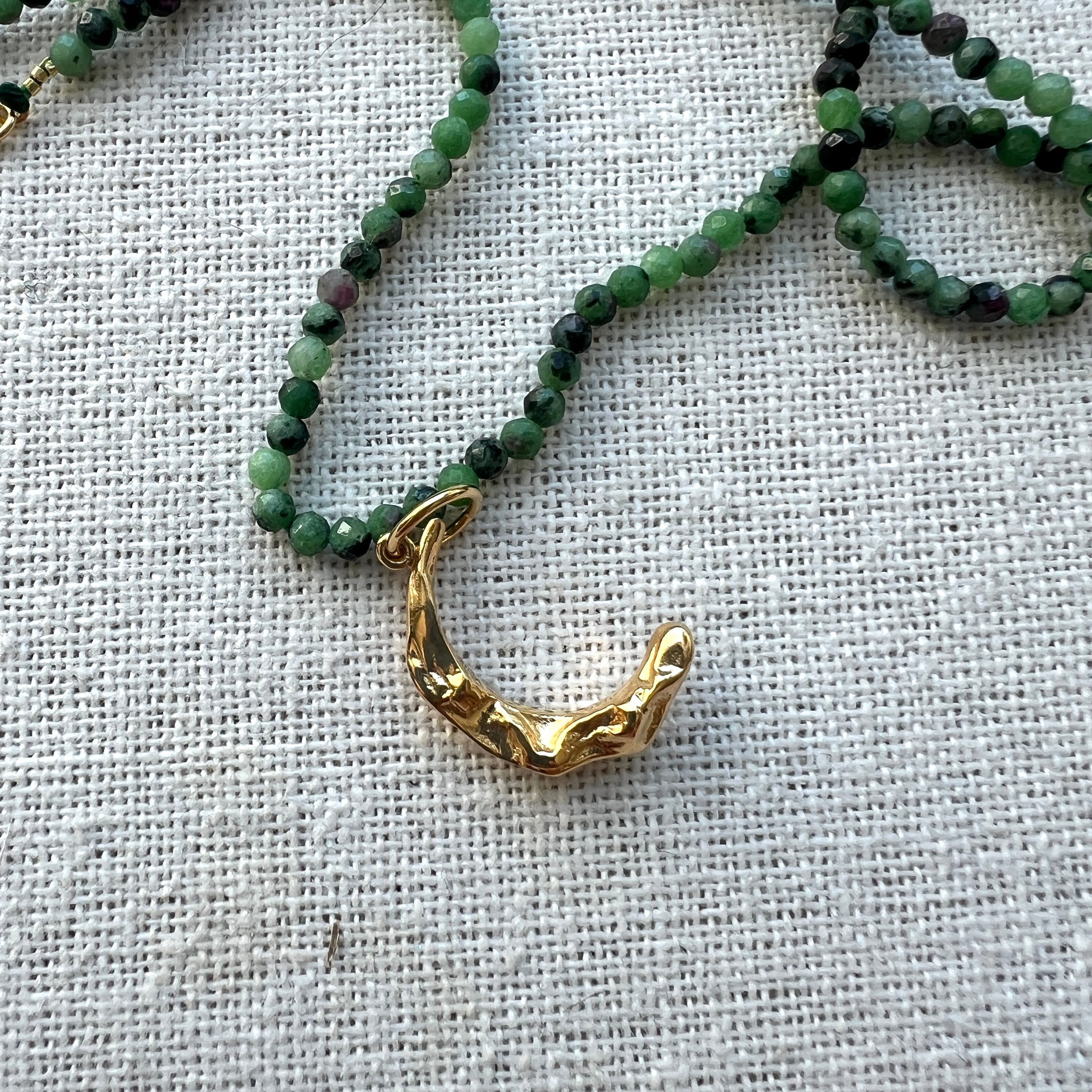 Wrinkled moons and colorful stars inspired by George Méliès who was a French illusionist and director of films involving strange and surreal journeys. A shapely 925 silver gold-plated small moon with colorful zirconia gemstones that you can match with any of our thin chains.