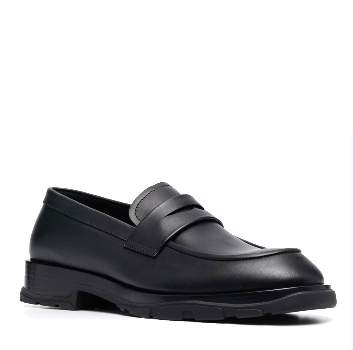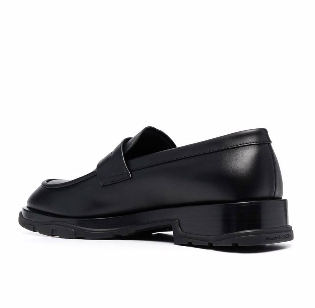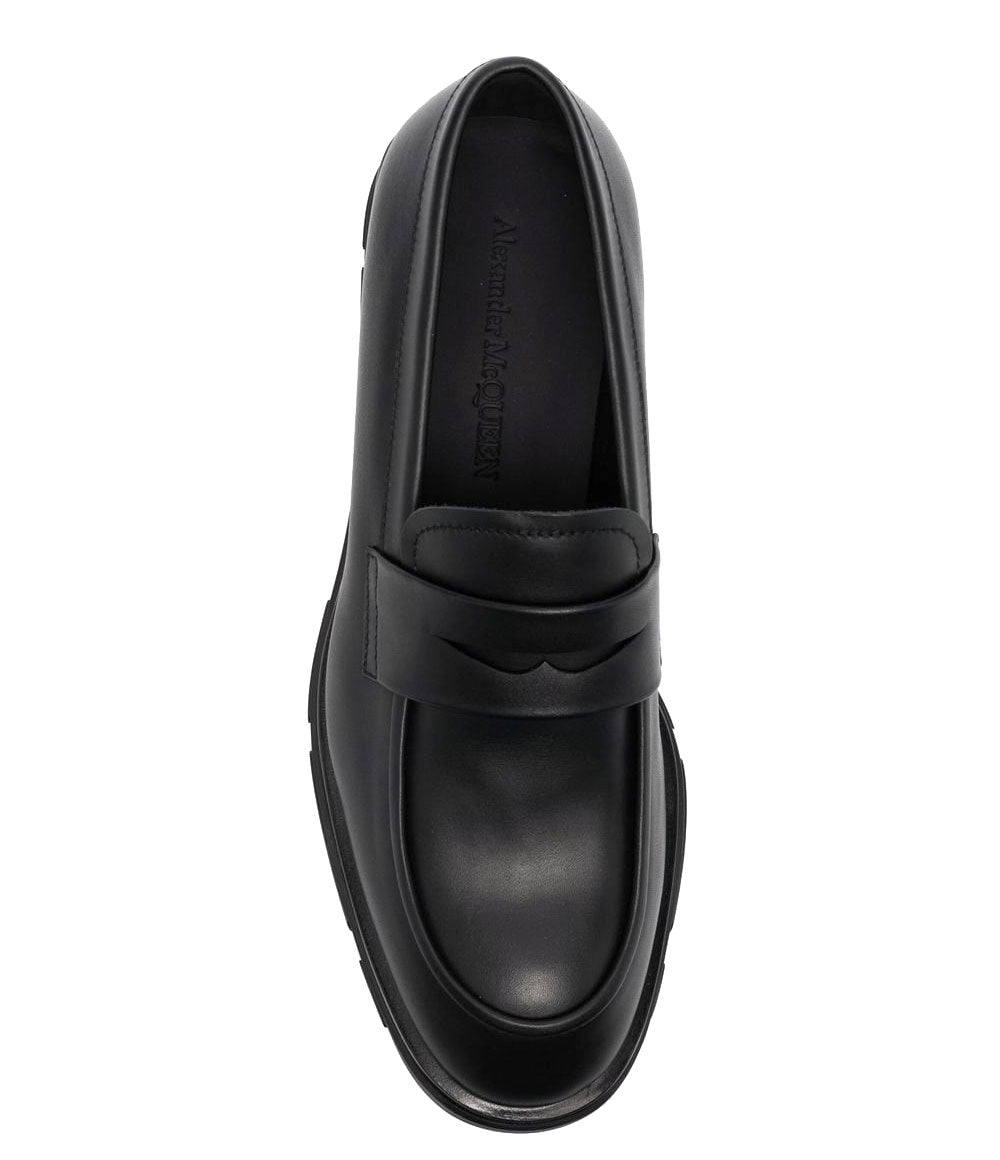 Black calf-leather penny-slot loafers from Alexander McQueen featuring penny slot, round toe, slip-on style and flat rubber sole.
