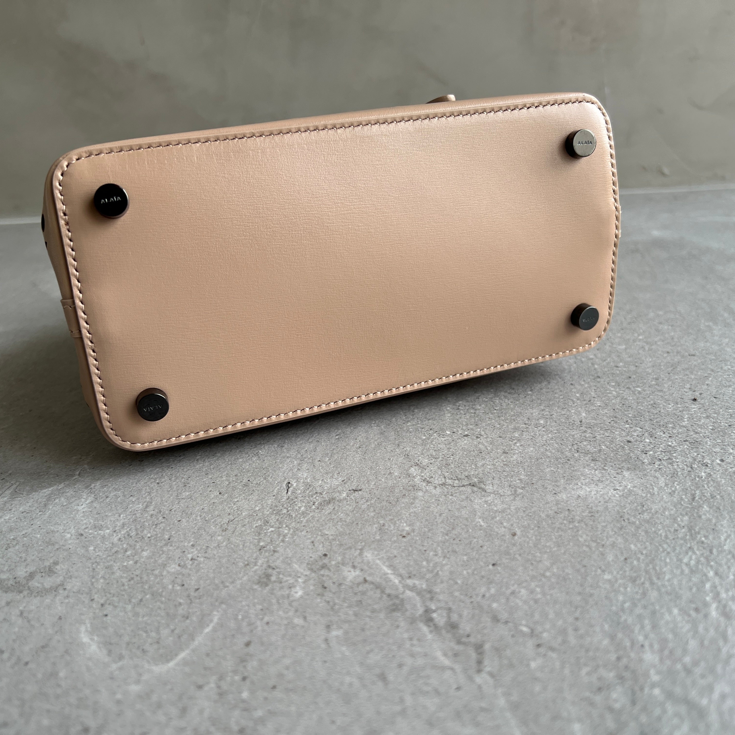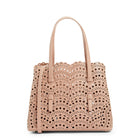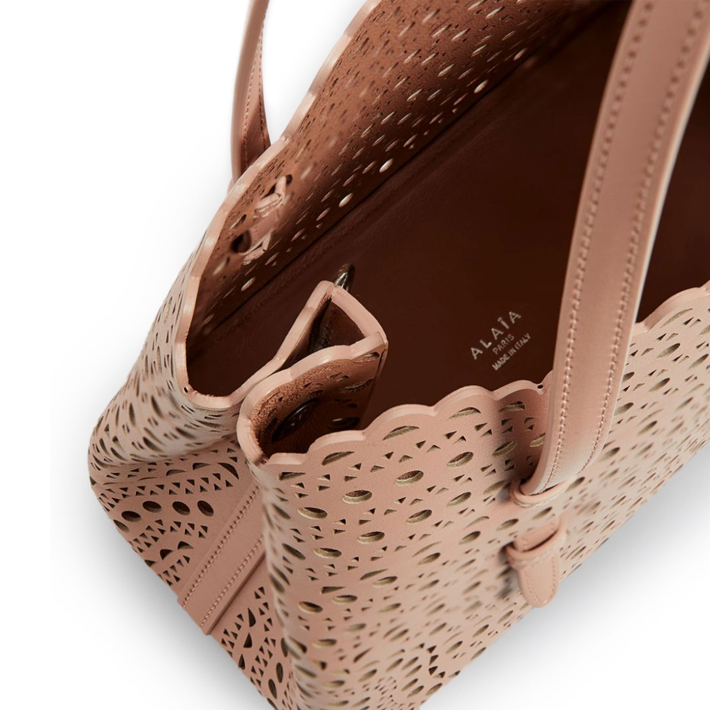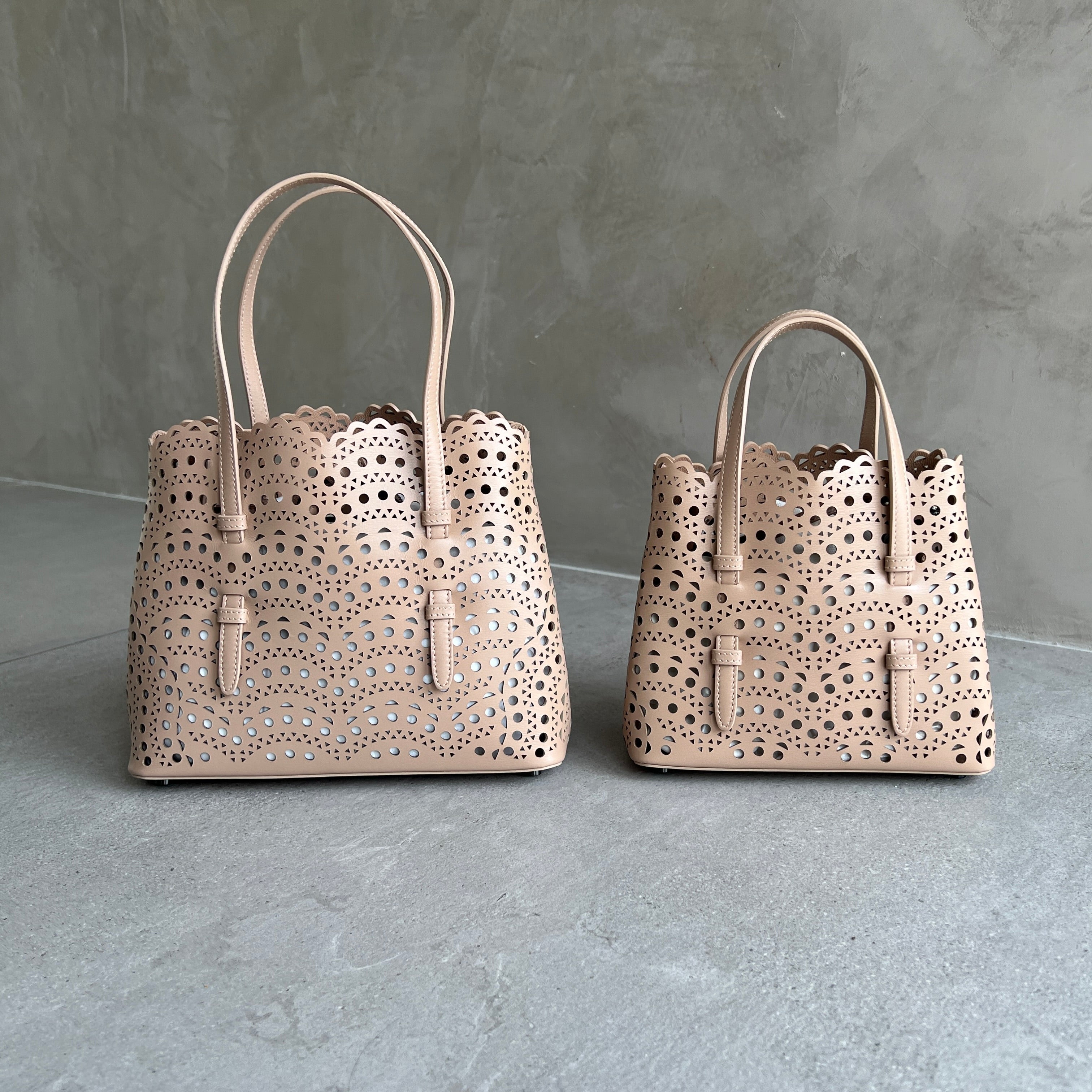 Discover the Alaia Tote Bag in Wave Pattern – a blend of lace-inspired beauty and architectural elegance. Its snap-fastening gusseted sides expand, and it comes with a leather pouch and galvanized silver hardware. Effortlessly chic for hand carry.