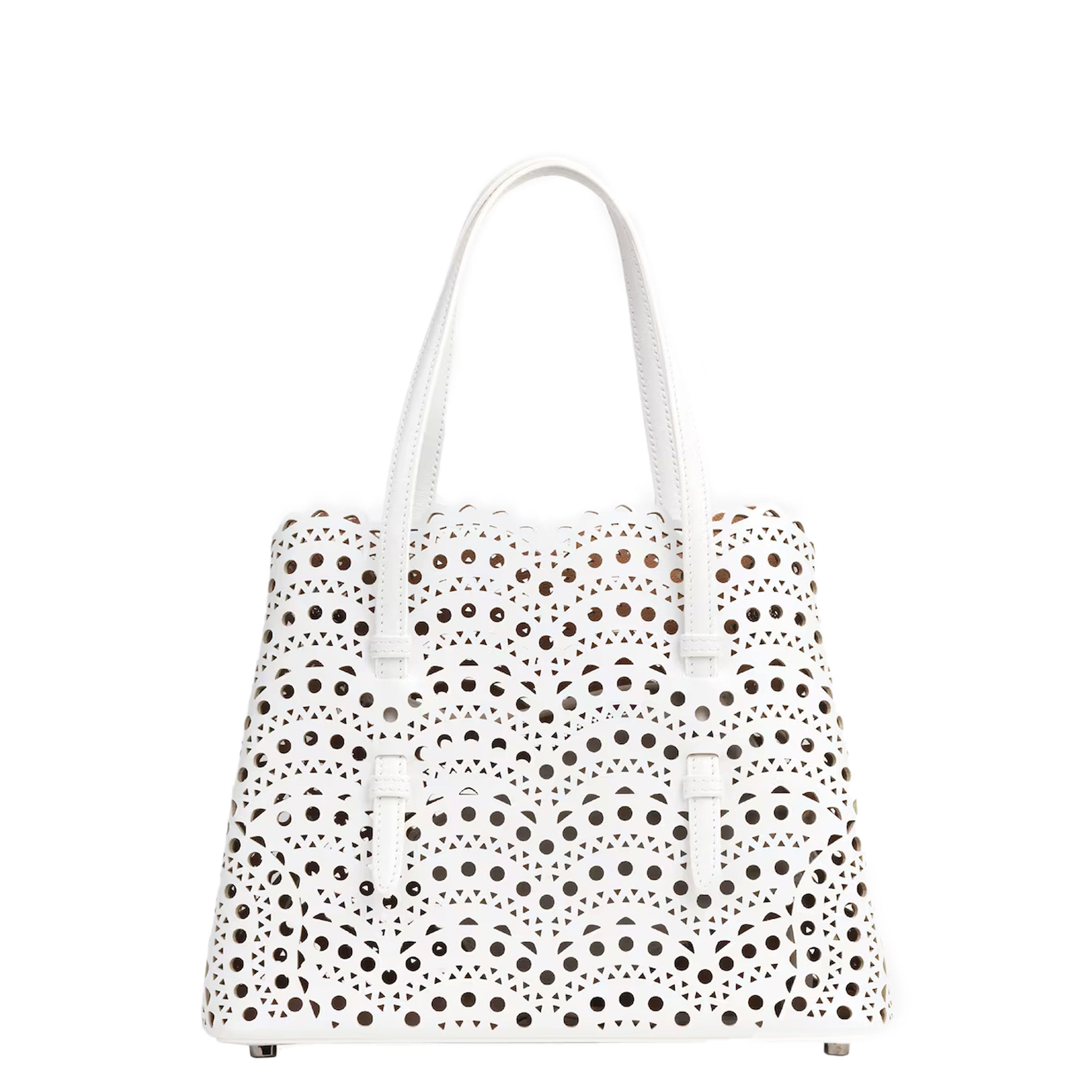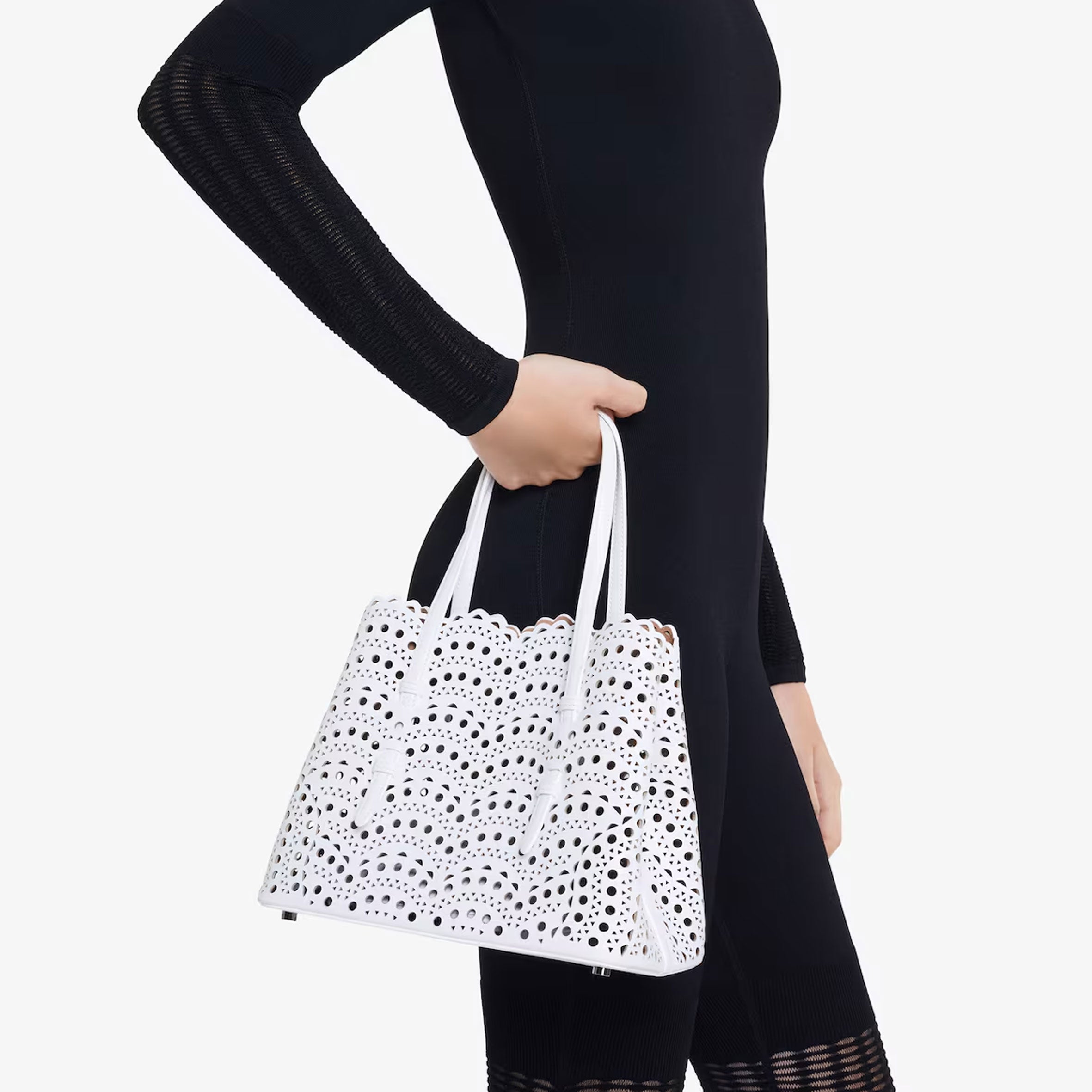 Discover the Alaia Tote Bag in Wave Pattern – a blend of lace-inspired beauty and architectural elegance. Its snap-fastening gusseted sides expand, and it comes with a leather pouch and galvanized silver hardware. Effortlessly chic for hand carry.