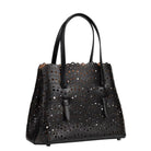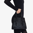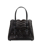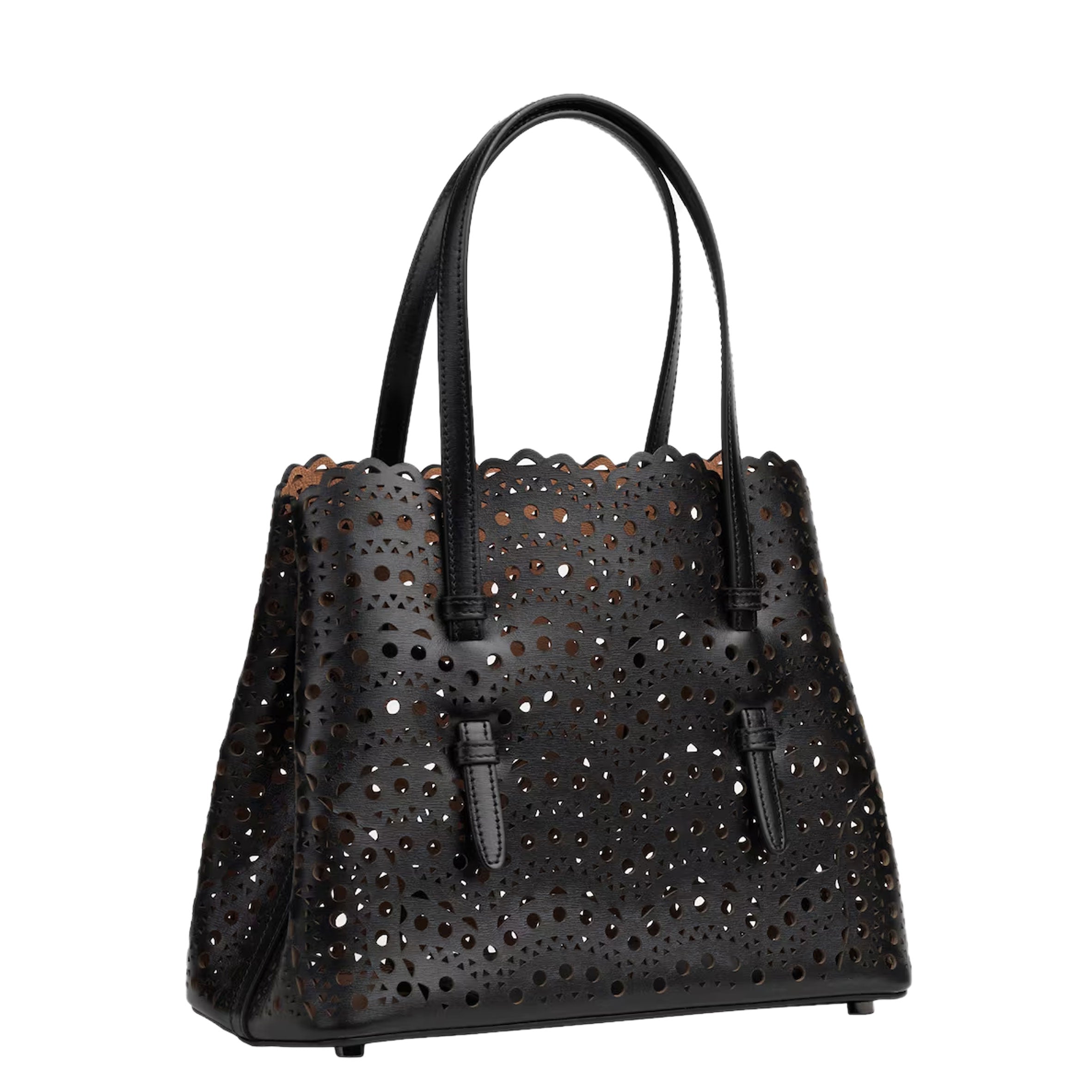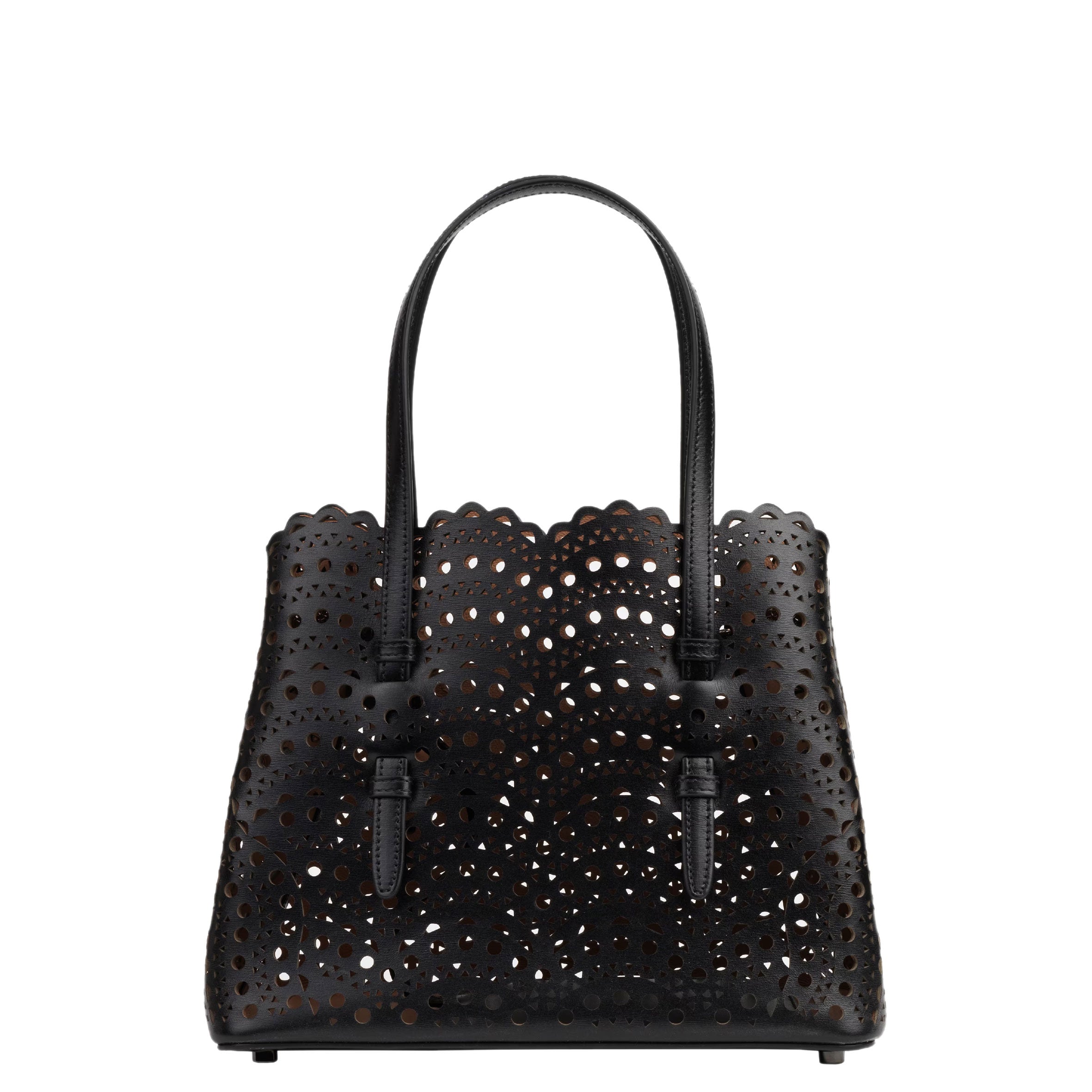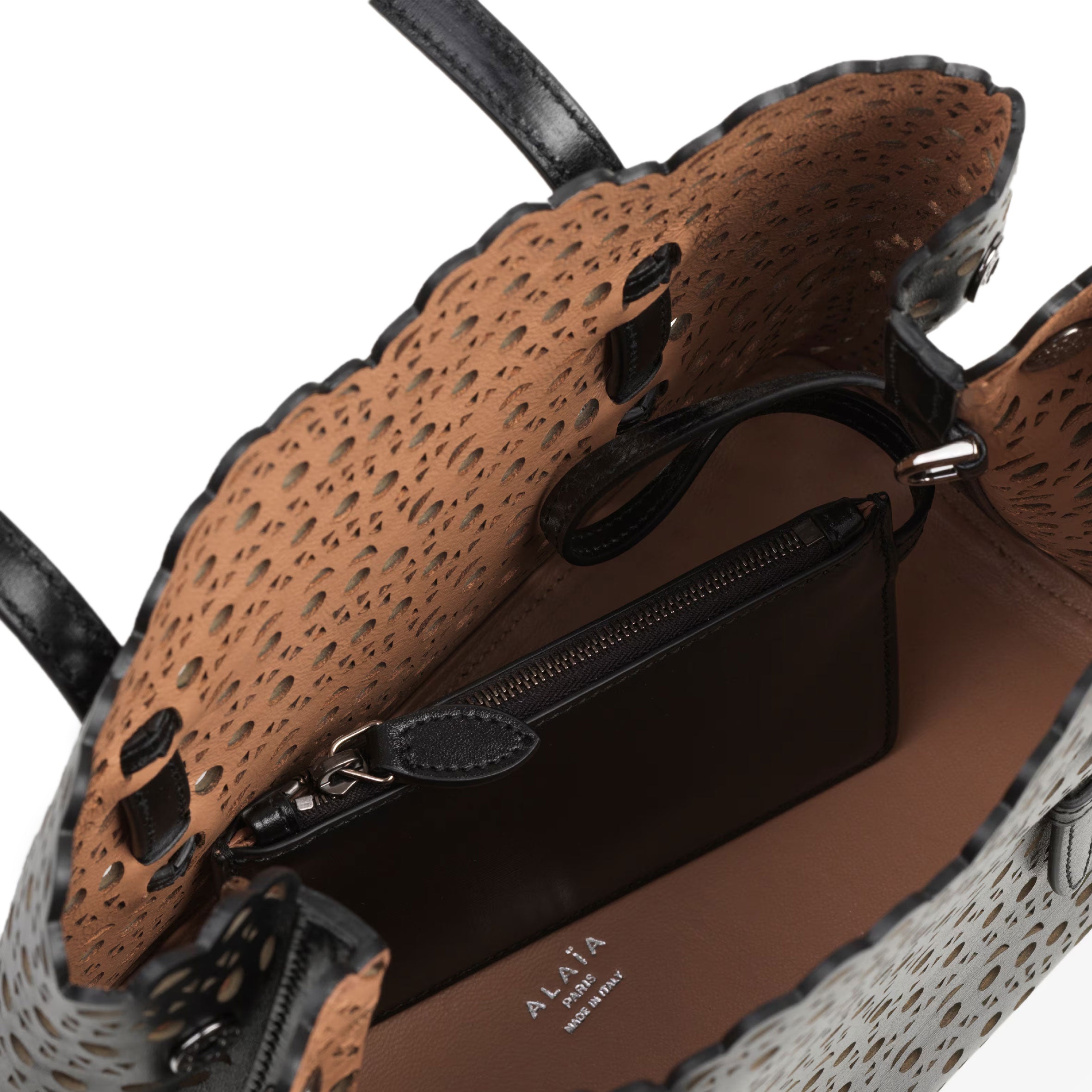 Discover the Alaia small tote bag in a vienne pattern inspired by precious lace and moucharabieh architectural openwork. Features a snap-fastening, gusseted sides that expand, galvanised silver hardware, leather pouch and detachable strap for hand or shoulder carrying.