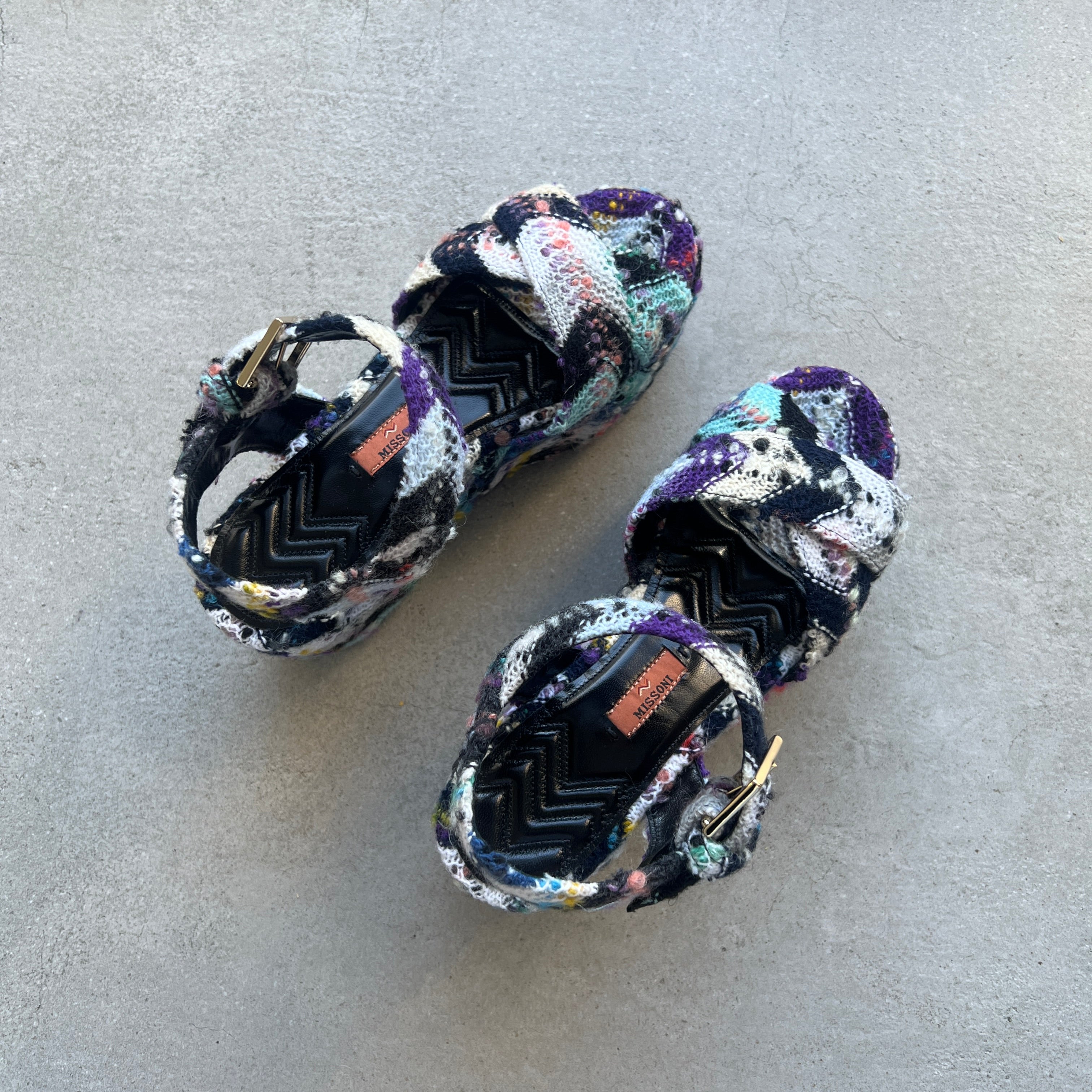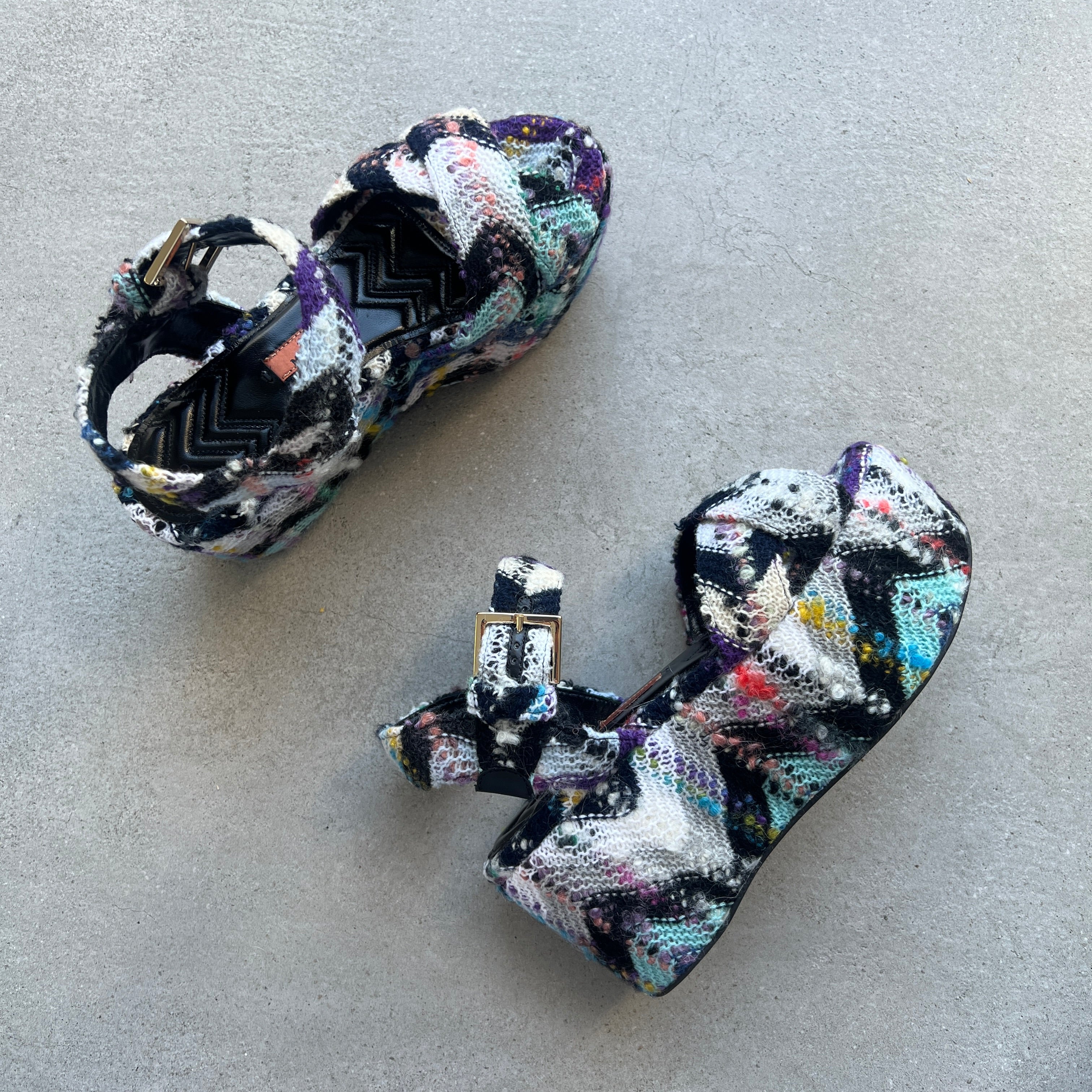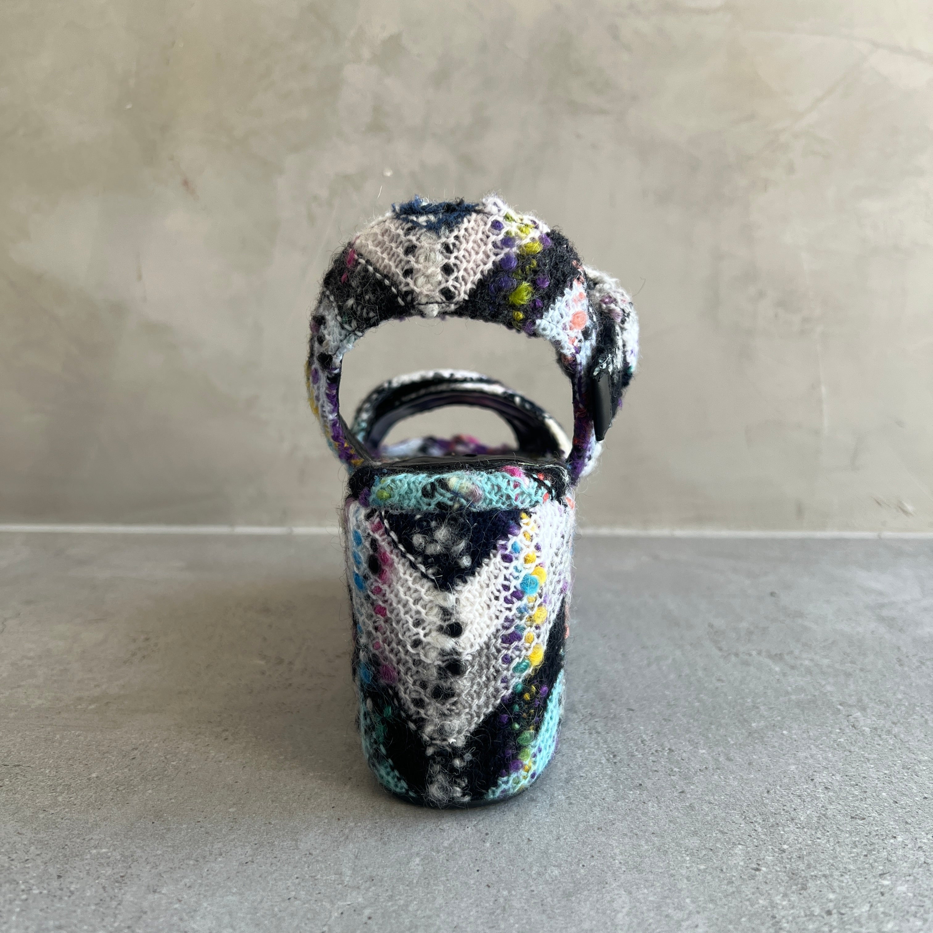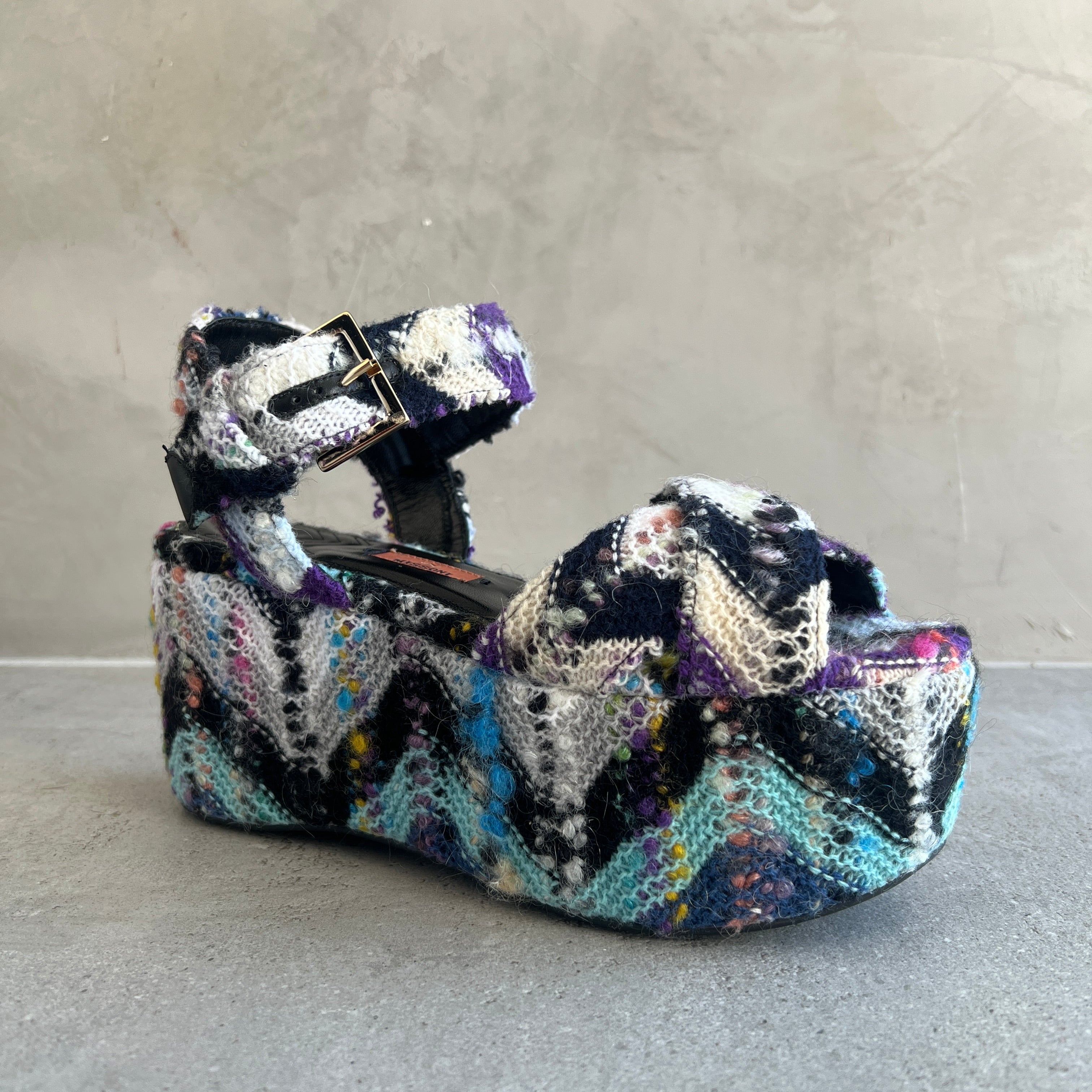 The Julia platform wedge features the signature Missoni wave pattern in mohair.