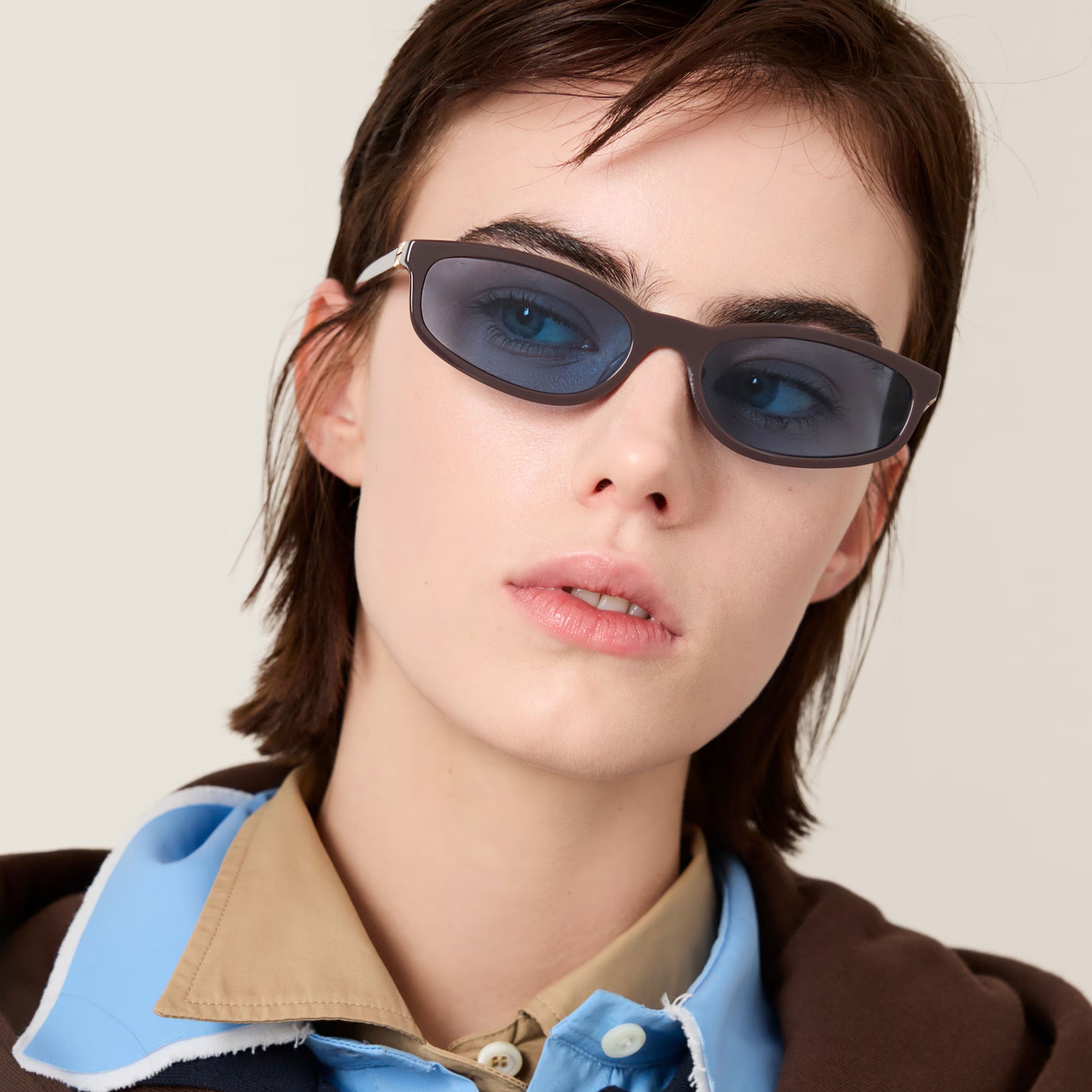 Miu Regard sunglasses are reinterpreted in a new sophisticated, classic version. The frame features narrow, rectangular lenses and slim rims that enhance its extreme lightness. The temples are embellished with the refined touch of the Miu Miu vertical logo.