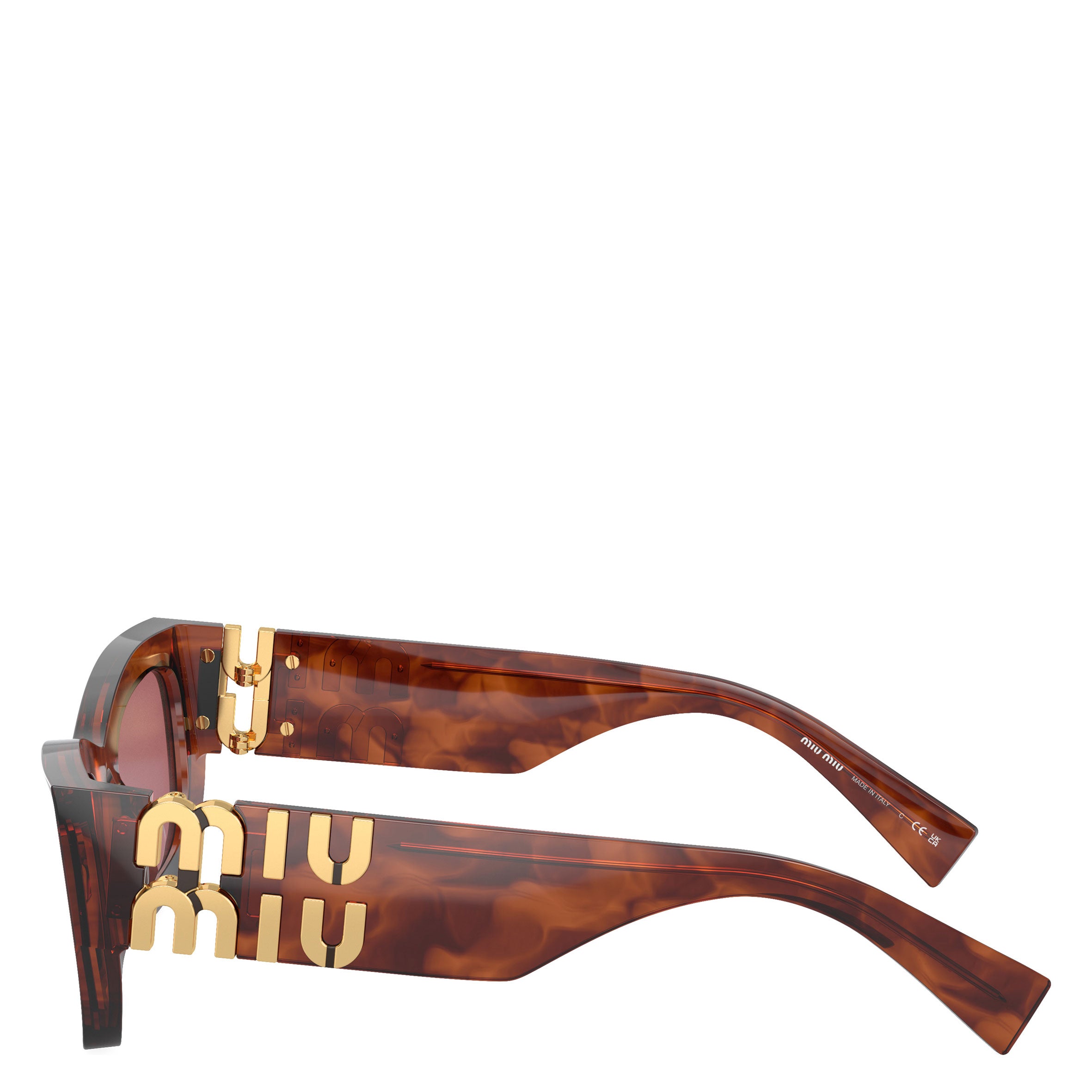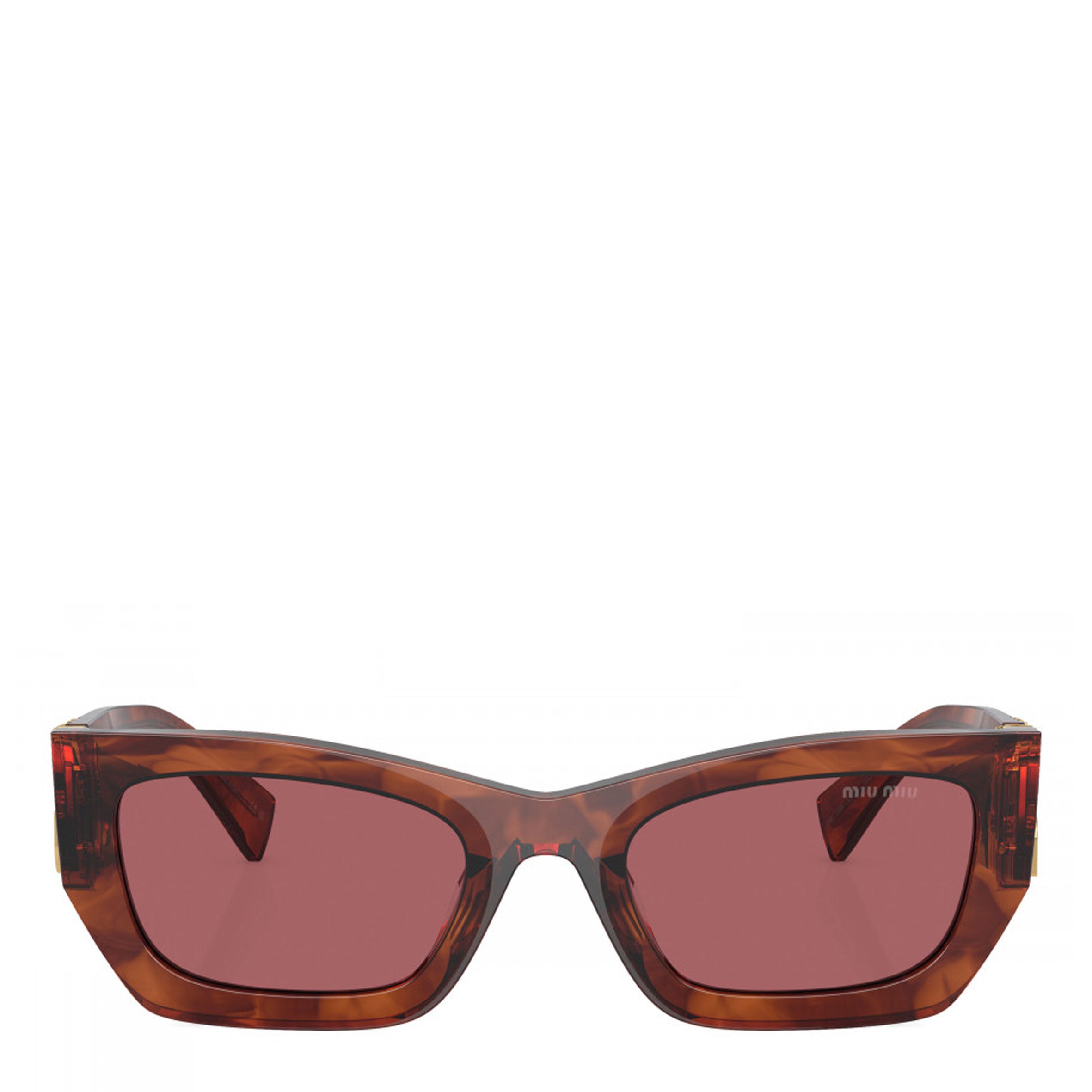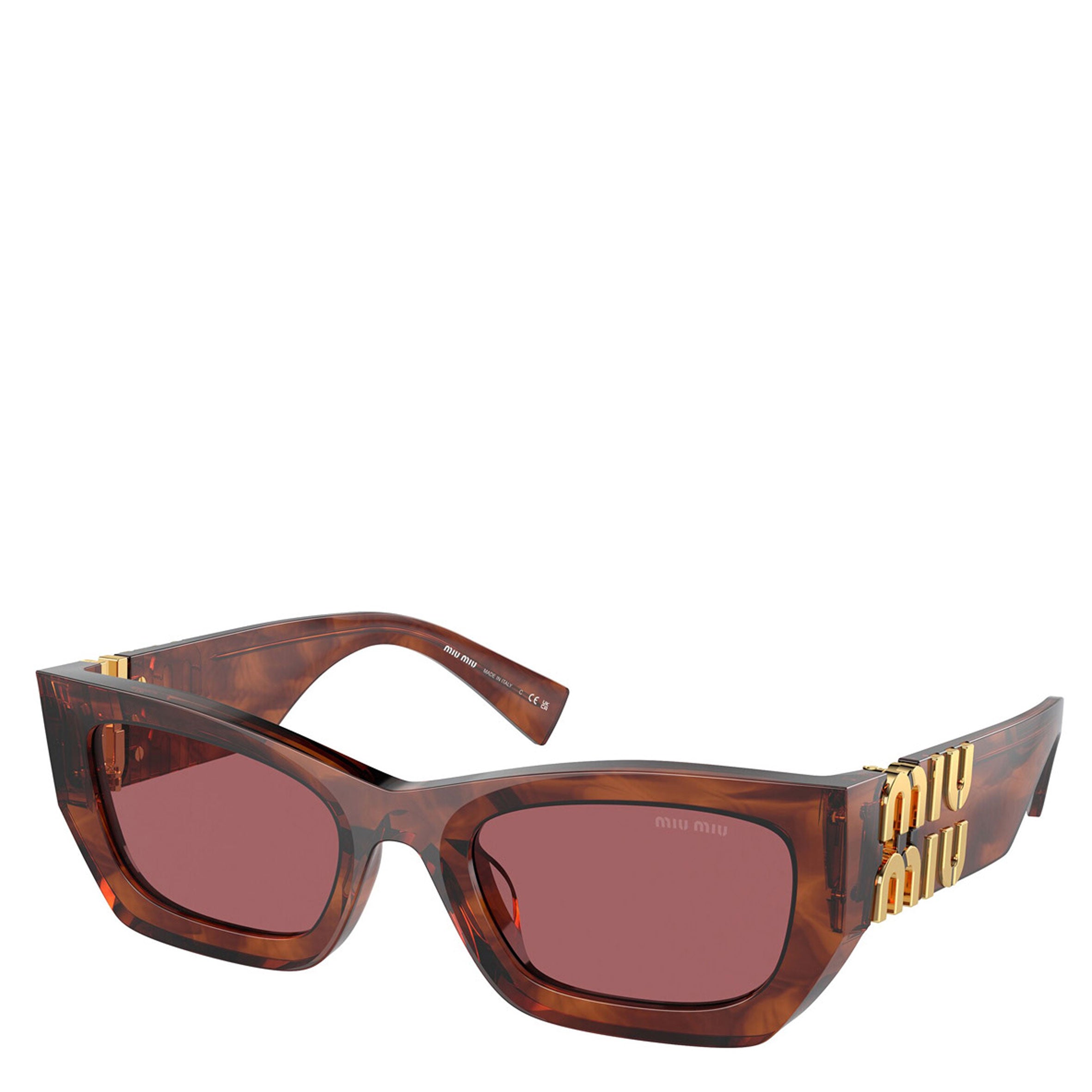 Miu Miu sunglasses model MU 70US havana frame variant with dark violet lens.