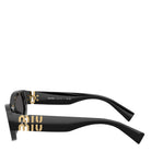 The Miu Glimpse sunglasses feature a geometric design and bold volumes. The oversized acetate frame showcases striking profiles, accented by the iconic vertical Miu Miu logo integrated into the hinge of the thick temples.