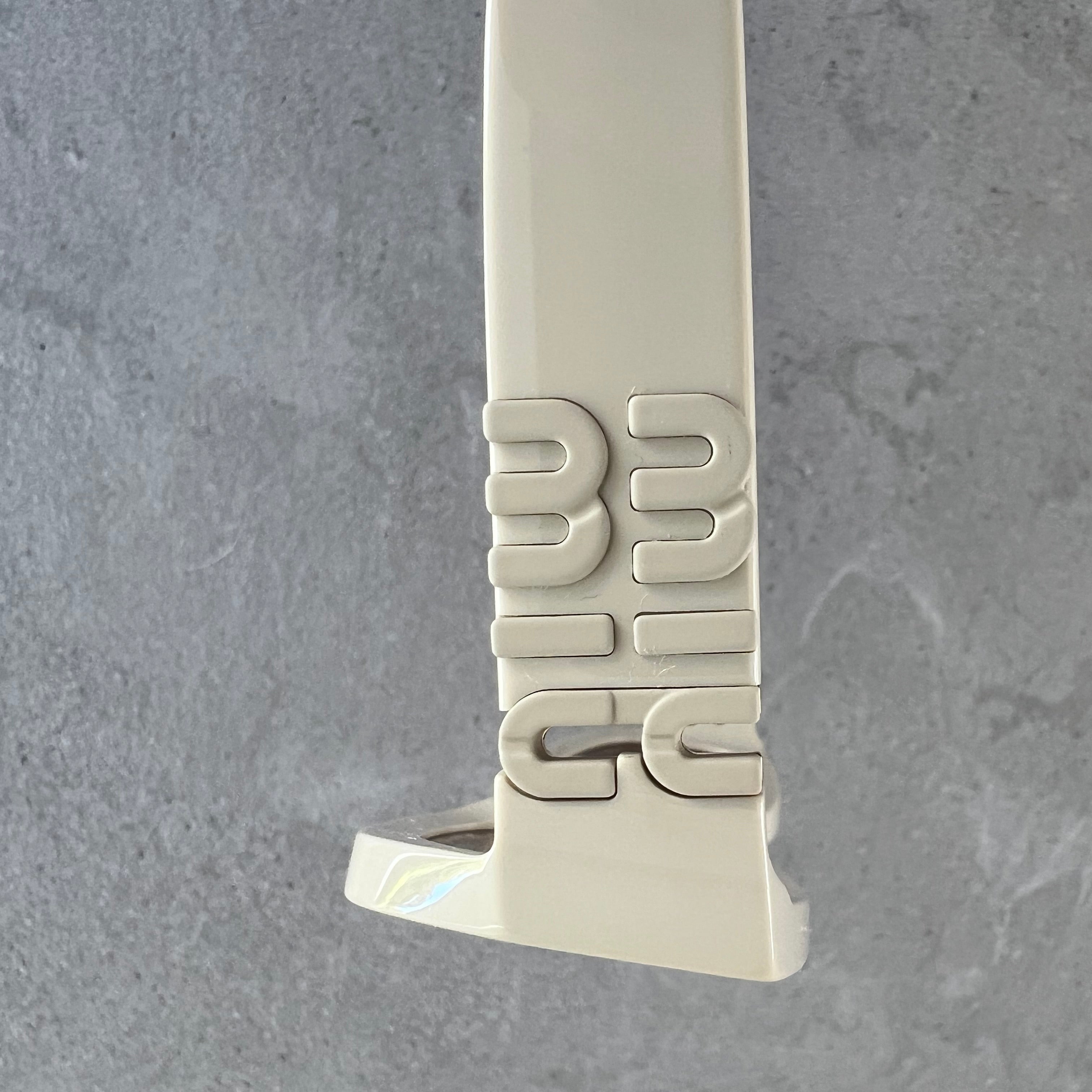 The Miu Glimpse sunglasses feature a geometric design and bold volumes. The oversized acetate frame showcases striking profiles, accented by the iconic vertical Miu Miu logo integrated into the hinge of the thick temples.