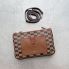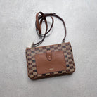 A crossbody camera style bag with two separate zipped compartments and one exterior slip pocket with snap button closure. Adjustable leather strap. The perfect size for your daily essentials.
