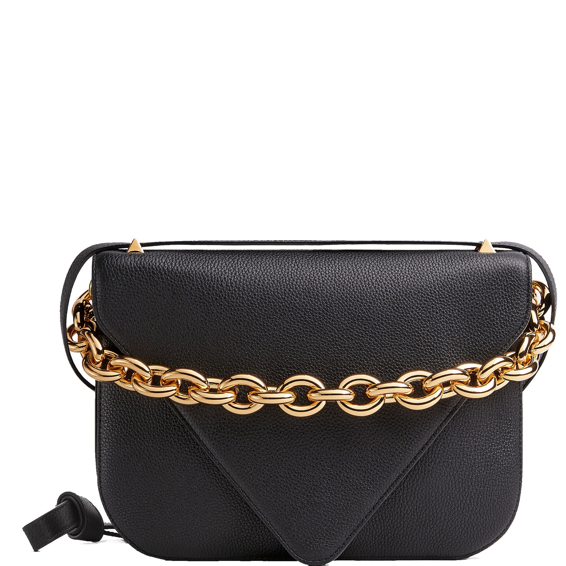 Bottega Veneta uses "V" shaped design details to reference its name in the Mount bag. Crafted from Grained leather, the bag features a triangular top flap and chunky gold chain-link handle which can be worn with either the leather shoulder strap or the golden chain. Features and internal zip pocket. metal closure and detachable leather shoulder strap.