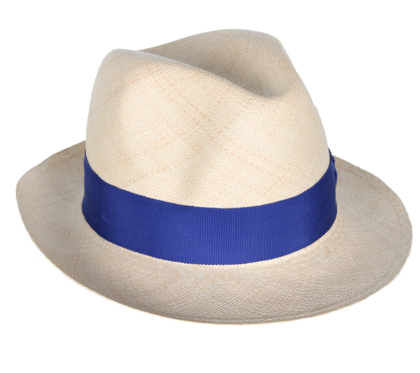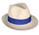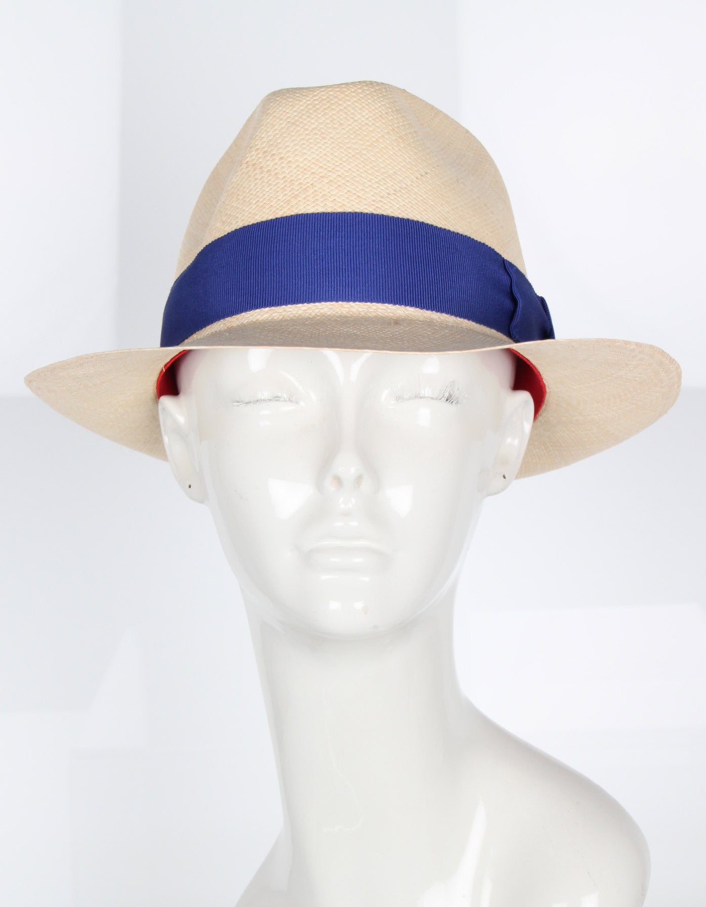 This item is only available in store. Natural "Fedora" straw hat with a blue ribbon. Comes with short red "B" hat pin. Made in Ecuador.