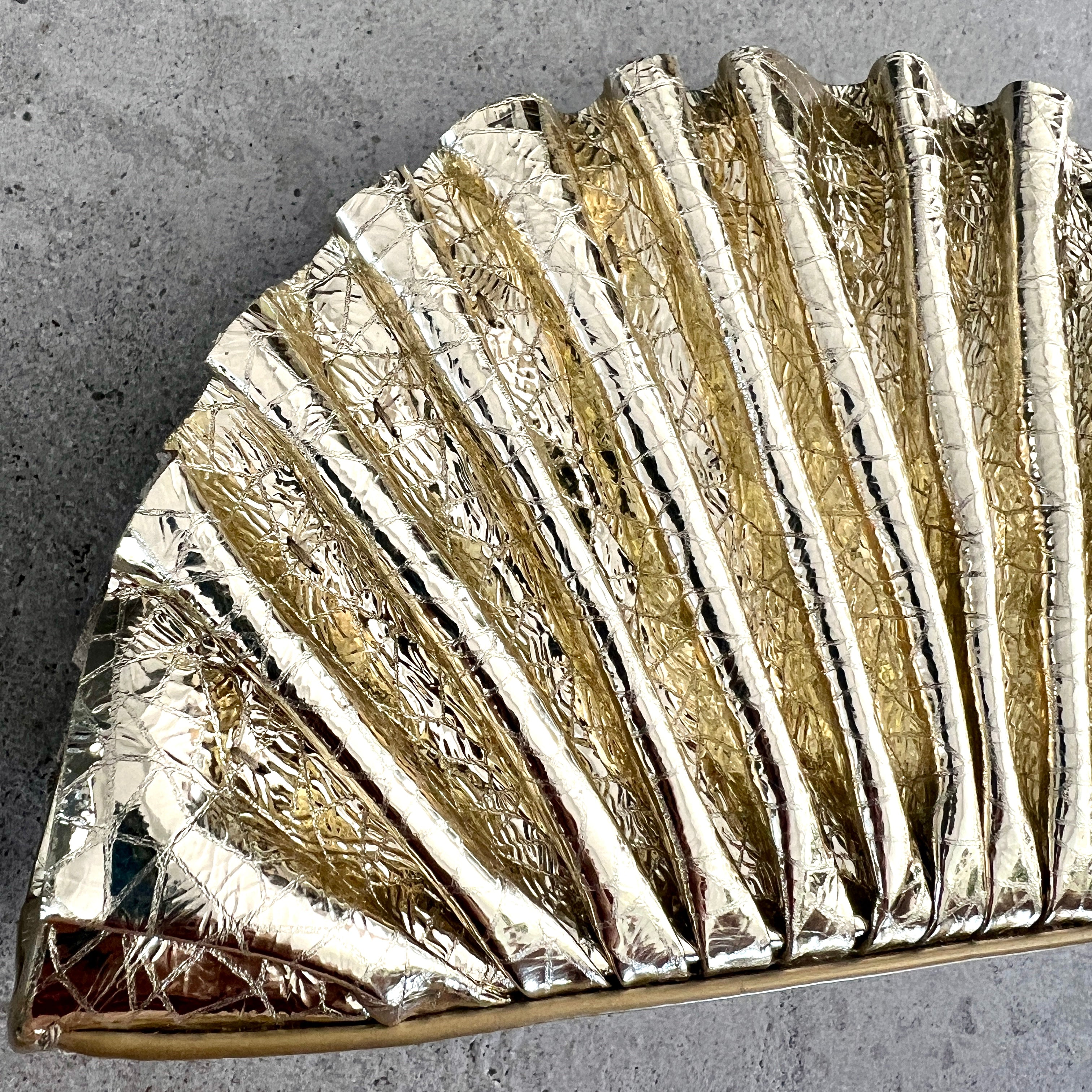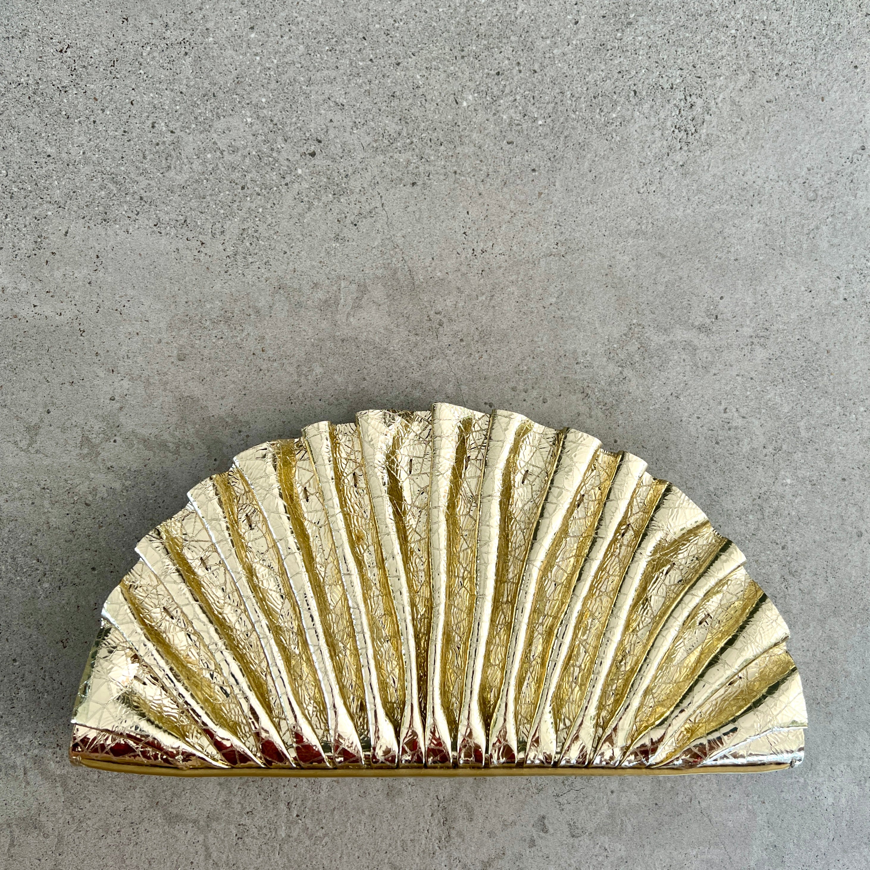 Wearable art, the Nala Mini Clutch is a fanned-style clutch created by pleating luxuriously soft metallic-hued smooth napa leather. The shell shaped silhouette comes in an eye-catching shiny Gold and an invisible magnetic closure keeps all of the essentials safe.