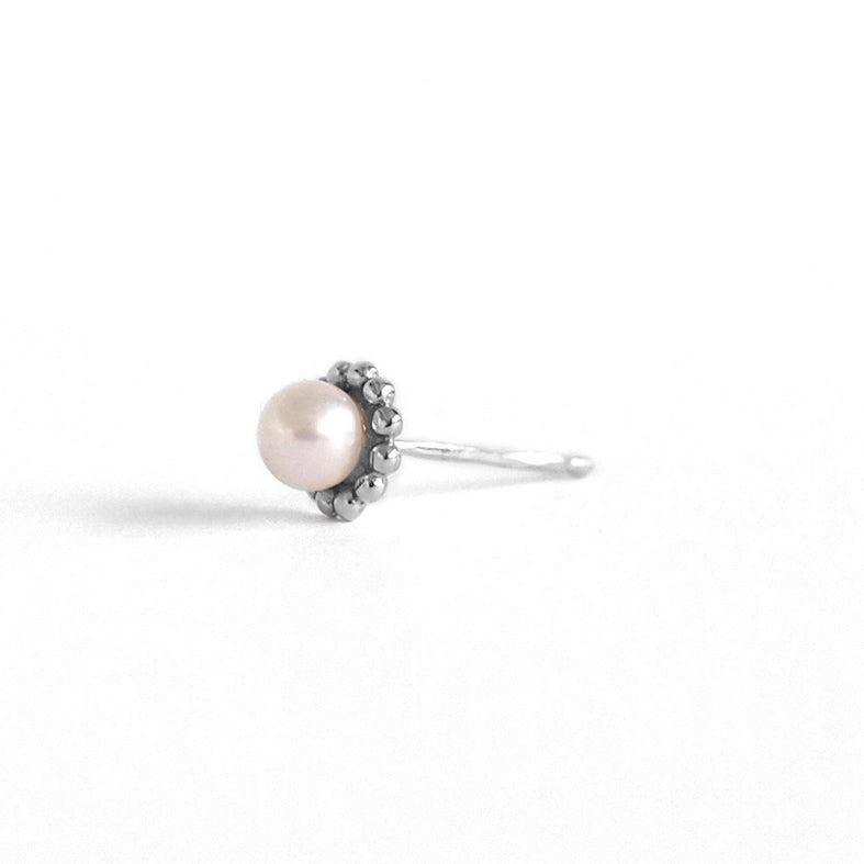 A tiny stud with an Akoya freshwater pearl framed in a halo of tiny dots. Created in Sterling Silver.