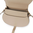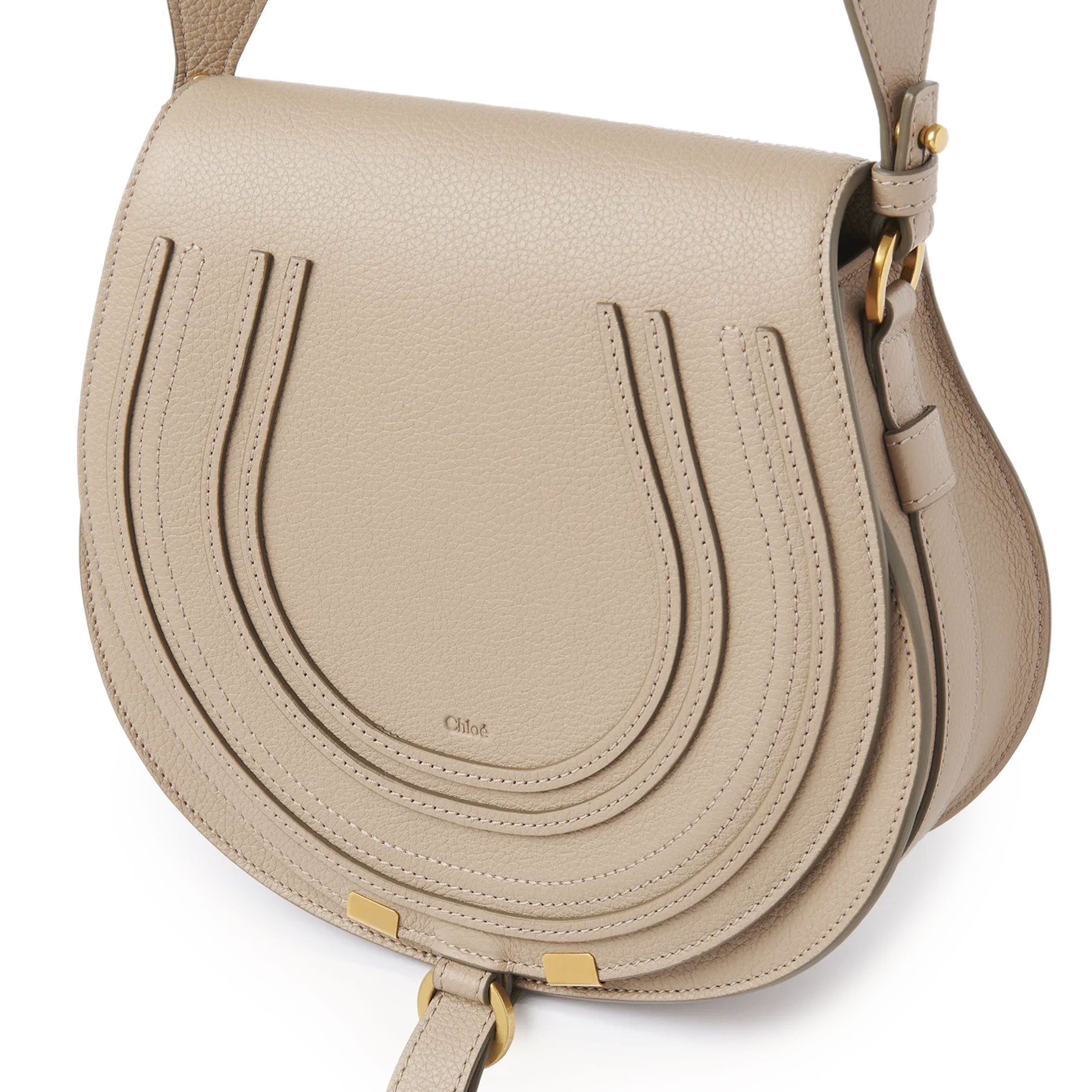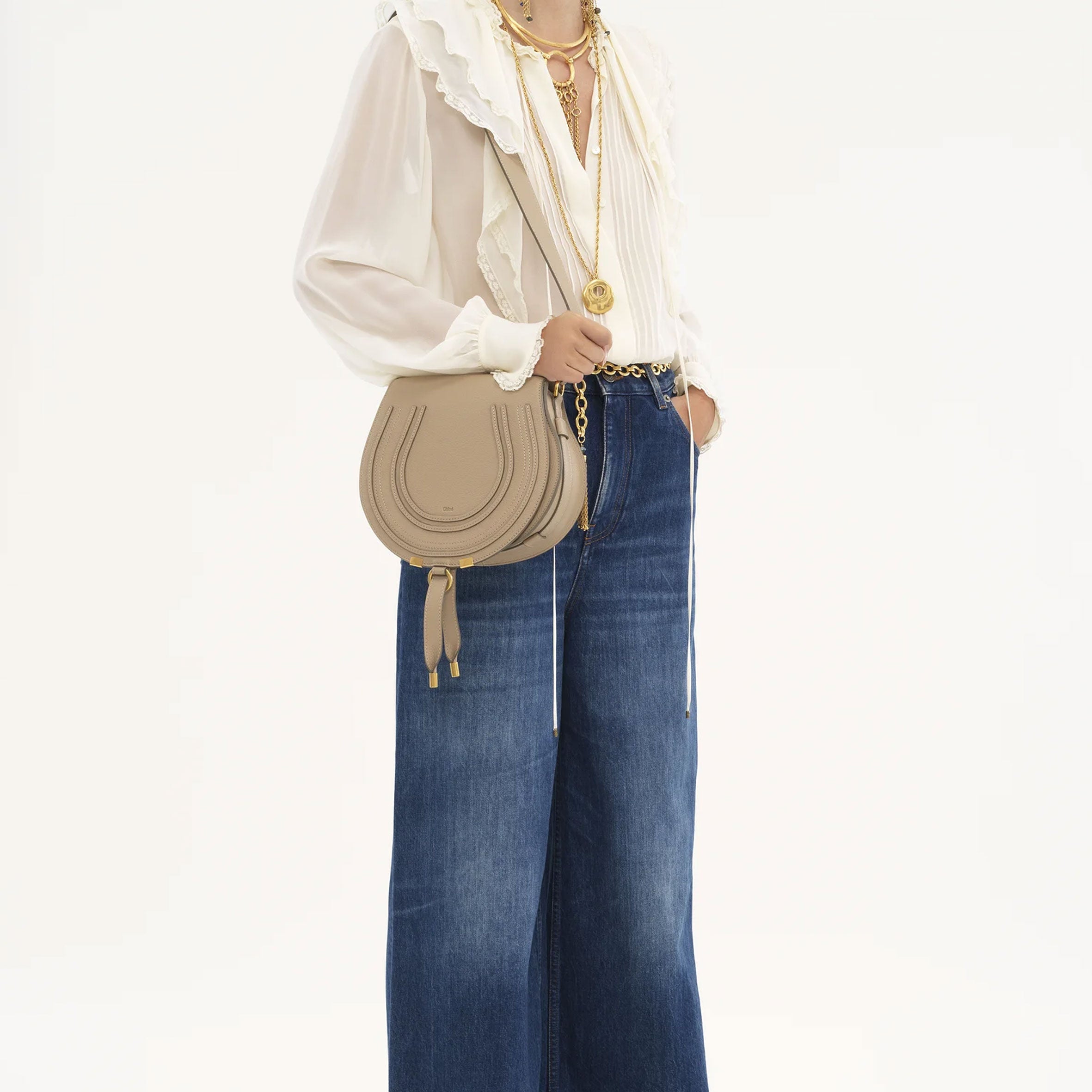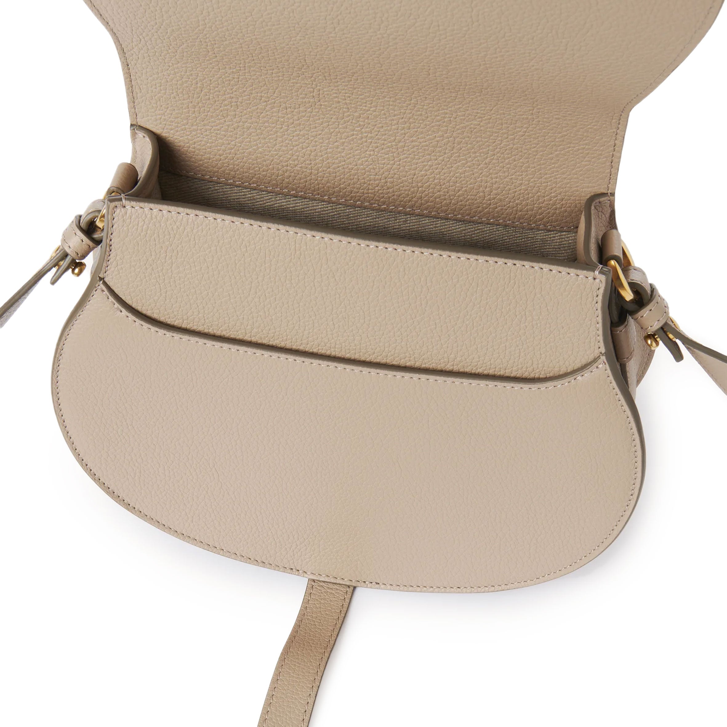 This Marcie saddle bag is crafted from grained calfskin with a rounded silhouette and a clean top-line. The flap features the line's iconic saddle stitching, secured with signature dangling leather tassels.