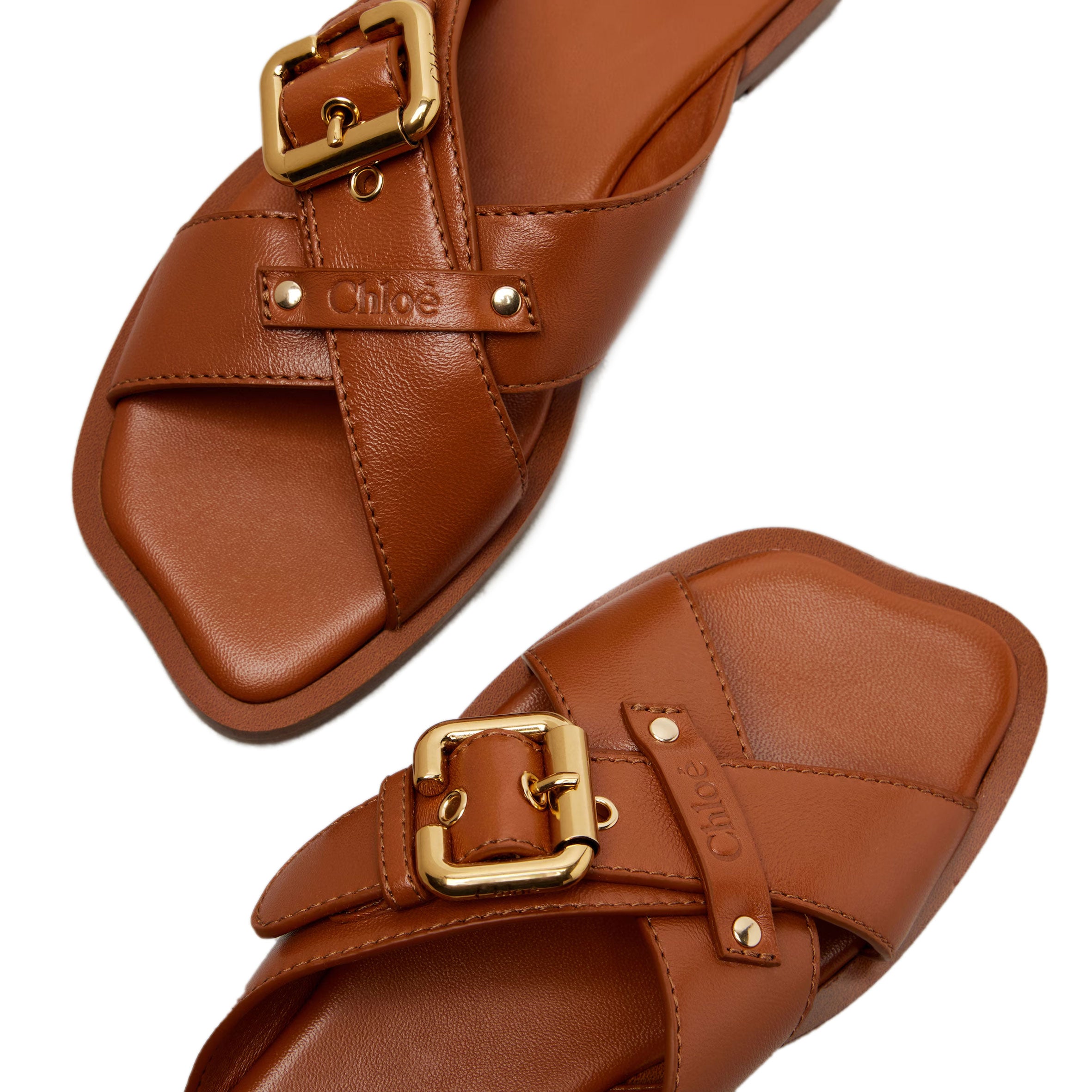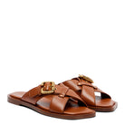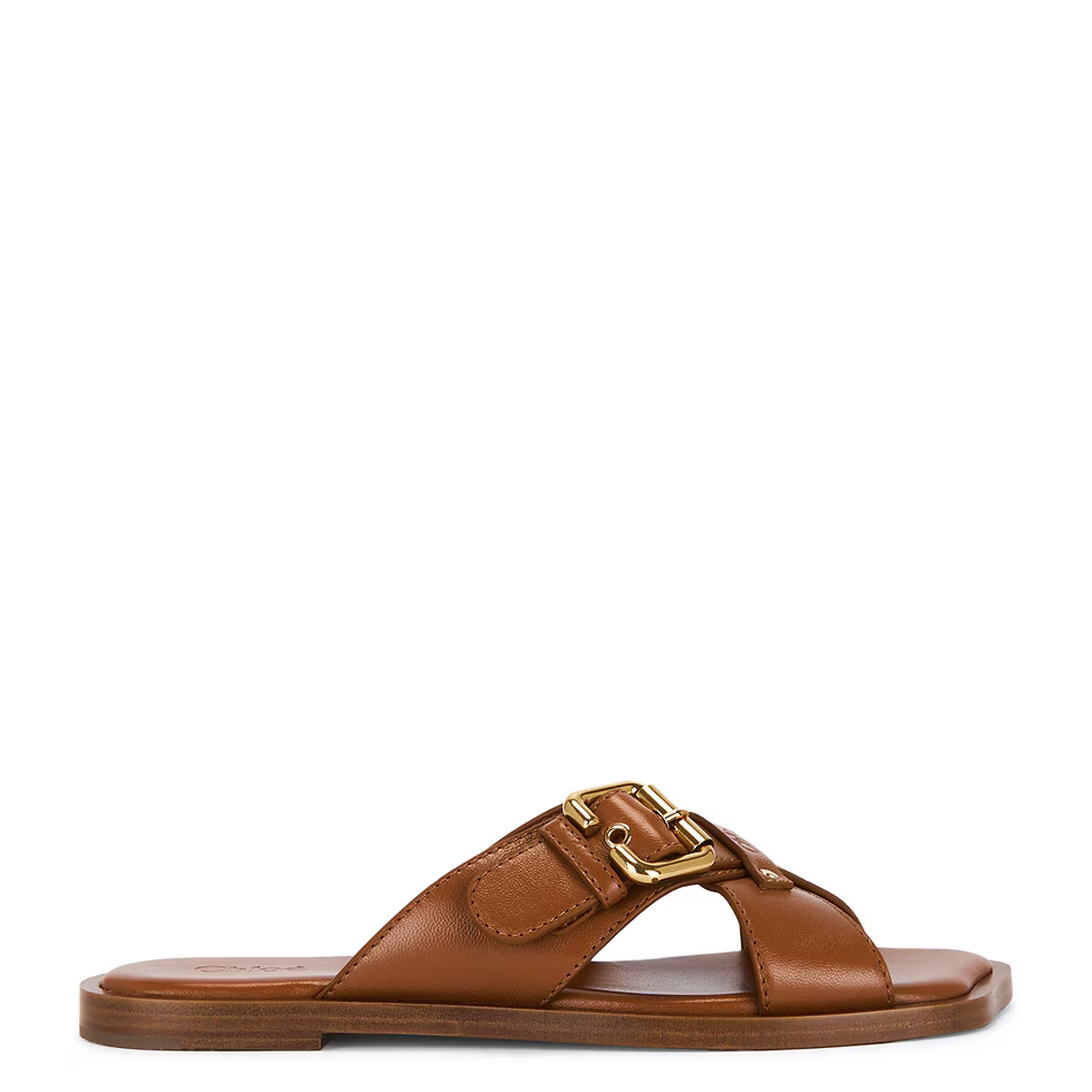 The Nil slides by Chloé embody understated elegance with a refined, modern edge. Crafted in Italy from smooth brown leather, the design features soft crisscross straps accented with subtle gold-tone hardware. A square open toe and leather-lined footbed offer effortless wearability, while the minimalist silhouette makes them a timeless warm-weather staple.
