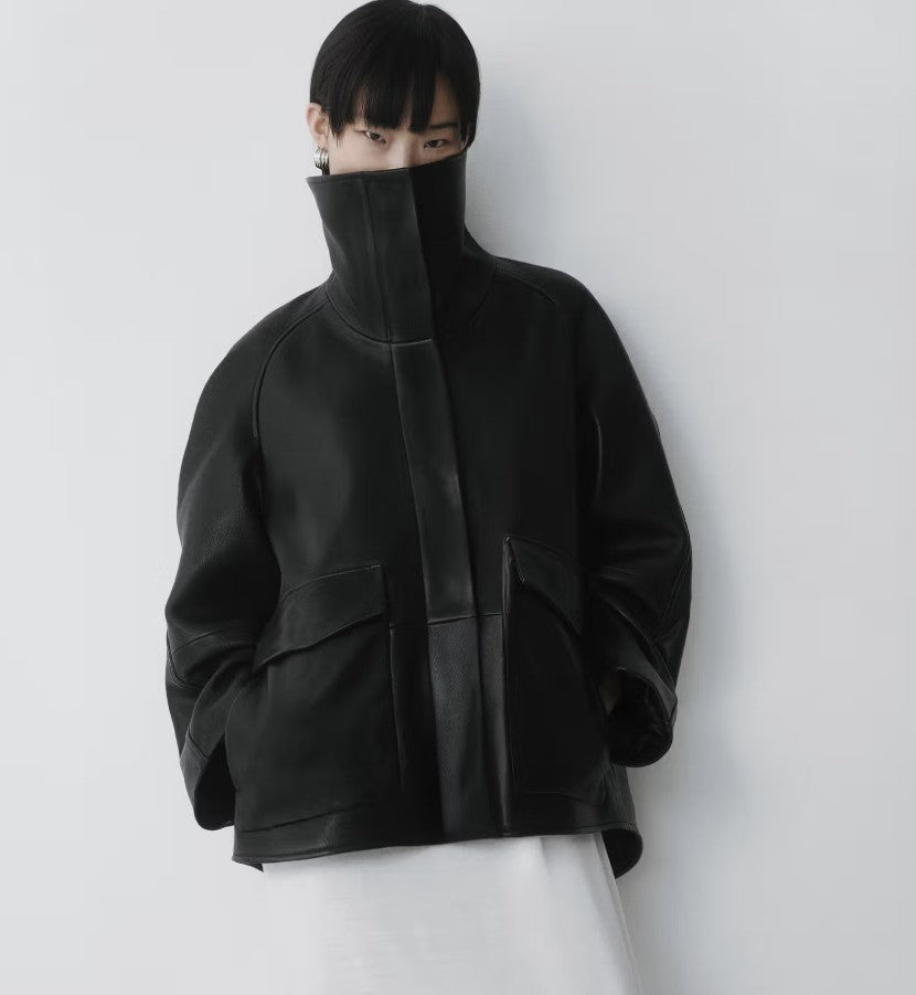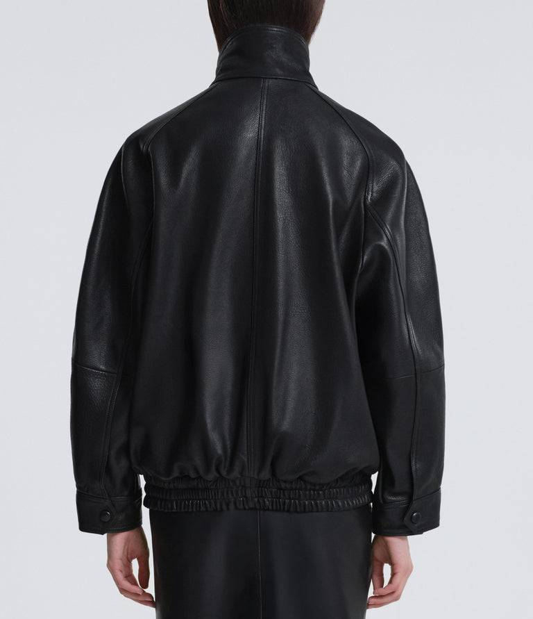 A fluid leather jacket, gracefully enveloping in shape and finish. Defined by a high collar, dropped shoulders, and curved seams. Fastens with zip and button. Softly cinched at hem.