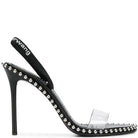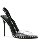 Nova high heel sling-back sandal with metal ball chain trim around sole edge. Leather logo covered elastic back strap and clear front strap. Wrapped leather heel and leather outsole. True to size.