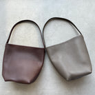 Classic tote bag in grained calfskin leather with interior tie closure and flat handle.