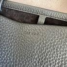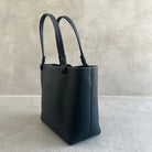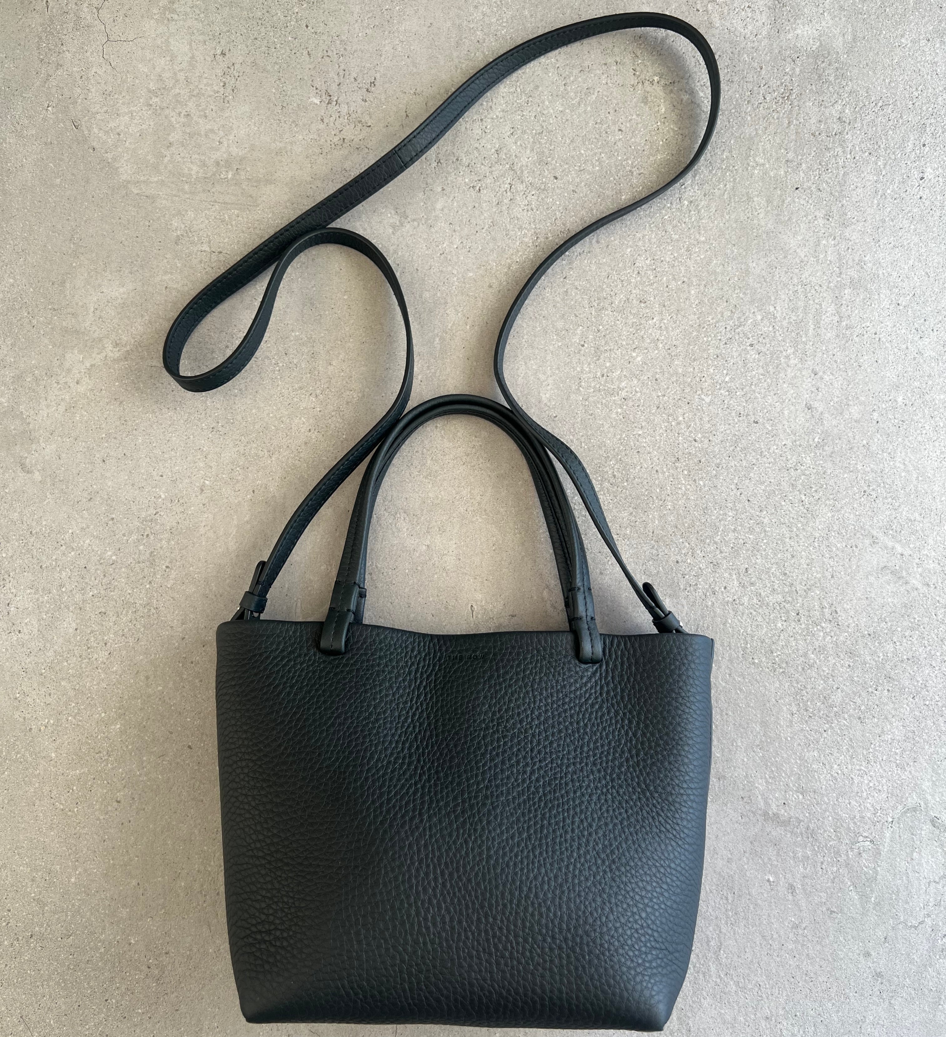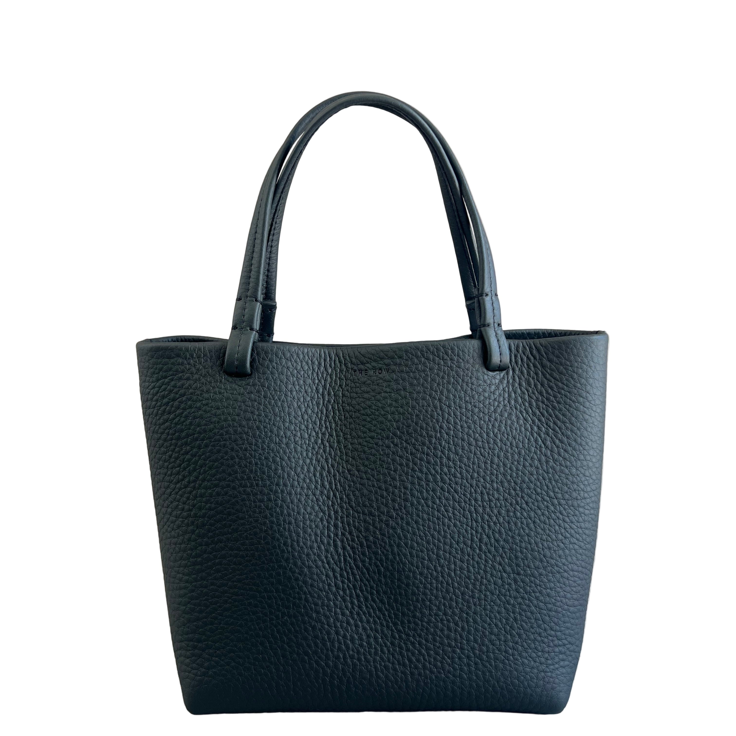 Small classic tote bag in textured calfskin leather with detachable shoulder strap, interior toggle closure, and flat handles.