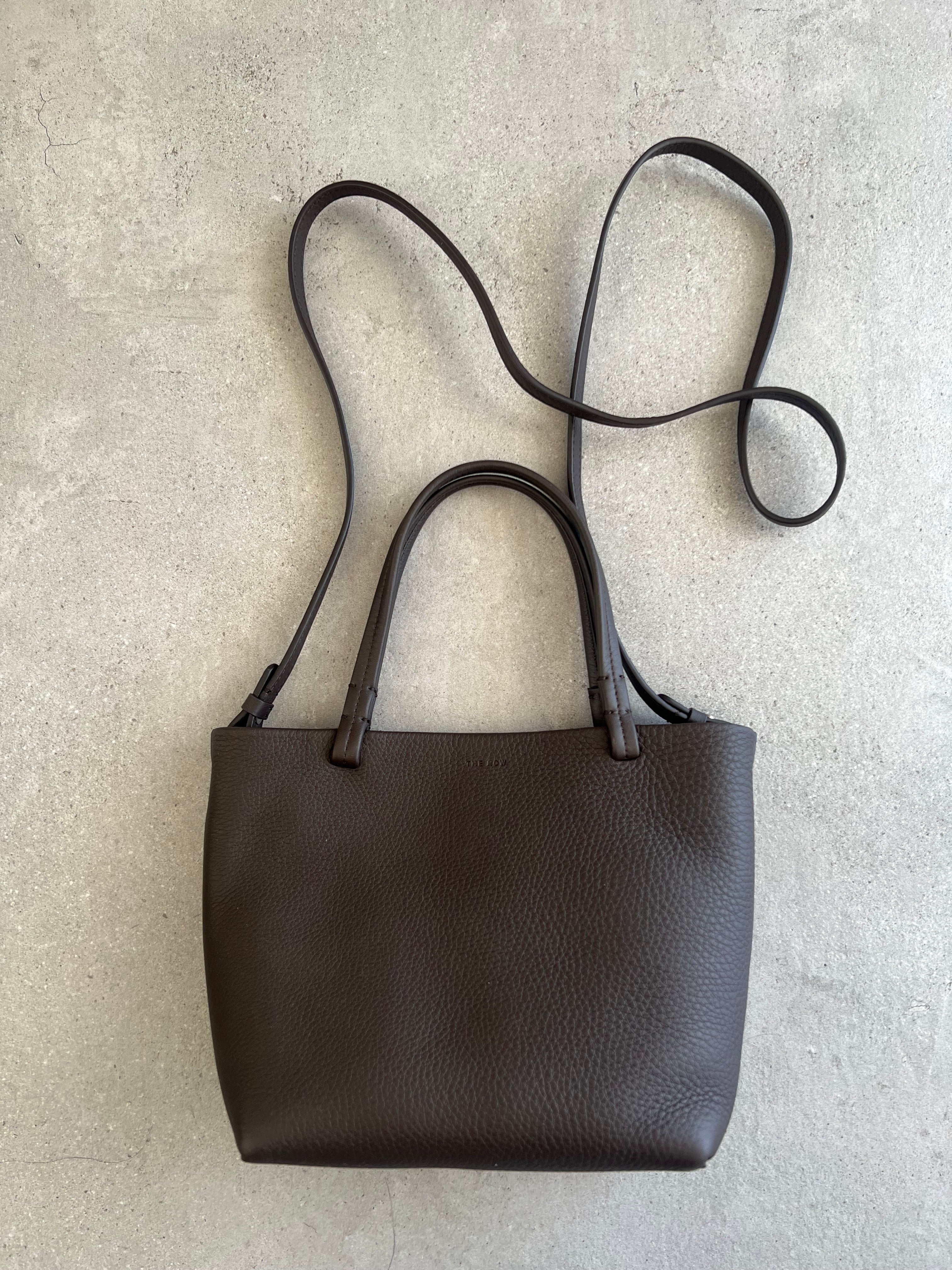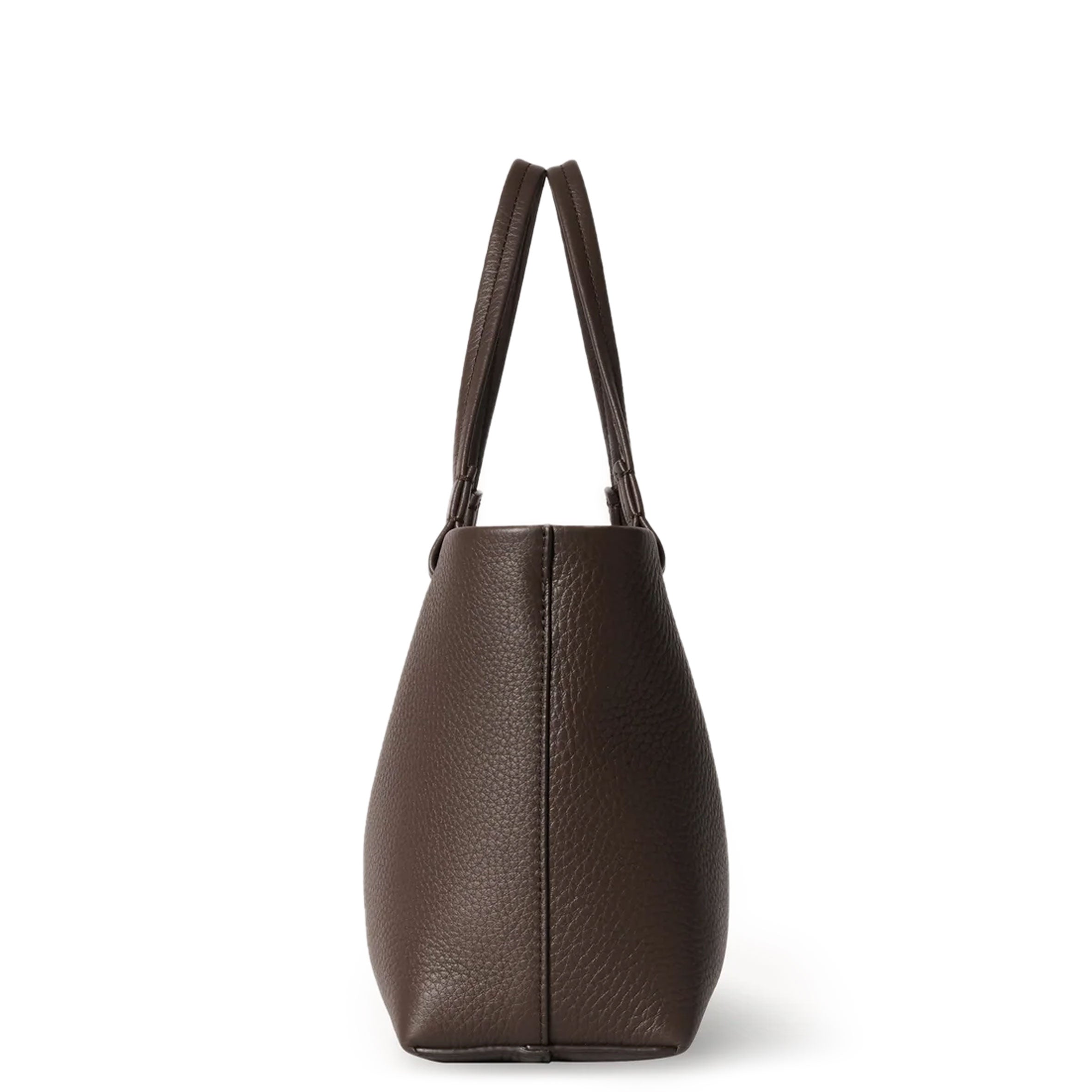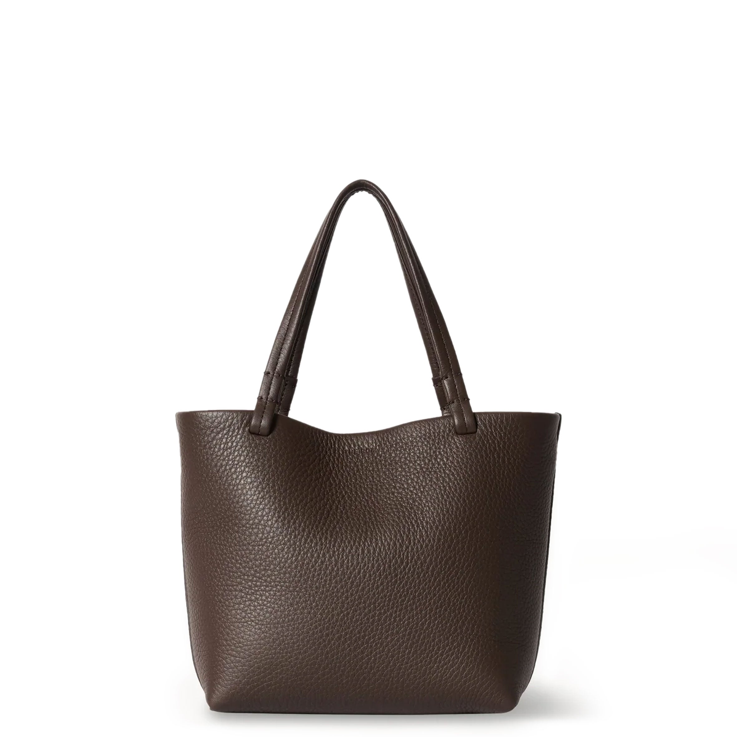 Small classic tote bag in textured calfskin leather with detachable shoulder strap, interior toggle closure, and flat handles.