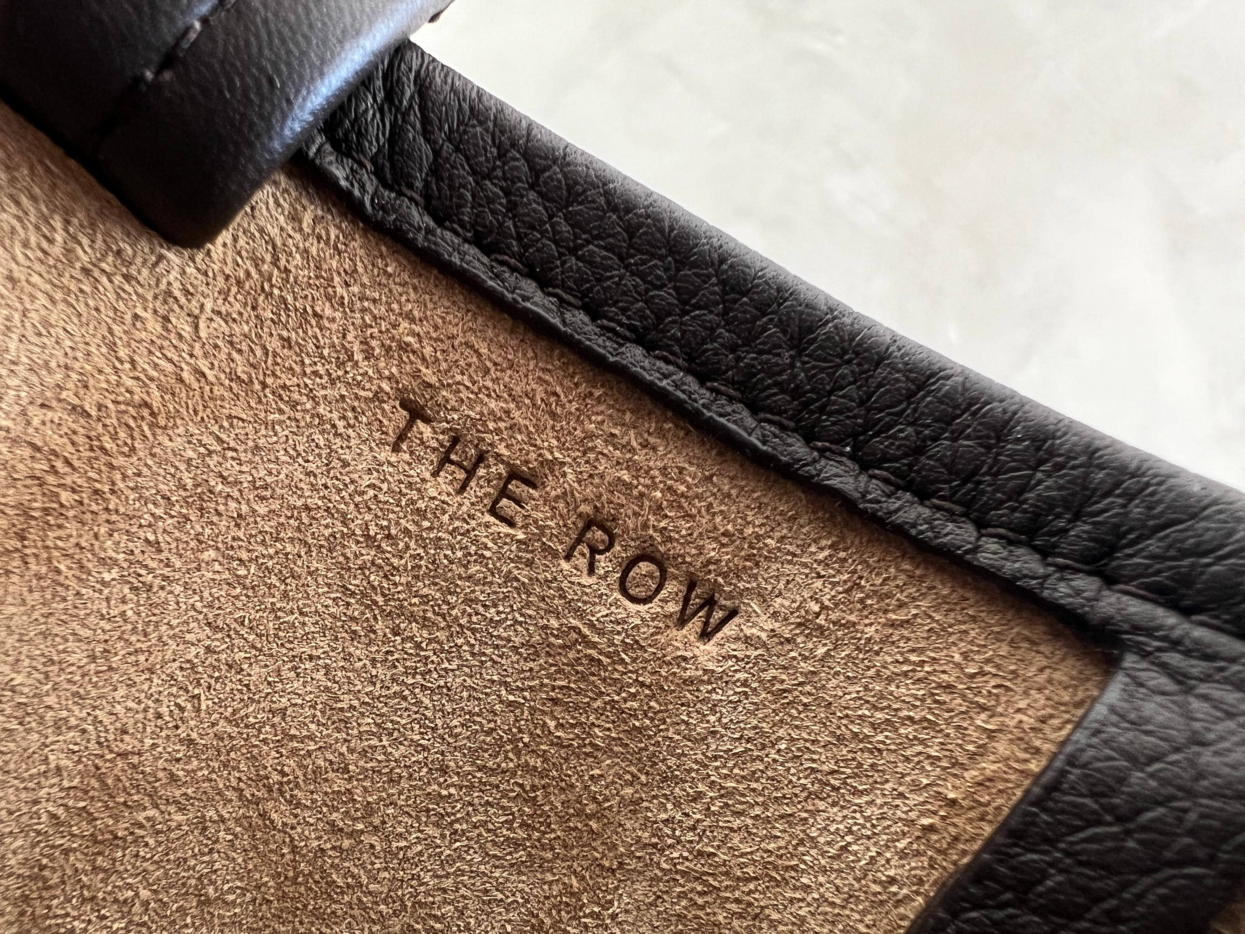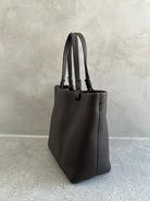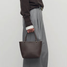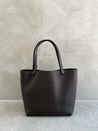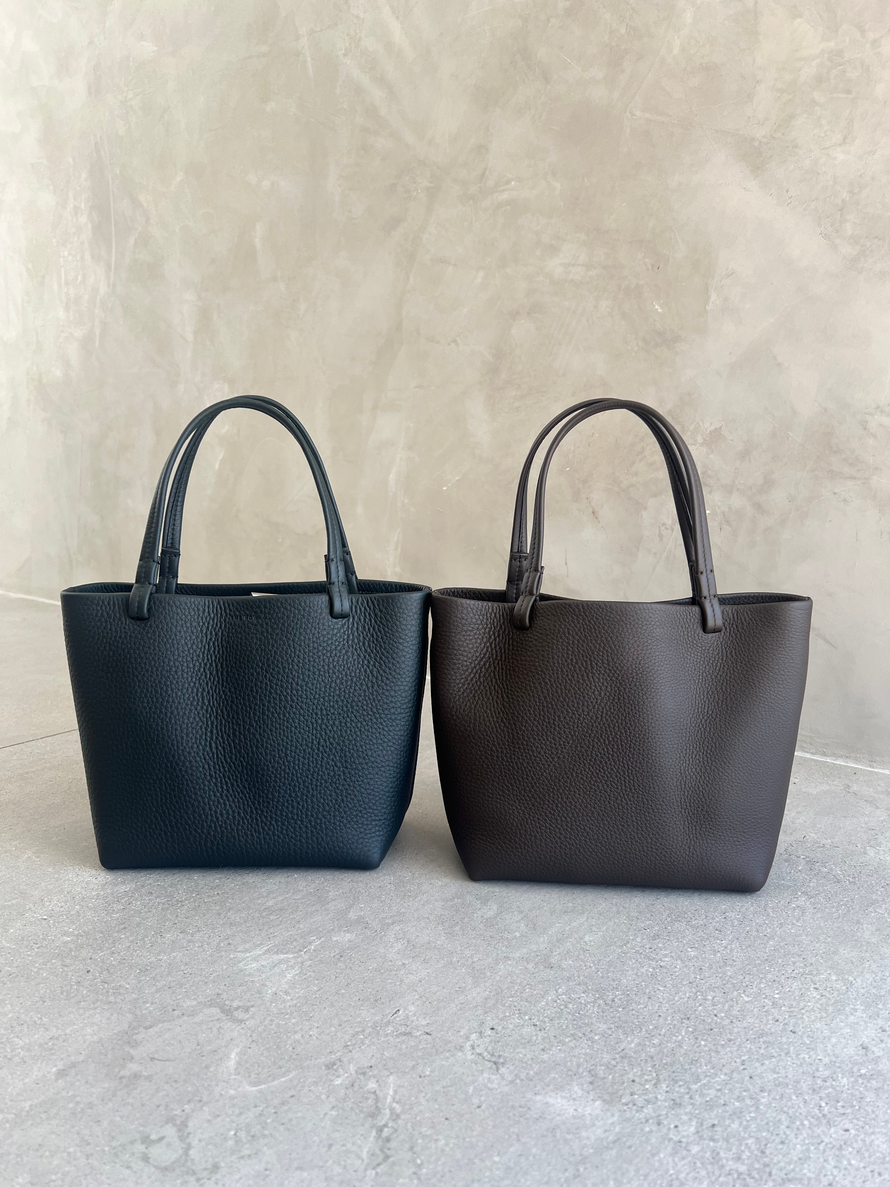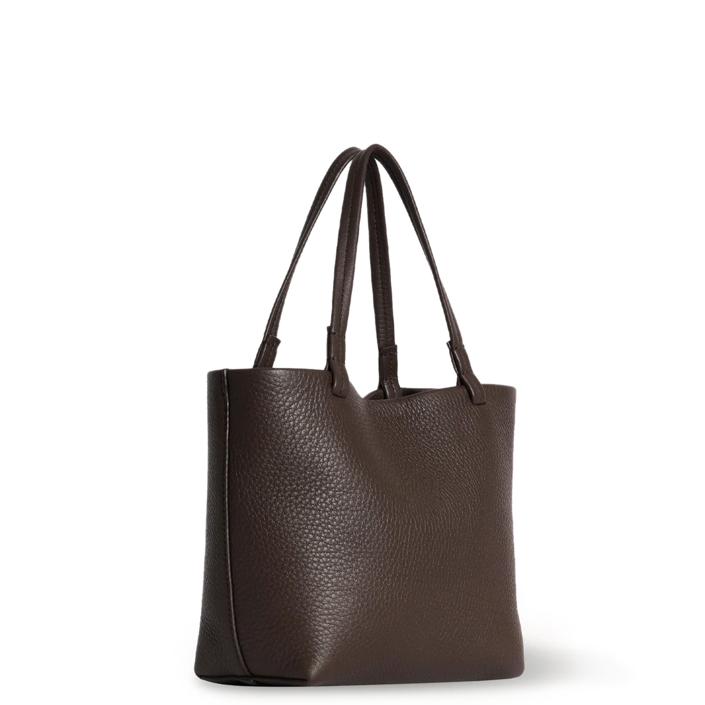 Small classic tote bag in textured calfskin leather with detachable shoulder strap, interior toggle closure, and flat handles.