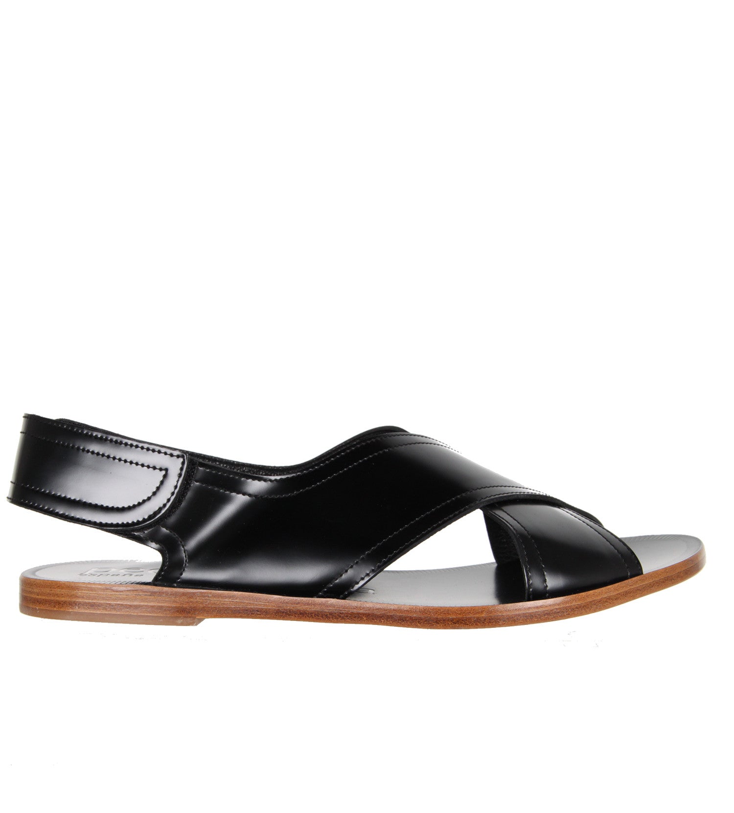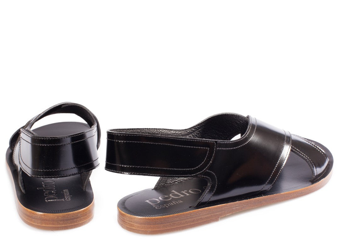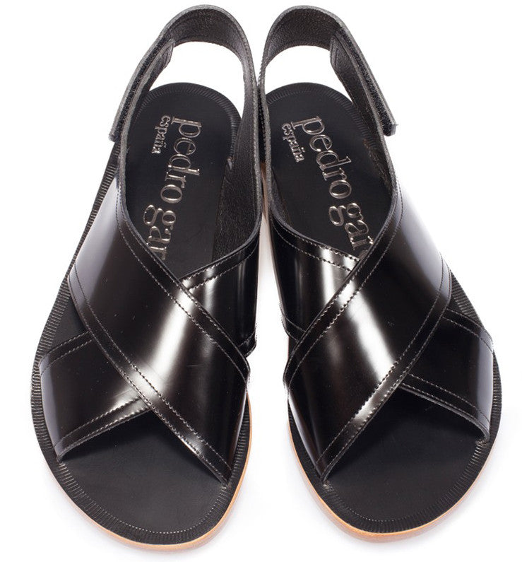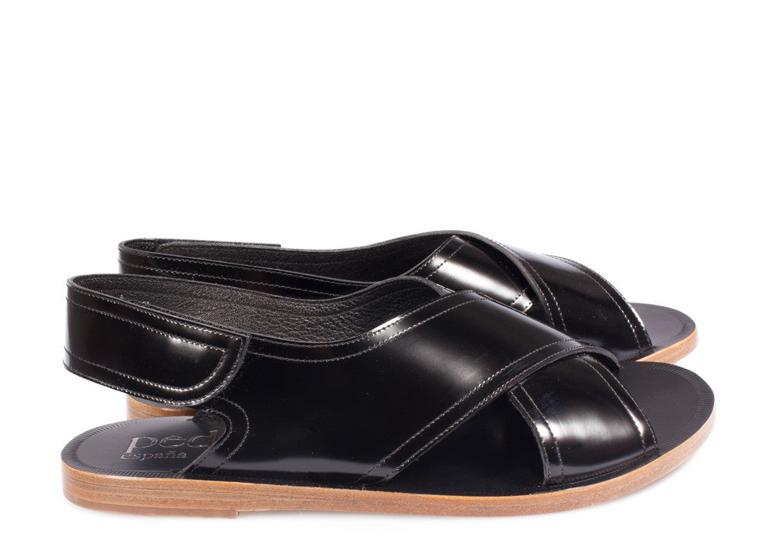 Flat crossover sandal in black Bakelite-calf. Calfskin upper, Velcro closure, textured goatskin lining, matching leather insole and sole with anti-slip TPU nibs, providing a base that offers outstanding abrasion resistance, toughness, and flexibility.