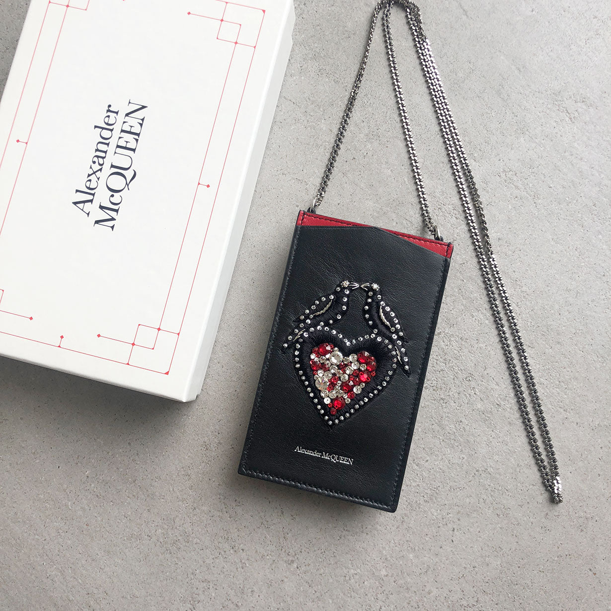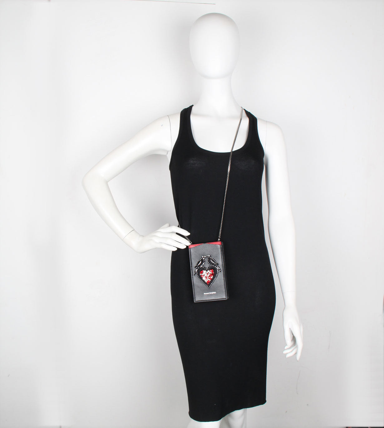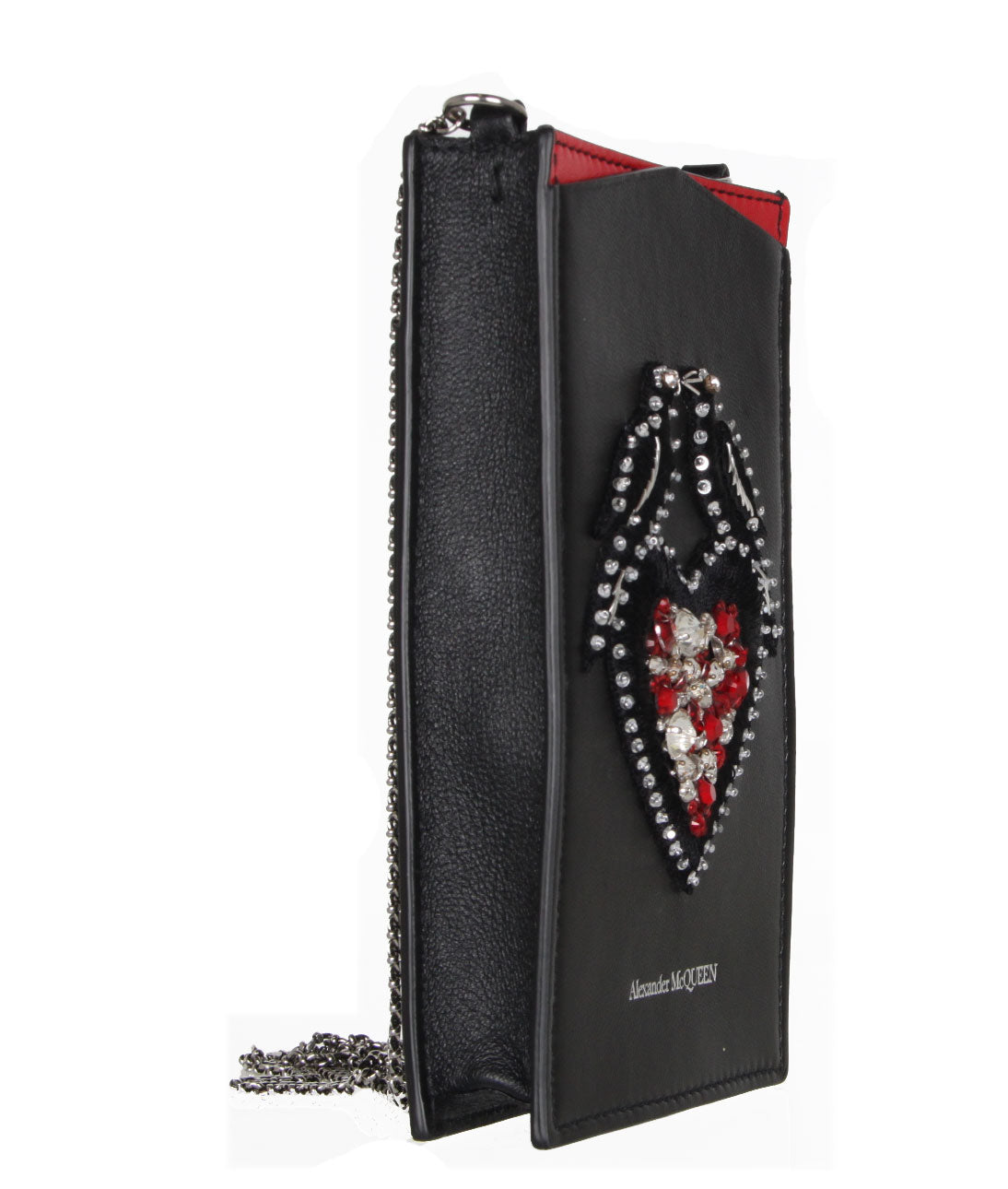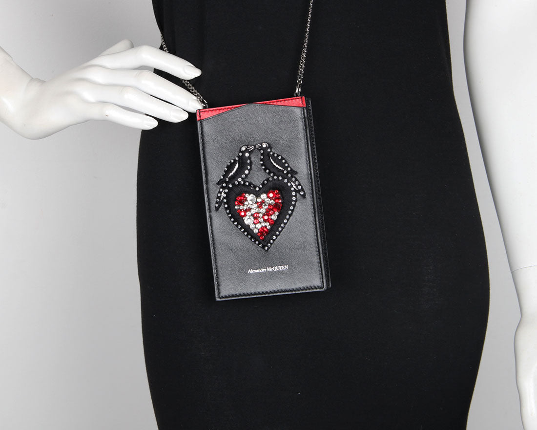 Alexander McQueen black calfskin leather phone case with a decorative metal skull and heart detailing. Features four credit card slots and one central compartment. Silver crossbody chain.