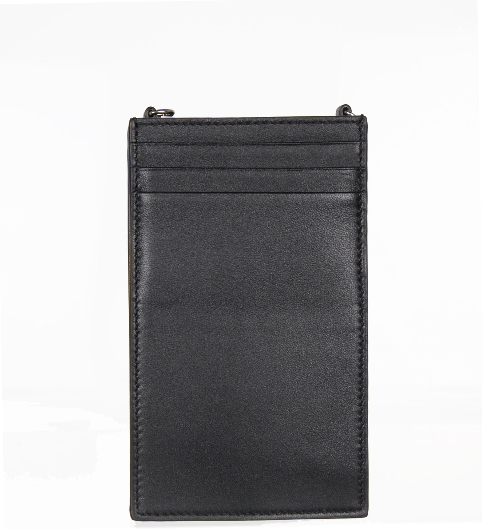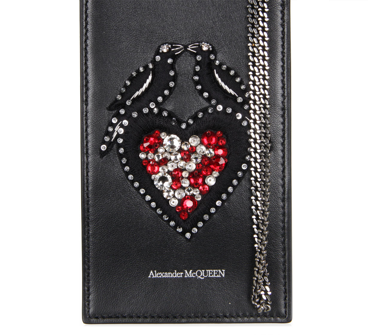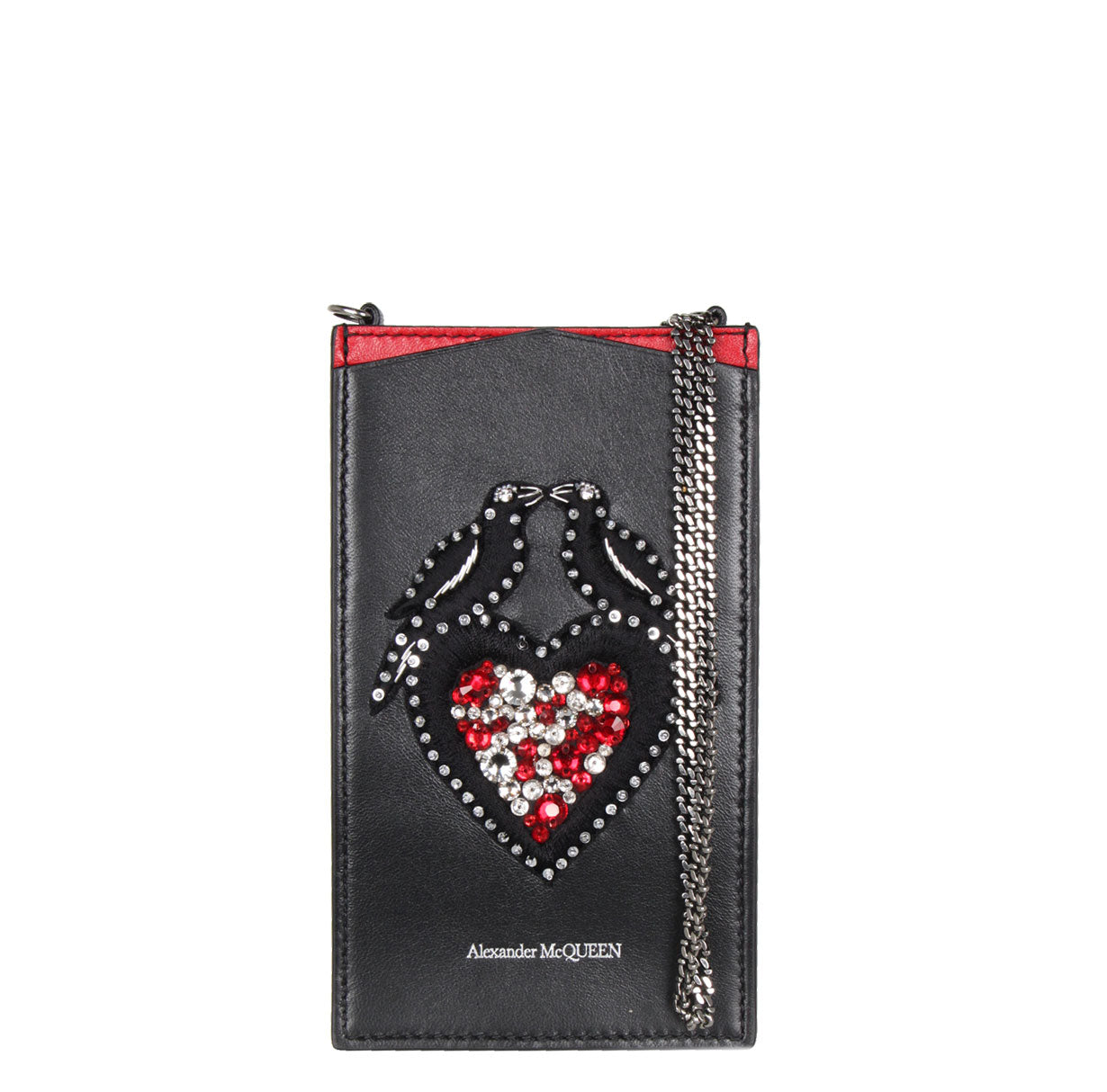 Alexander McQueen black calfskin leather phone case with a decorative metal skull and heart detailing. Features four credit card slots and one central compartment. Silver crossbody chain.