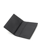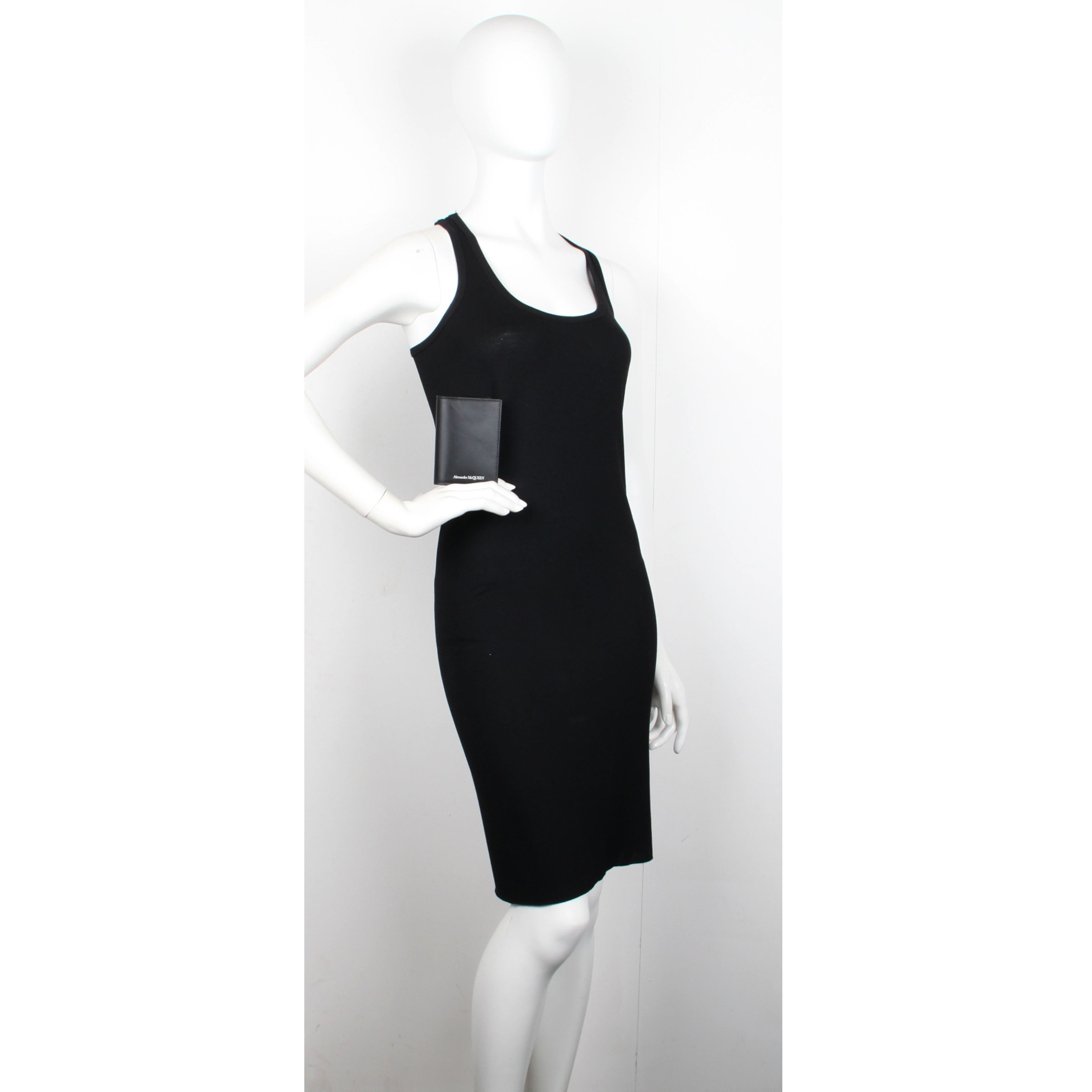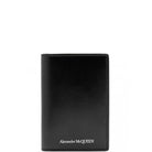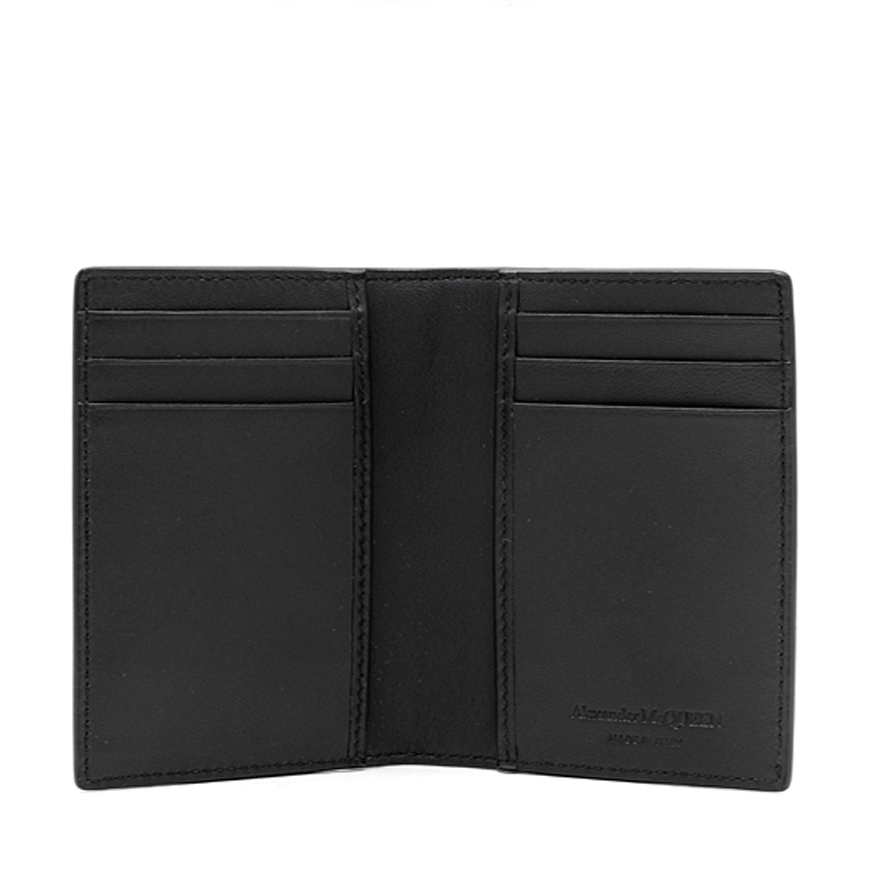 Black calf leather pocket organizer with silver Alexander McQueen logo embossed at the face. The organizer features six card slots and two flat pockets.
