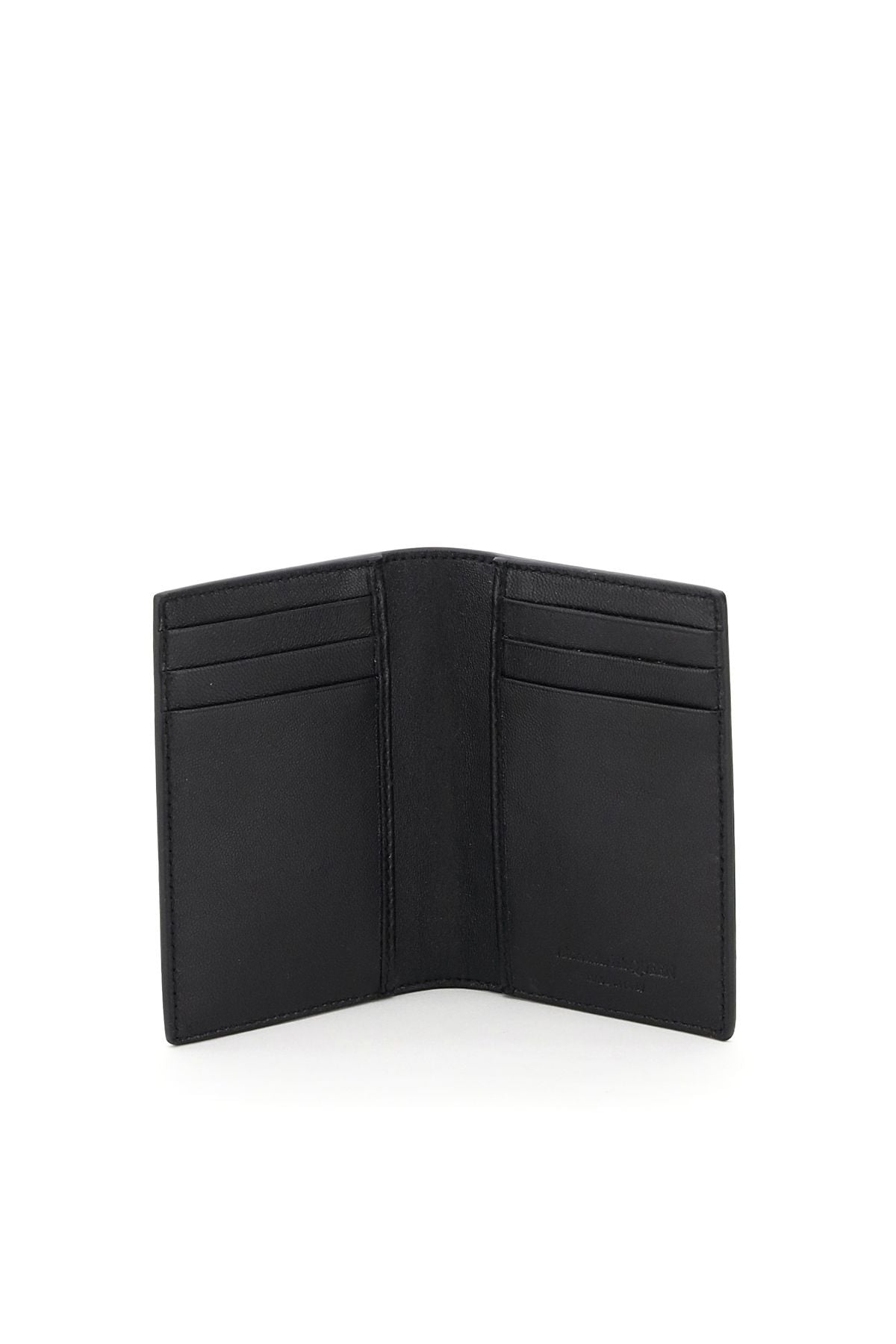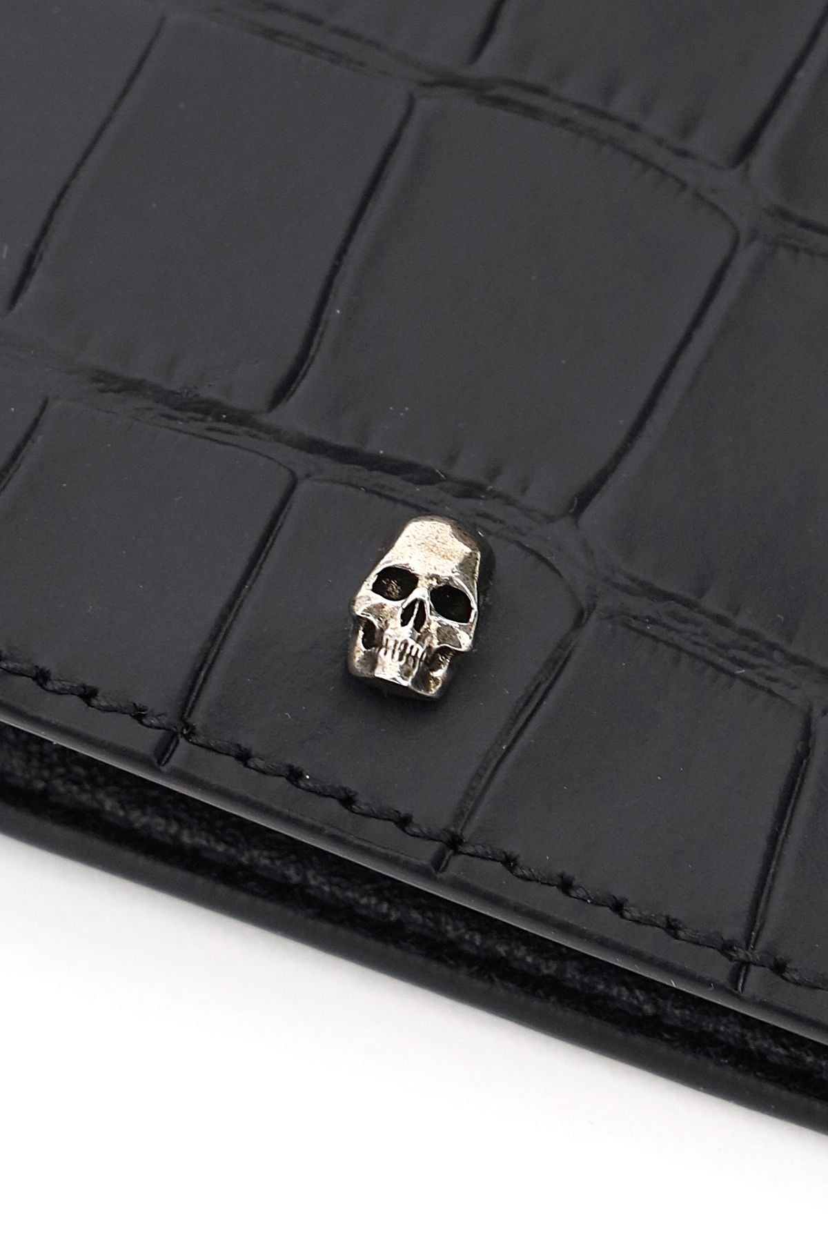 Alexander McQueen bi-fold pocket organizer in crocodile-embossed leather with the iconic silver-tone metal Skull applied on the front. Leather and fabric interior with two ticket pockets, six credit card slots, embossed logo.