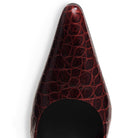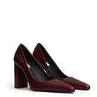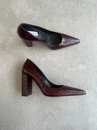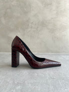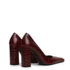 A Pointy toe pump with block heel wrapped in crocodile embossed calfskin leather with