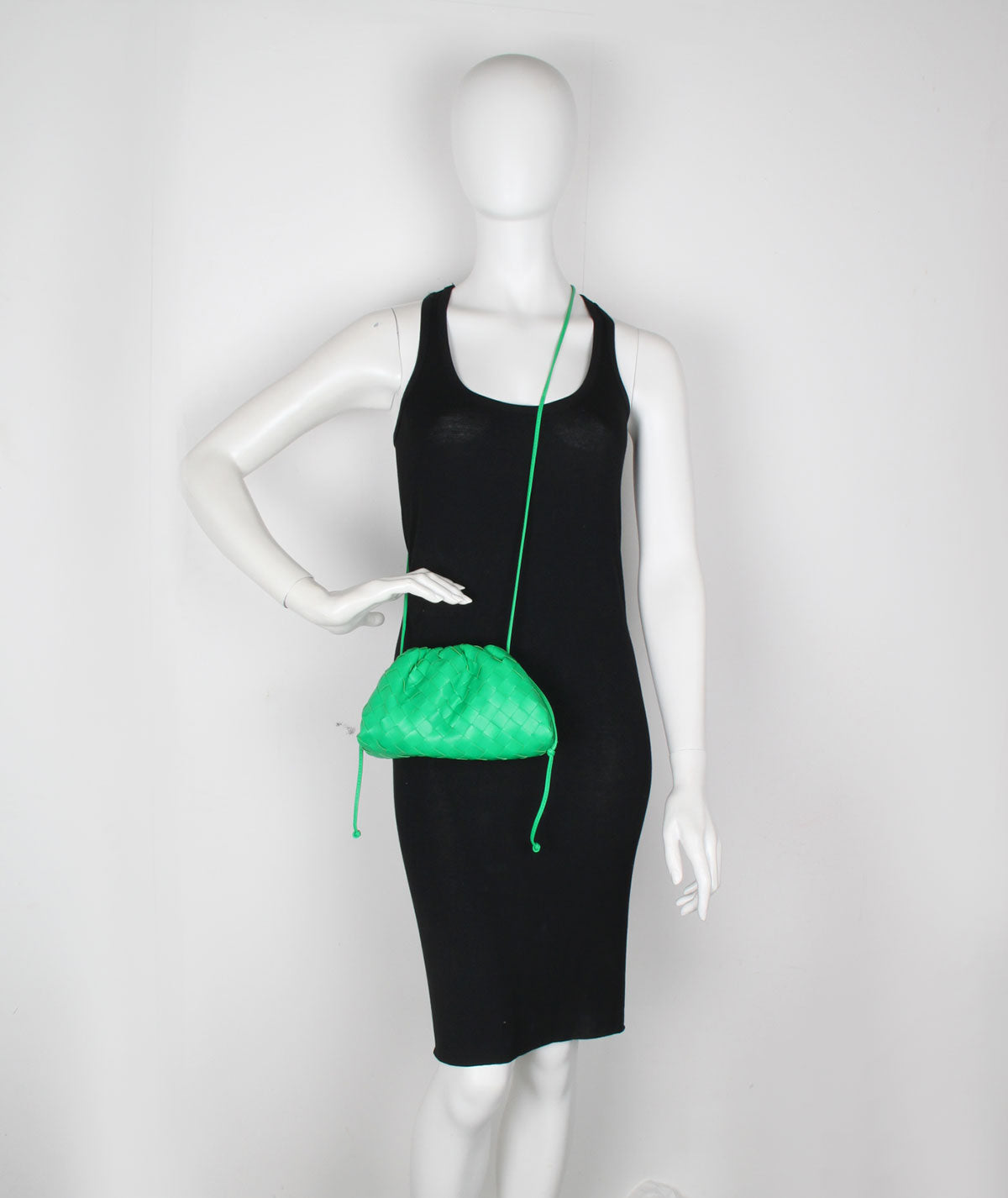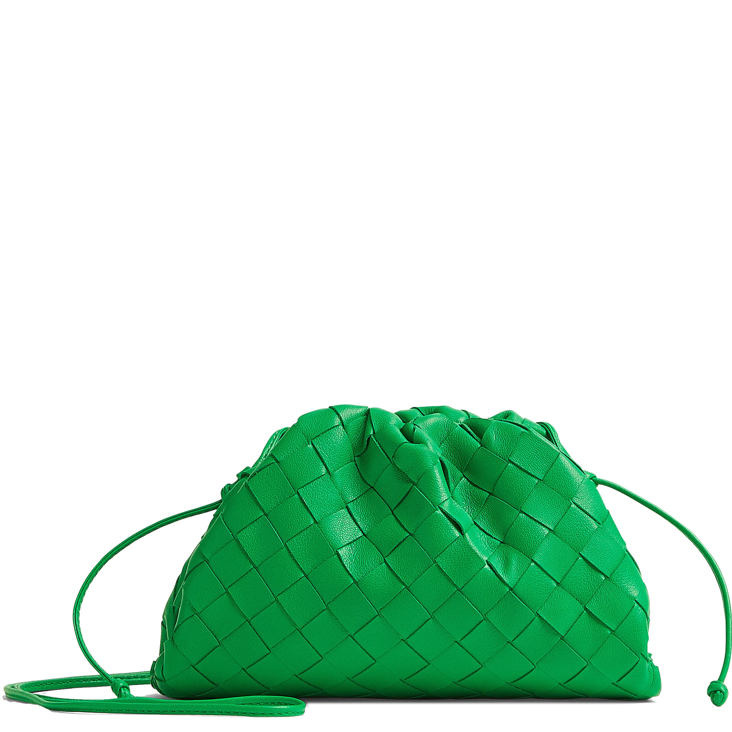 Soft voluminous clutch in woven leather. Magnetic frame covered in folds of handwoven leather. Iconic intrecciato weave in a subtly amplified new dimension. Single compartment lined in nappa. Slim leather shoulder strap. Smaller style of The Pouch, a brand icon that reflects Bottega Veneta’s heritage with a modern attitude