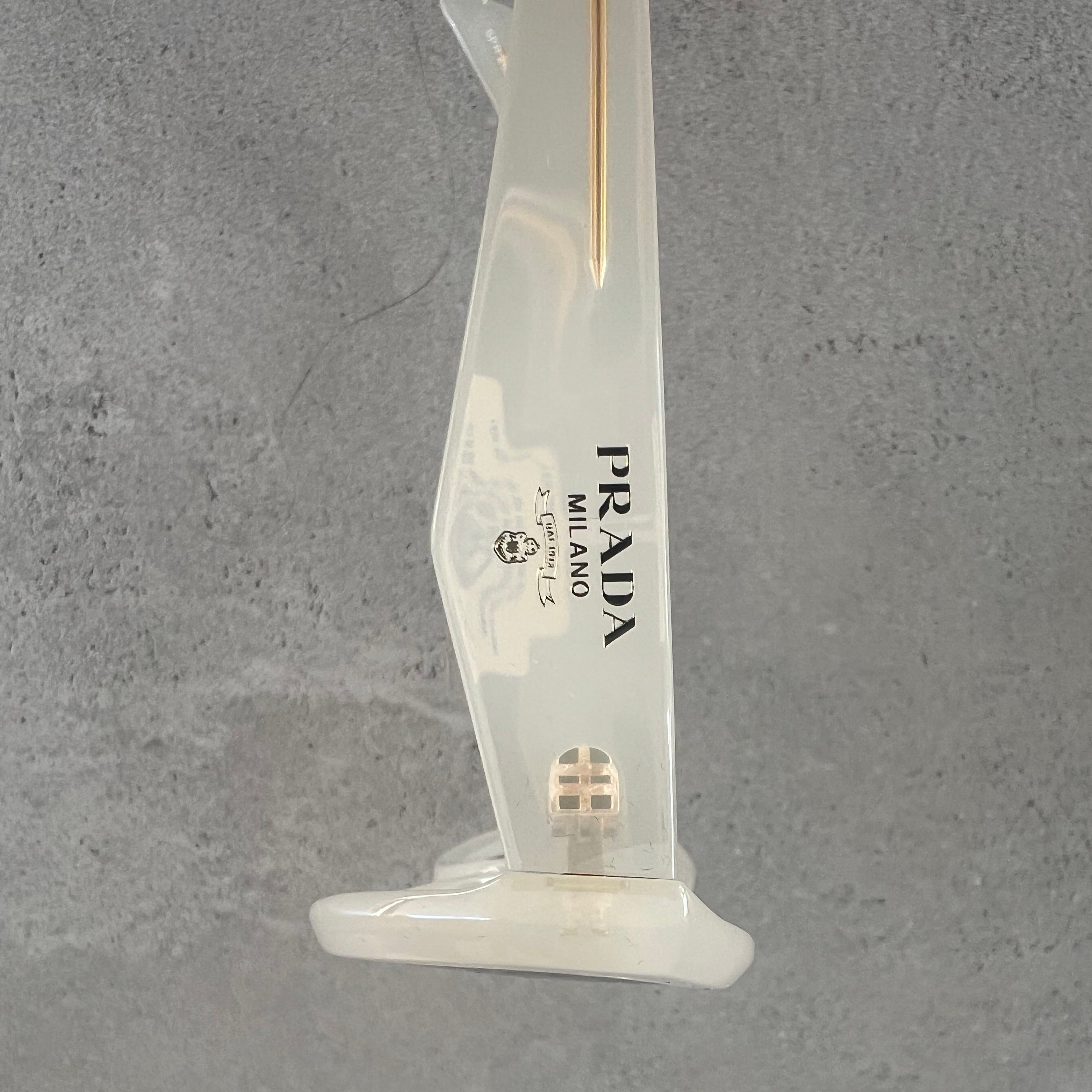 Prada Catwalk collection sunglasses model PR 26ZS opal with light brown lens. The slim temples are emphasized by a refined three-dimensional detail that iconographically interprets the triangle logo of the fashion house.