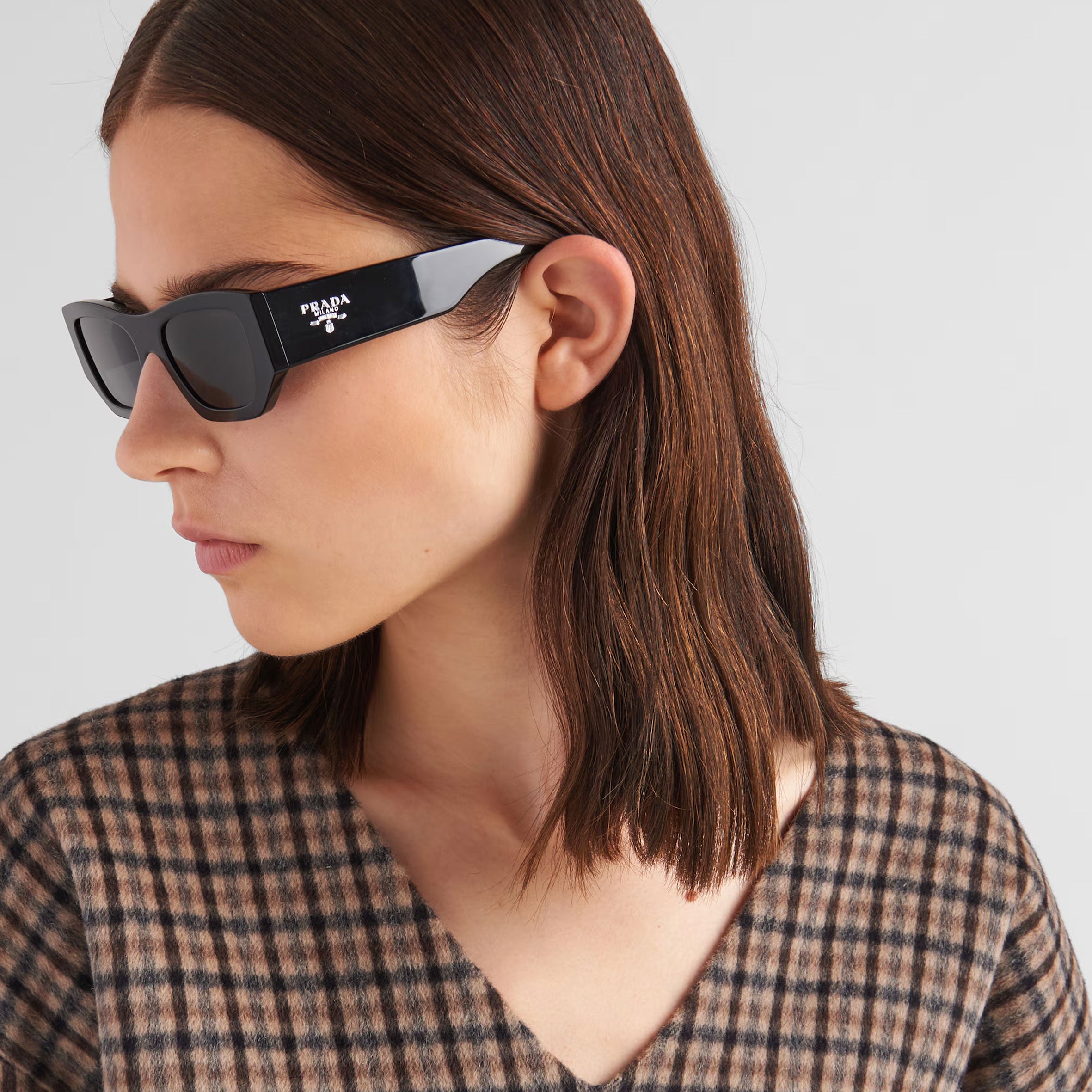 Prada sunglasses unisex model A01S featuring black frame and dark grey lens with high bridge fit. The sophisticated front with bold rims is combined with chunky temples embellished with the iconic Prada logo.