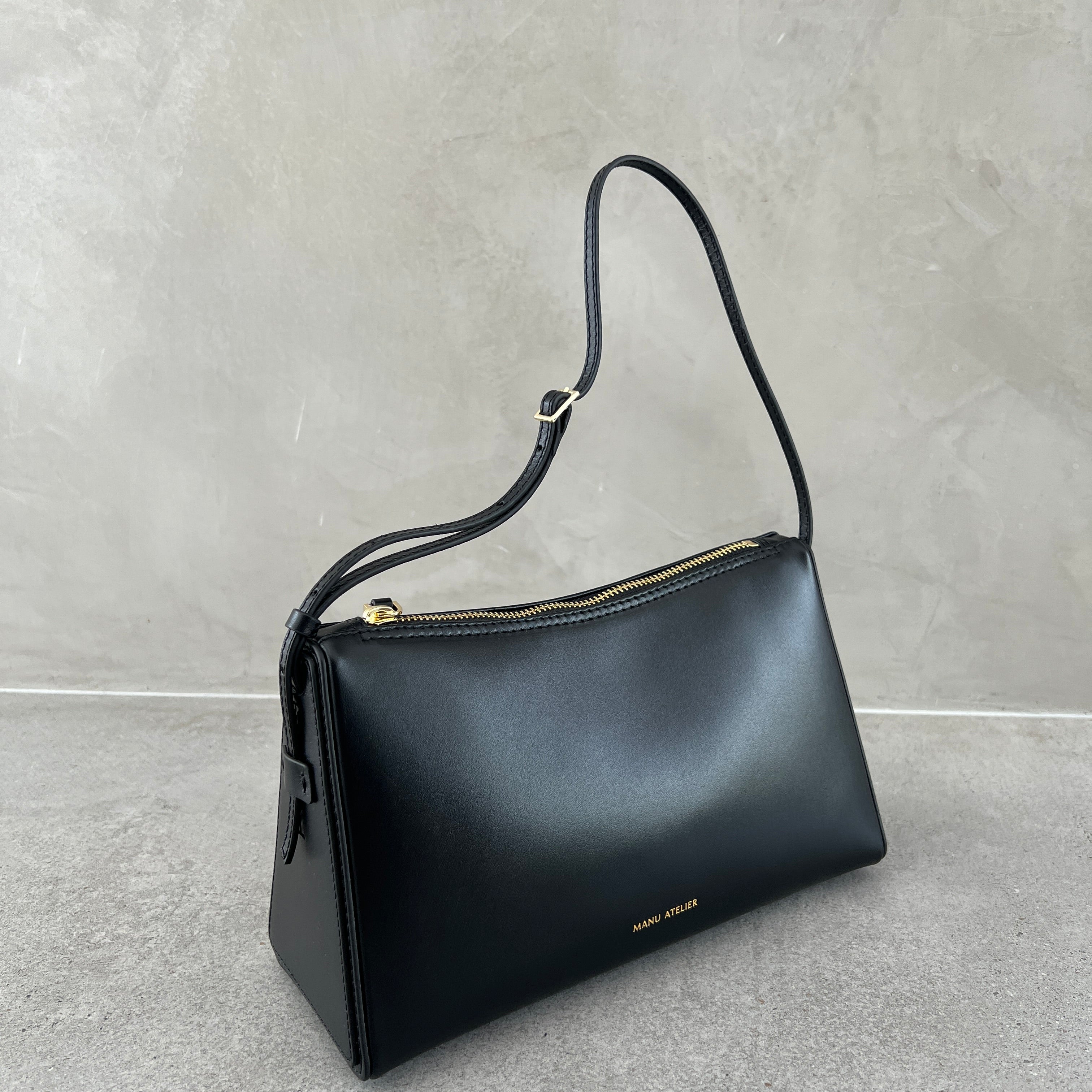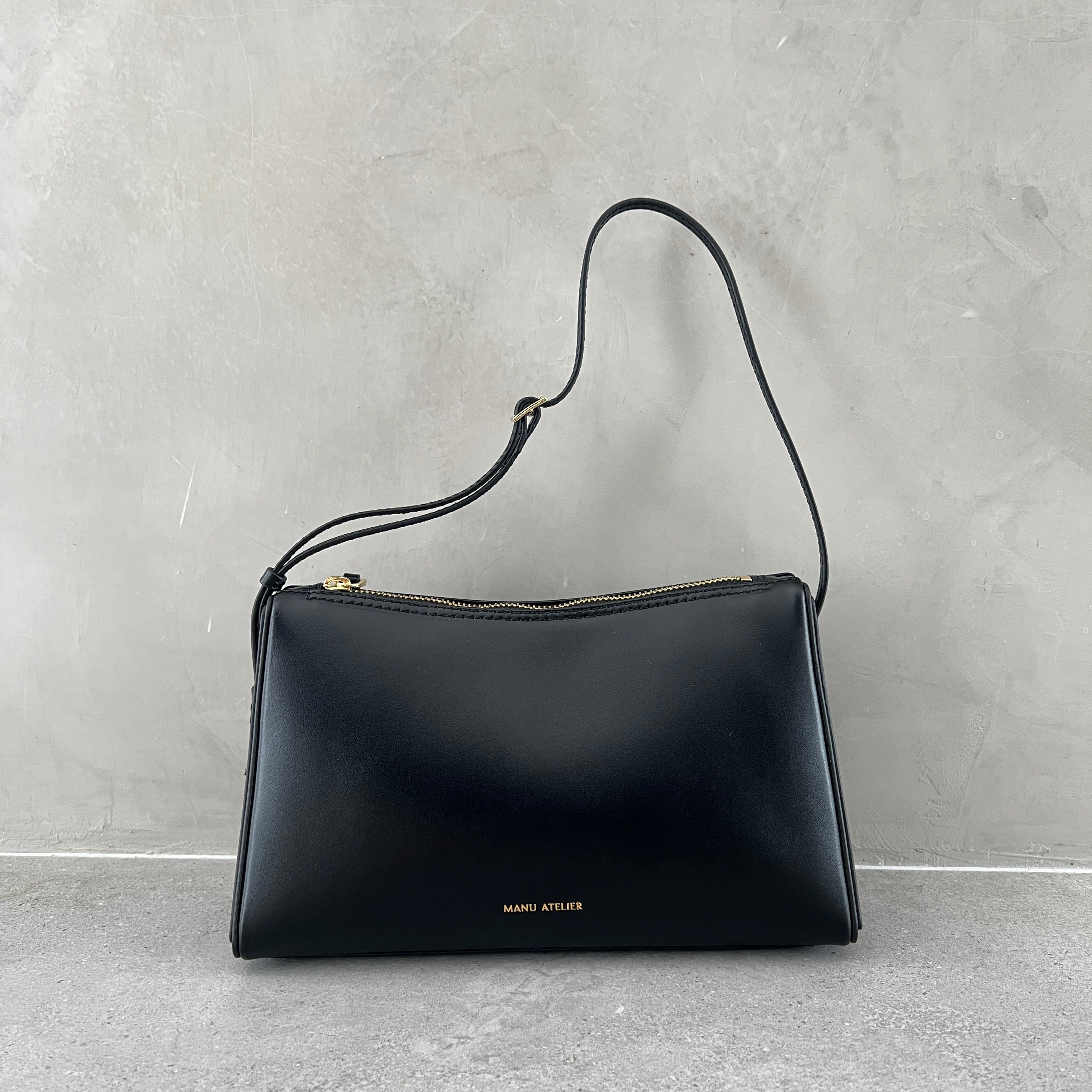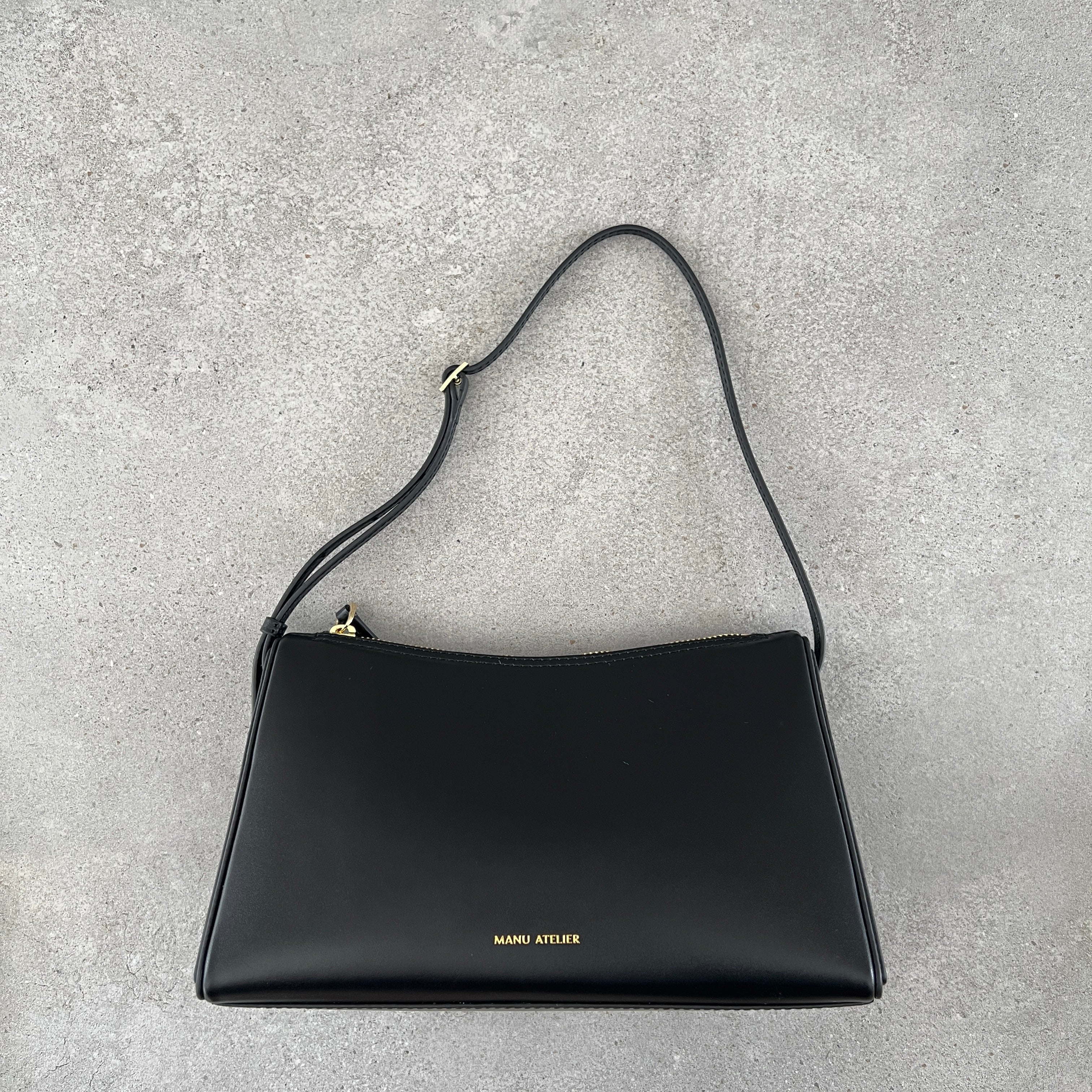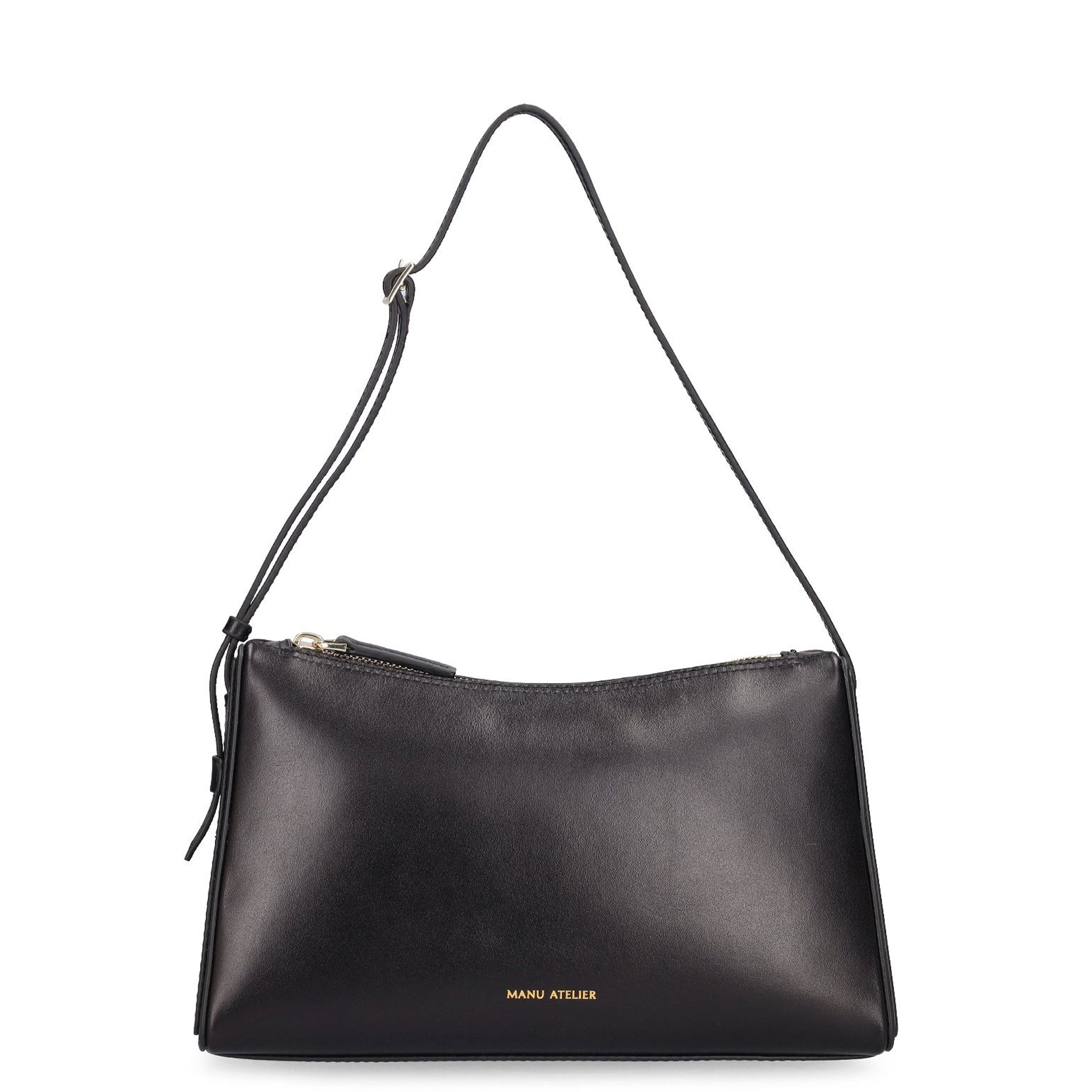 A shoulder bag featuring vegetable tanned leather with a Manu Atelier embossed logo. It features an adjustable leather strap and an interior zipped pocket.