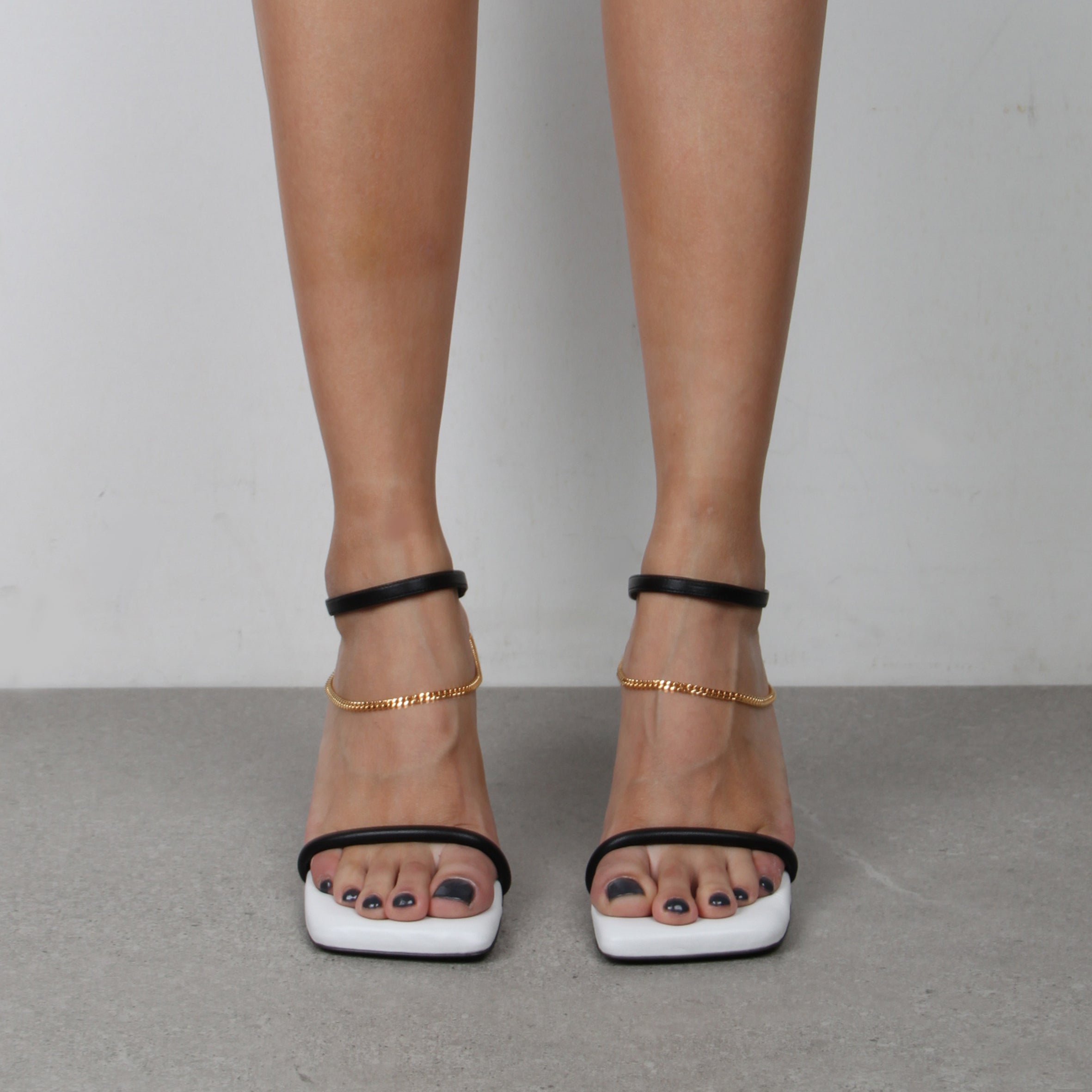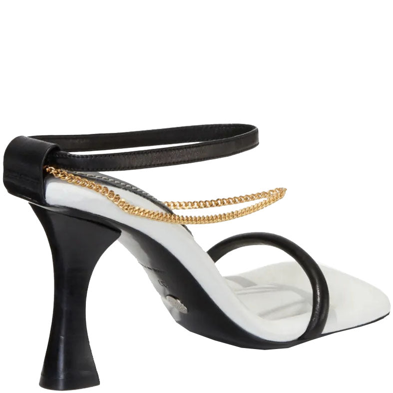 The Chained High Heel Sandals in black and white are crafted in supple leather and feature a padded front strap and a slim ankle strap. Gold-tone metal ankle chain. Contrast padded insole. Slip-on design. Open square toe. Fluted high heel. Contrasting leather sole.