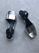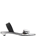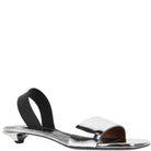 The Open Slingbacks feature an open toe and an angular kitten heel. They are crafted in smooth patent silver leather and secured with a rubberized slingback.