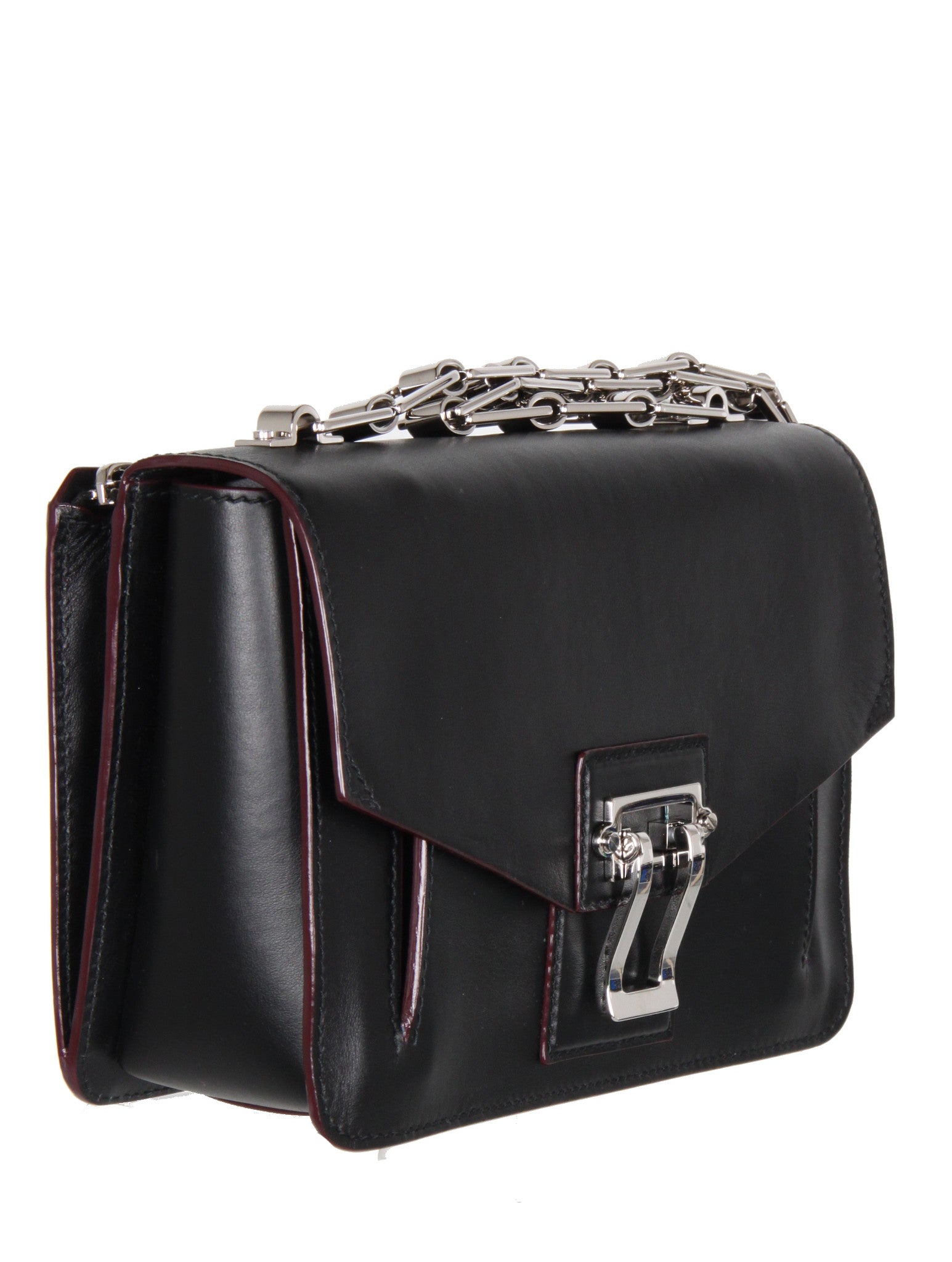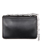 Leather flap front bag with top handle, adjustable shoulder strap, and push lock closure. Additional front compartment accessible through hidden zippered closure. Sides slightly expandable with small leather covered snaps. One compartment with inner zipper pocket. One back zipper pocket. Proenza Schouler stamped on center back.