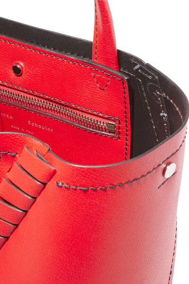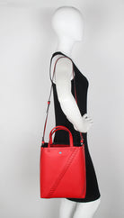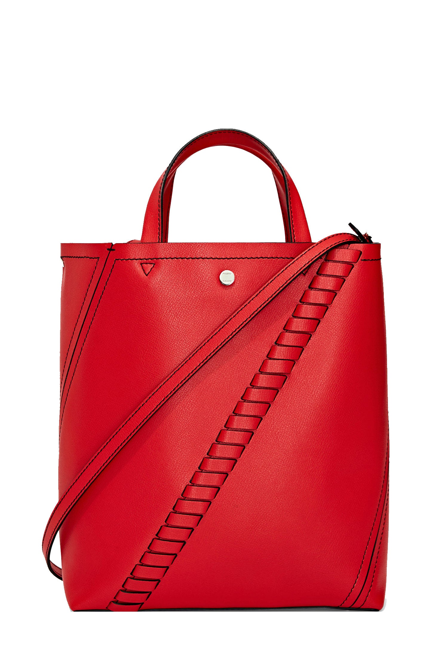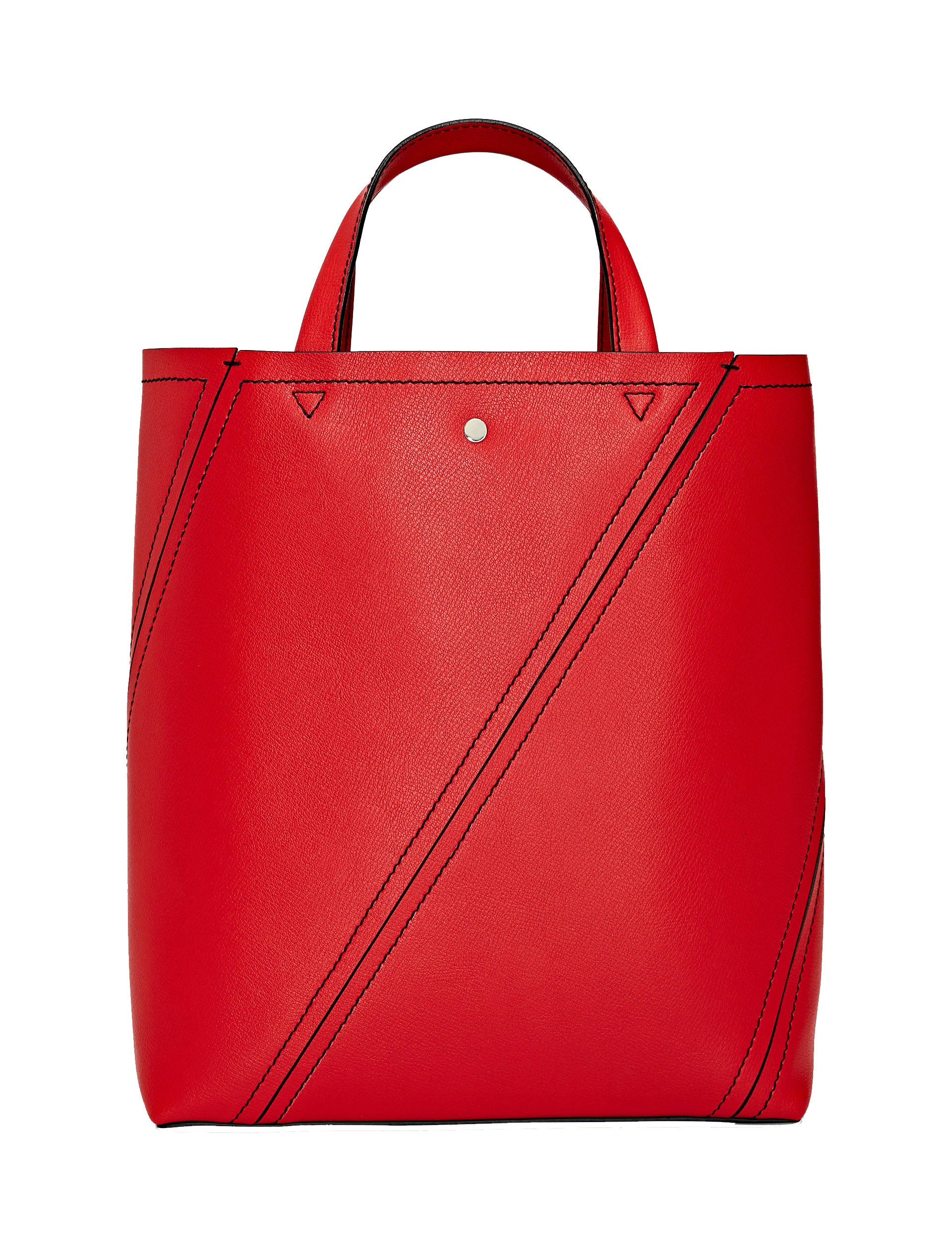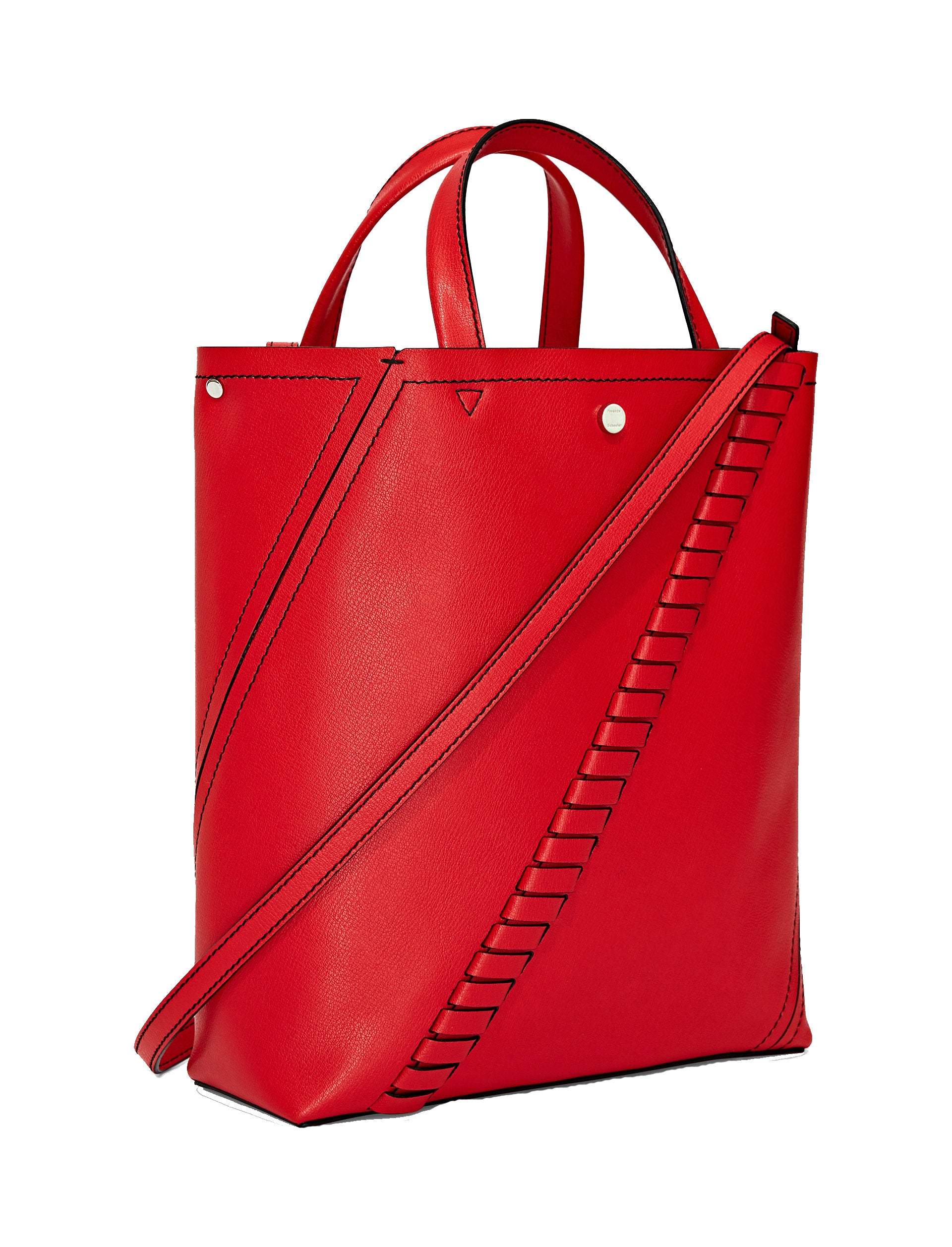 From an elegantly structured silhouette, this Hex Tote combines classic design elements including asymmetric top-stitching and whip-stitch details. Sculpted from a sleek calf leather, a unique spiral construction is highlighted amongst the natural leather composition and hardware. The top handles allow the piece to be carried by hand, and the removable and adjustable strap allows the bag to be carried on the shoulder or across the body. Magnetic snap closure.
