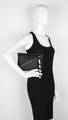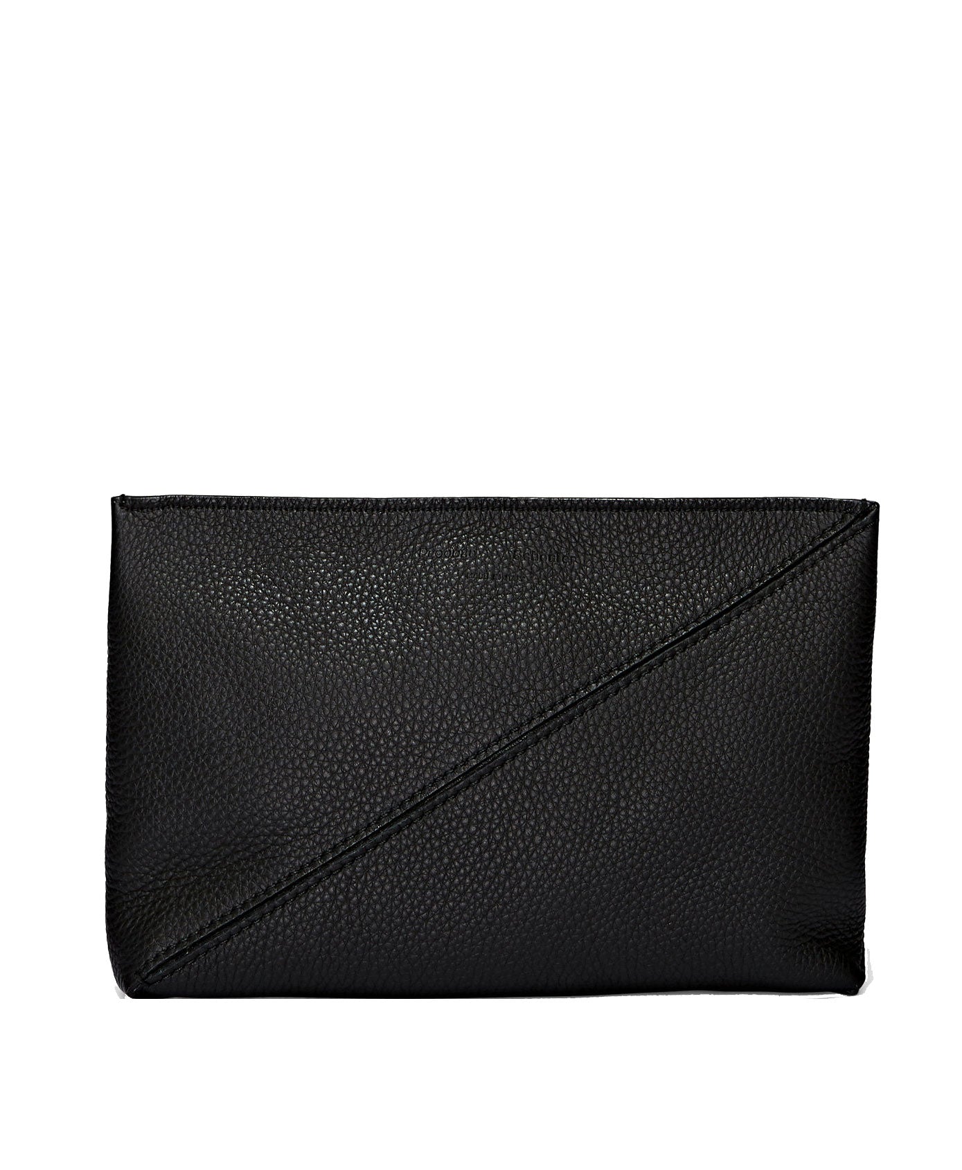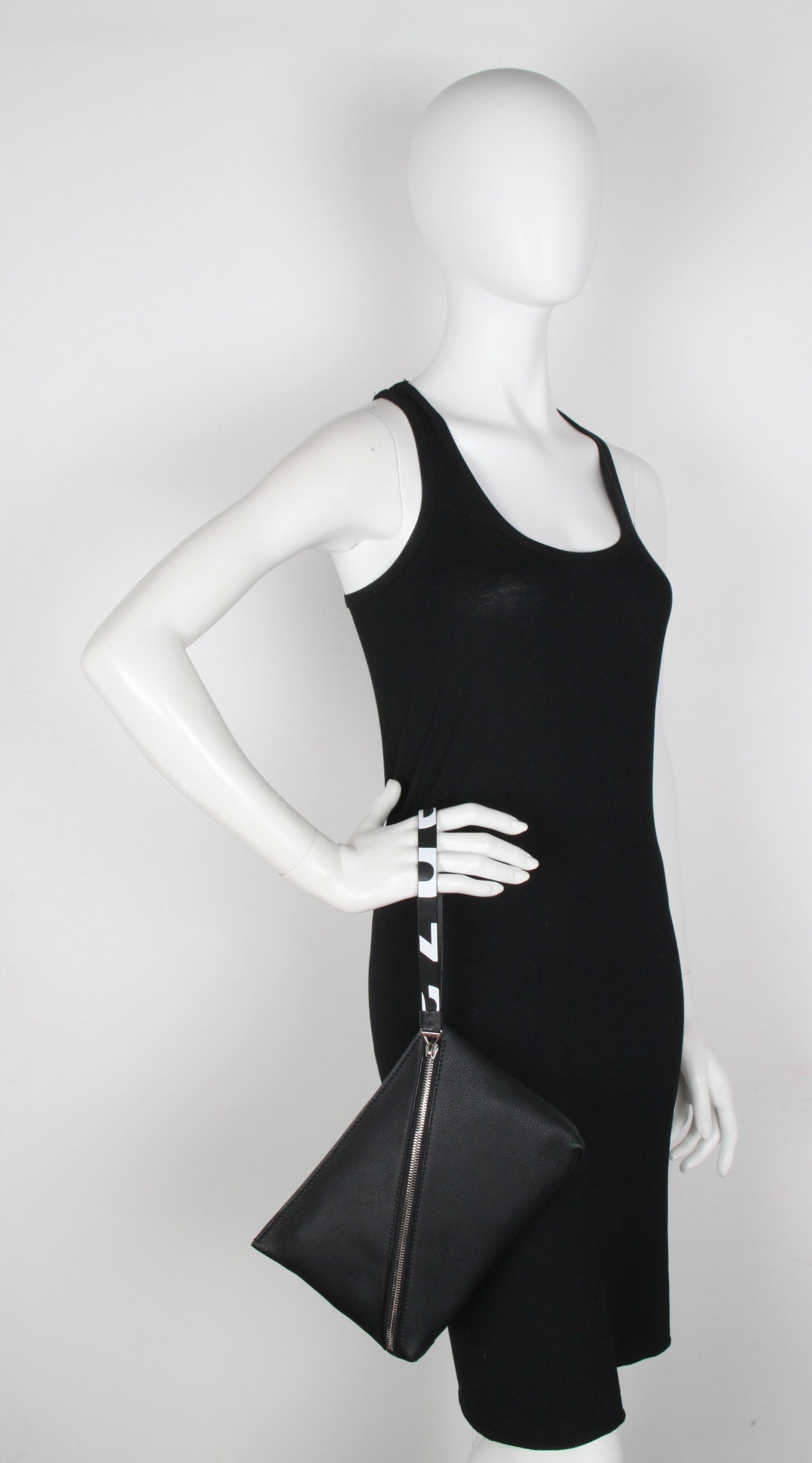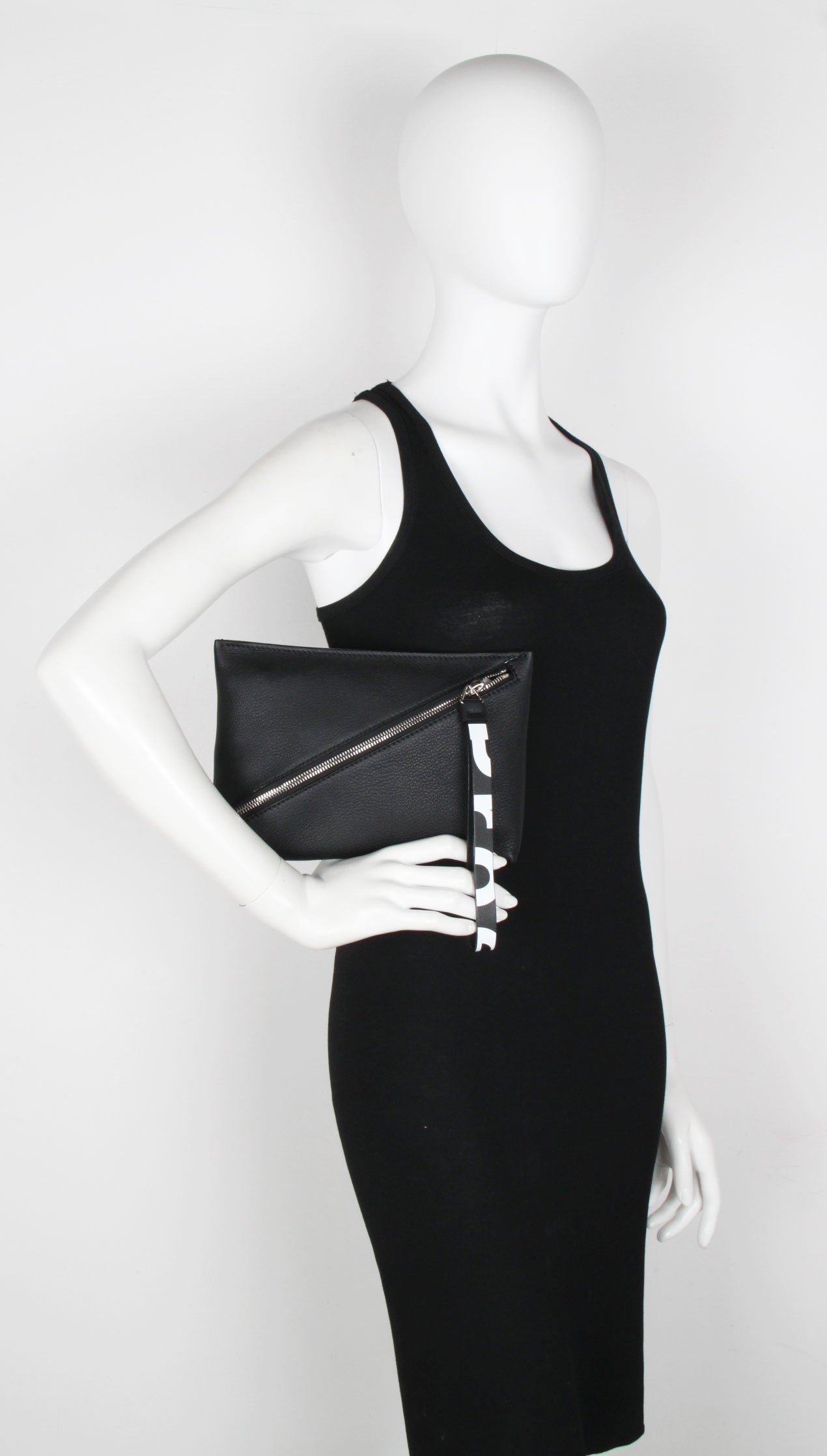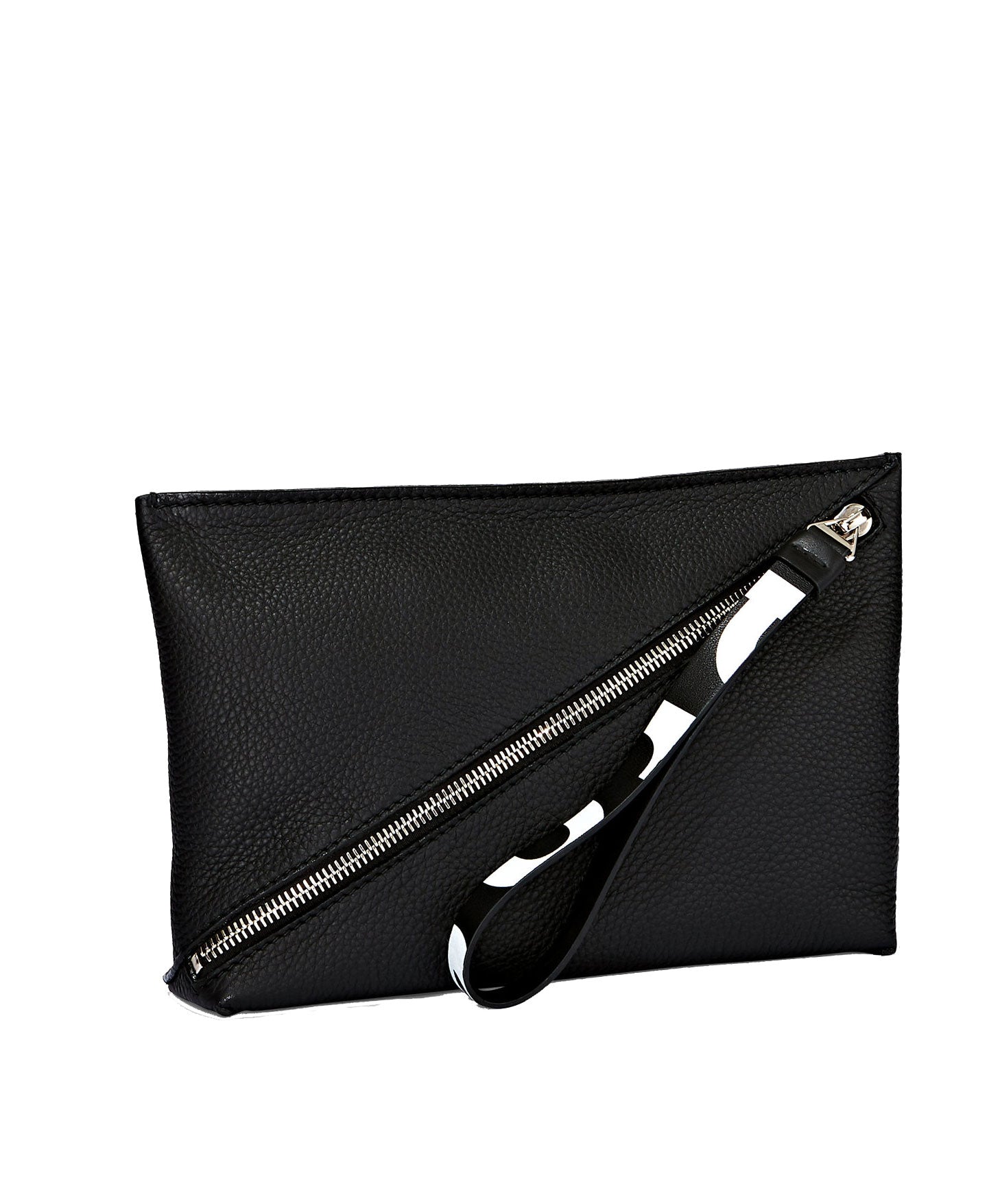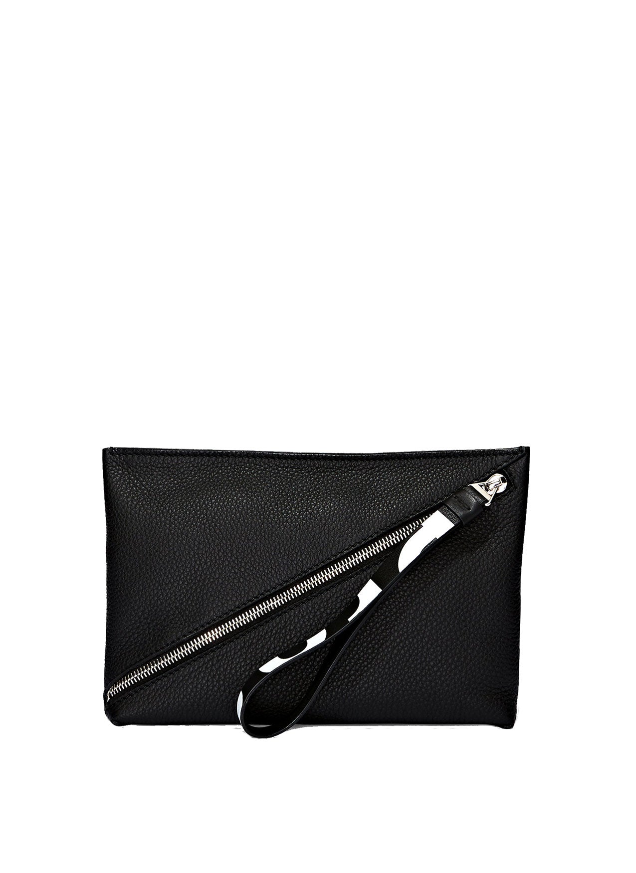 Crafted from a pebbled leather, the pouch is secured by a diagonal zip and connected pull strap featuring an exaggerated version of the signature Proenza Schouler logo alongside metallic hardware.