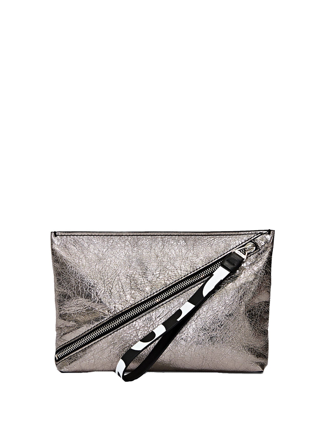 Crafted from metallic leather, the pouch is secured by a diagonal zip and connected pull strap featuring an exaggerated version of the signature Proenza Schouler logo alongside metallic hardware.