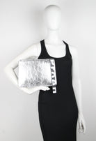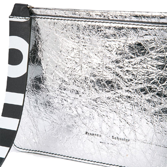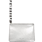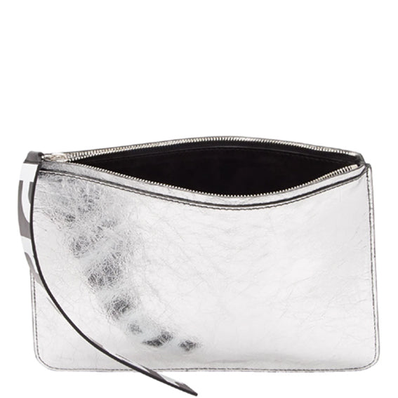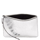 Crafted in silver crinkled calf leather, the Metallic Medium Pouch features a geometric shape, top zip closure, and spacious interior compartment. Includes a logo printed leather tag and logo embossing on the front.