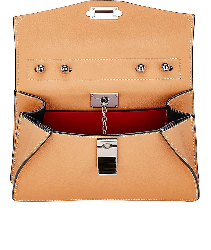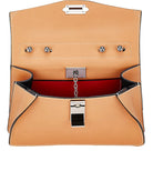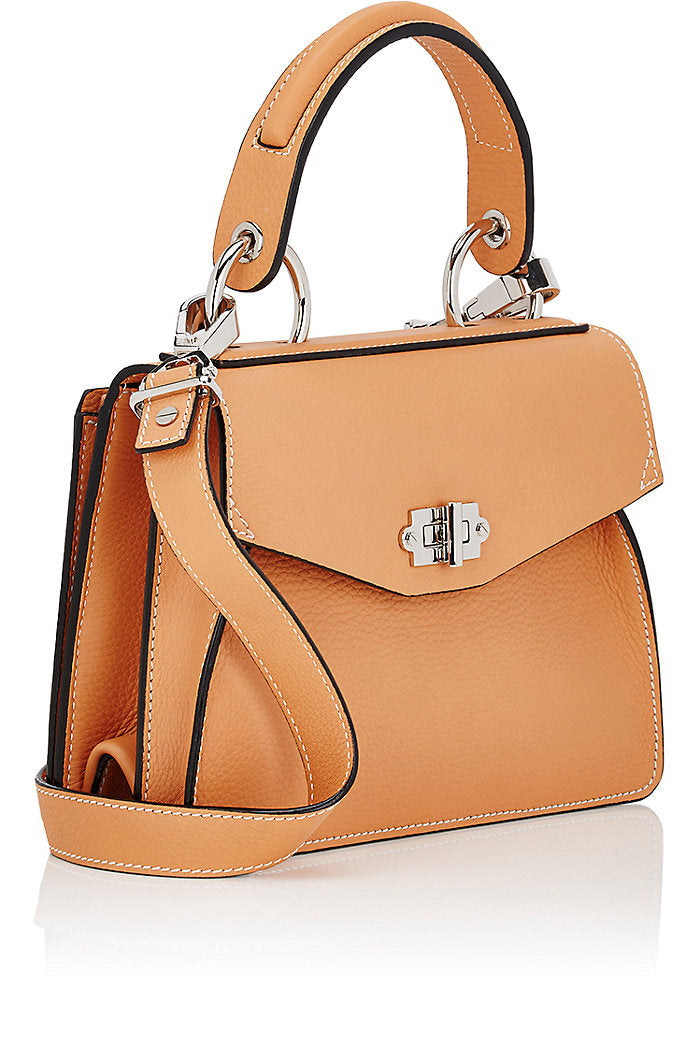 Grain leather small top handle handbag with painted edging. Includes adjustable, detachable shoulder strap. Leather lined with one internal pouch pocket and external back zip pocket. Features signature metal turn-lock closure, additional hidden toggle, and gusset detail.