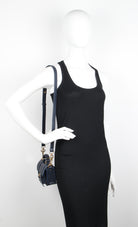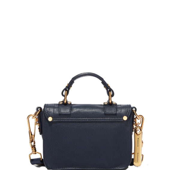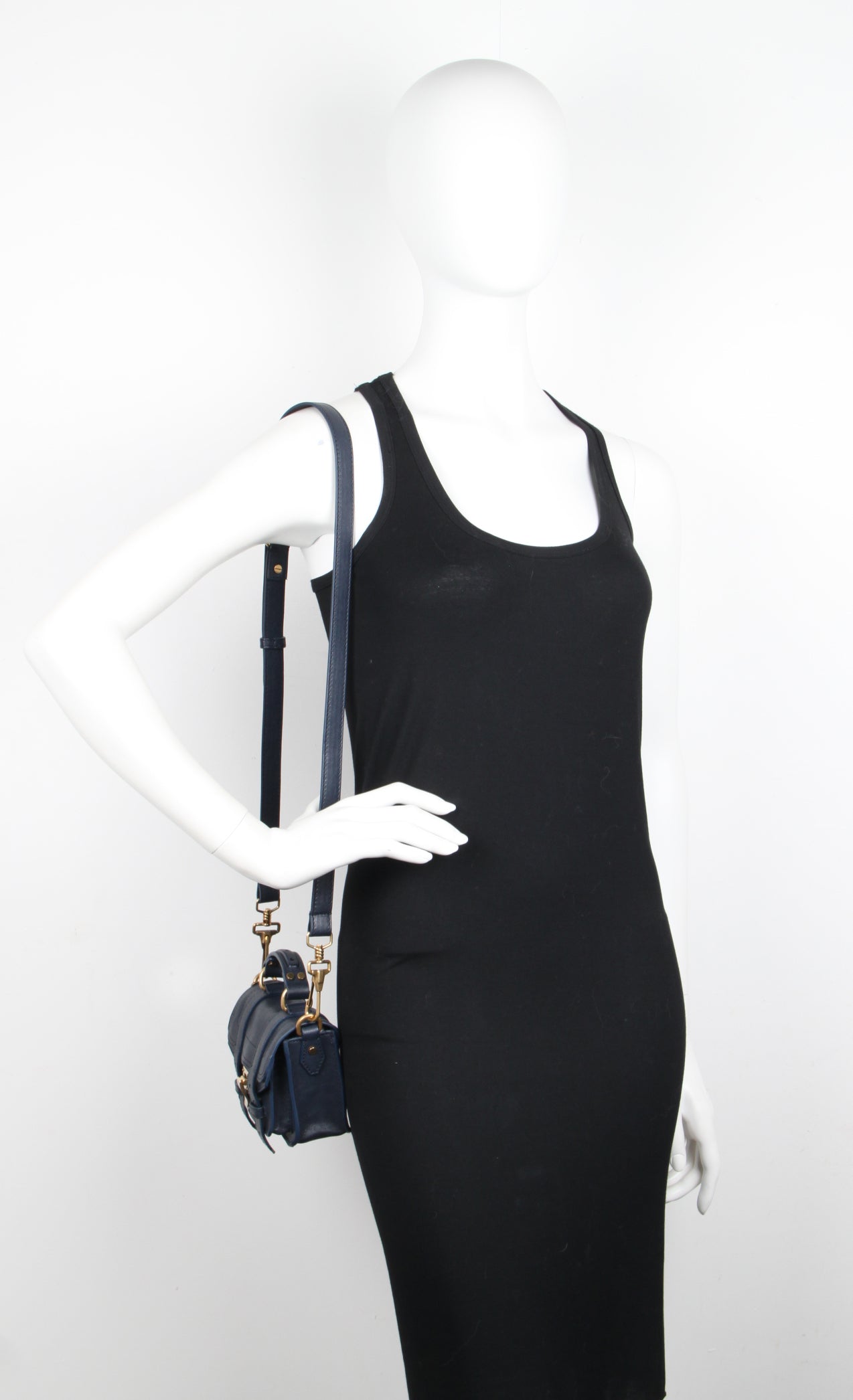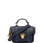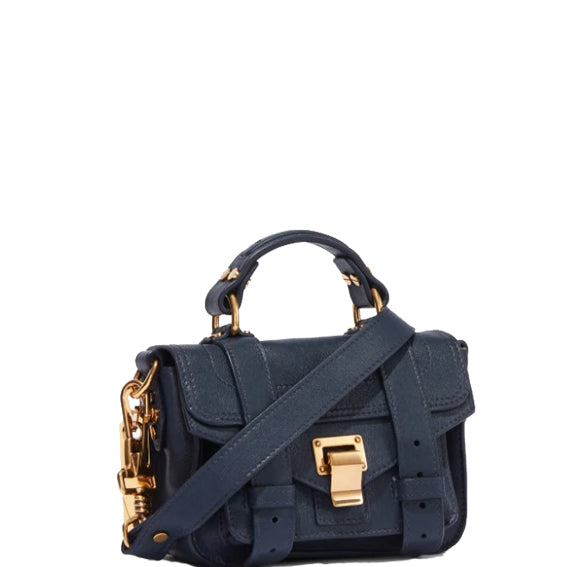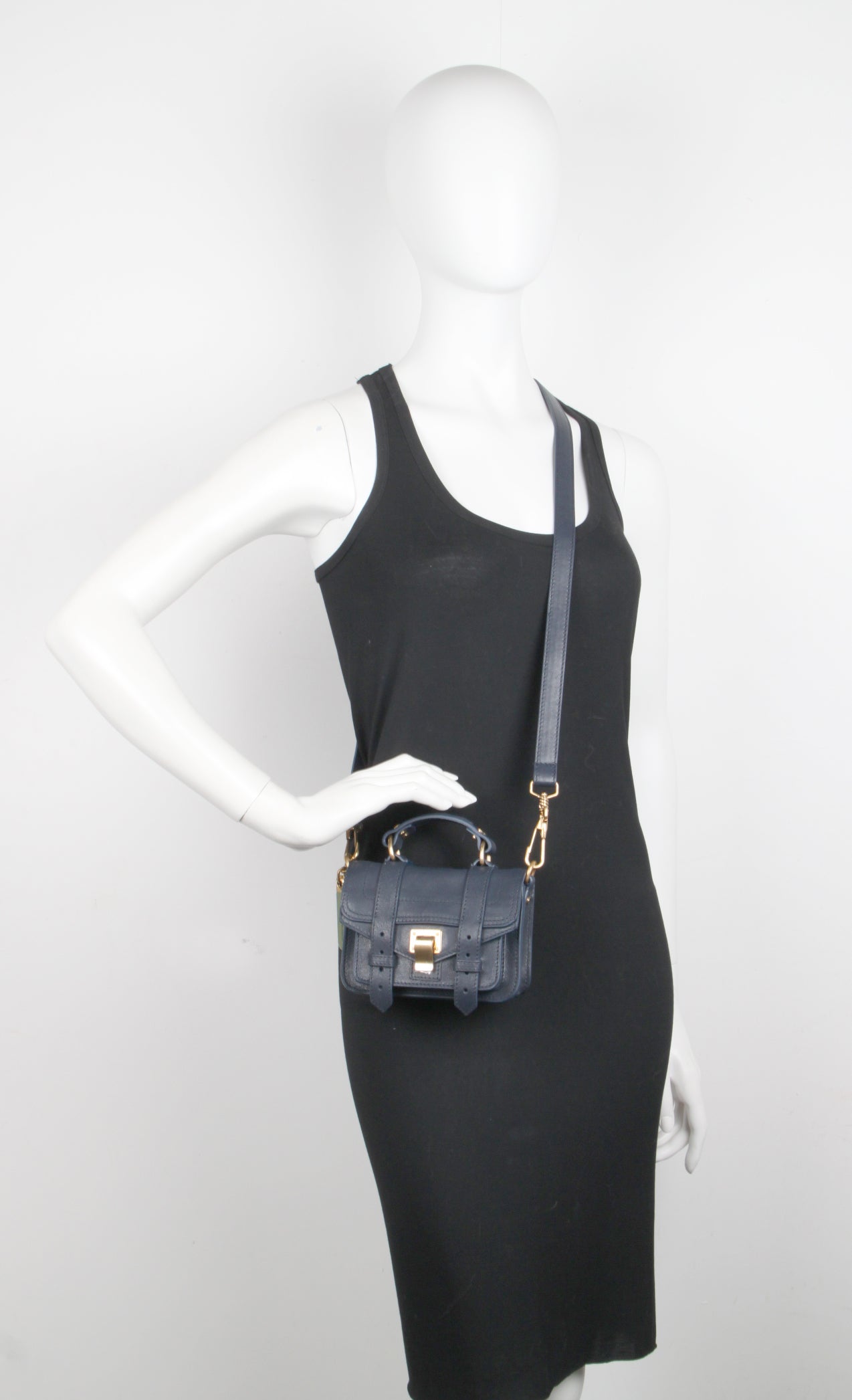 The PS1 Micro is crafted in midnight blue leather and secured by a signature gold-tone tab closure and belted straps. The exterior features a gusseted compartment on the front. Includes a sculpted top handle and a removable, adjustable shoulder strap. Embossed logo tag. Canvas interior lining