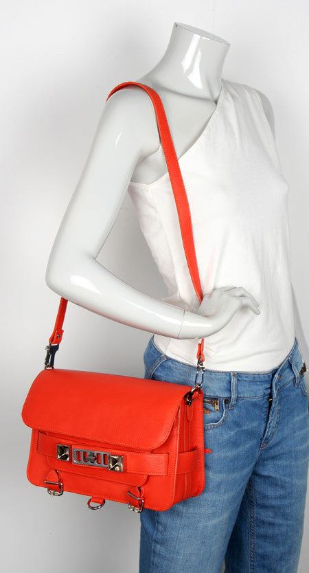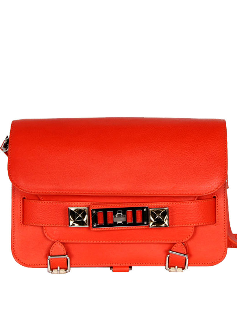 Grained leather flap front bag with snap close flap top. A secondary flap pocket is opened with double-tab turn-lock grill-fastening tabs deatiled with faceted cube embellishment. Main compartment is lined with fabric and has one zip pocket. Exterior zipper pocket at back. Adjustable/detachable shoulder strap.