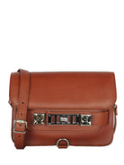 Grained leather flap front bag with snap close flap top. A secondary flap pocket is opened with double-tab turn-lock grill-fastening tabs deatiled with faceted cube embellishment. Main compartment is lined with fabric and has one zip pocket. Exterior zipper pocket at back. Adjustable/detachable shoulder strap. Made in Italy